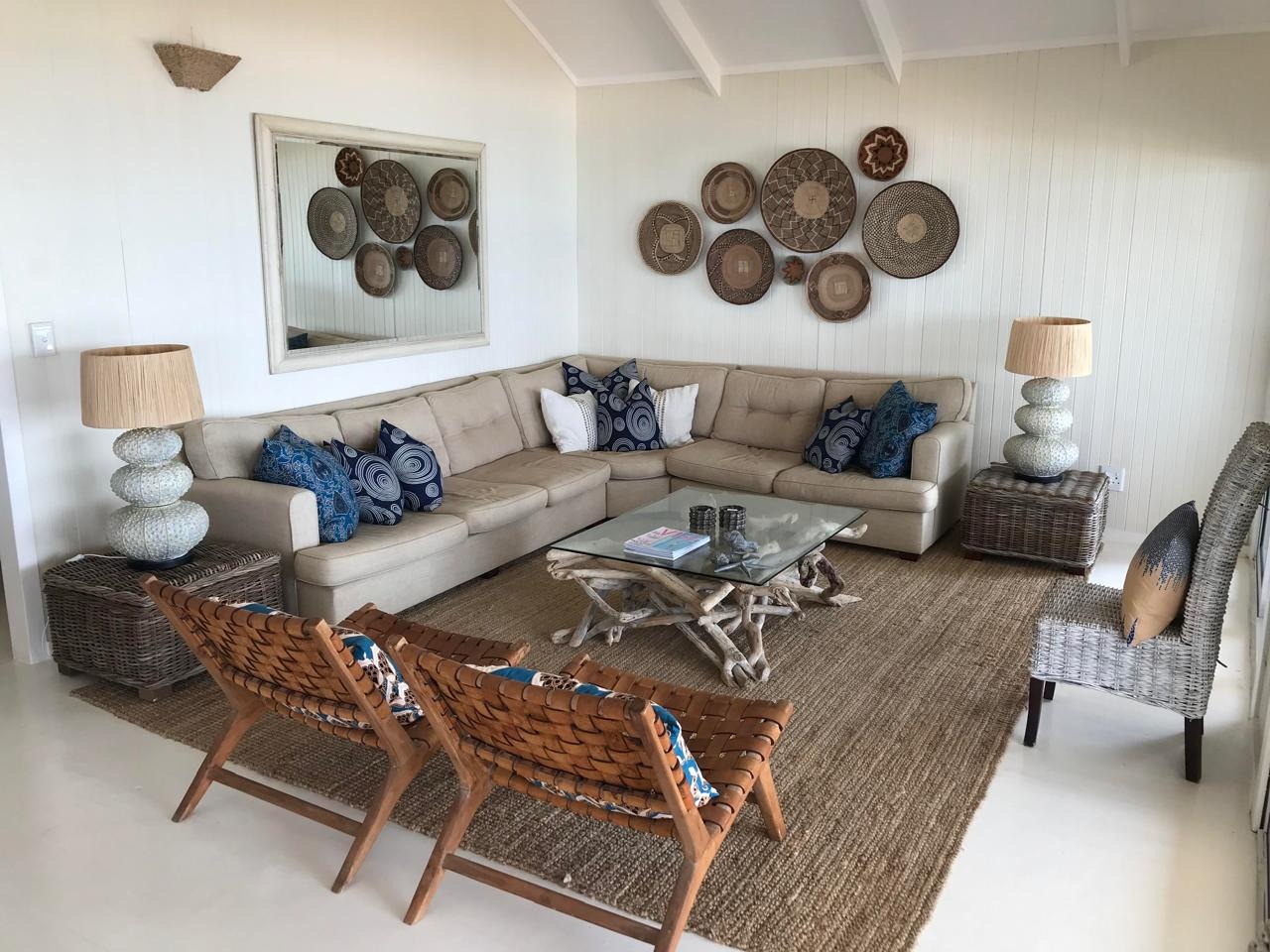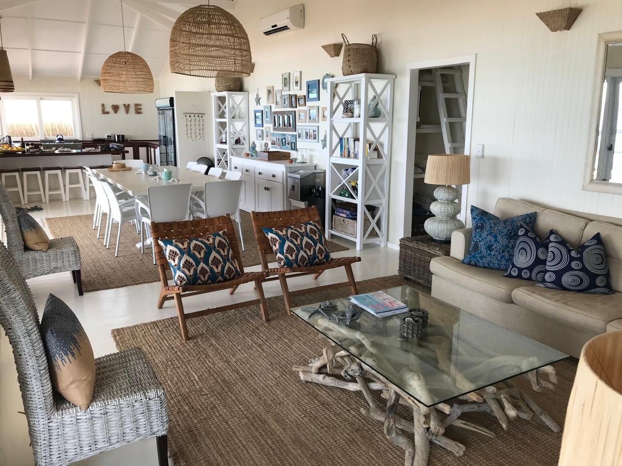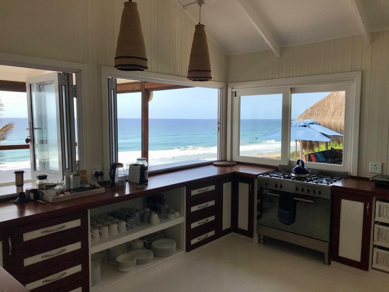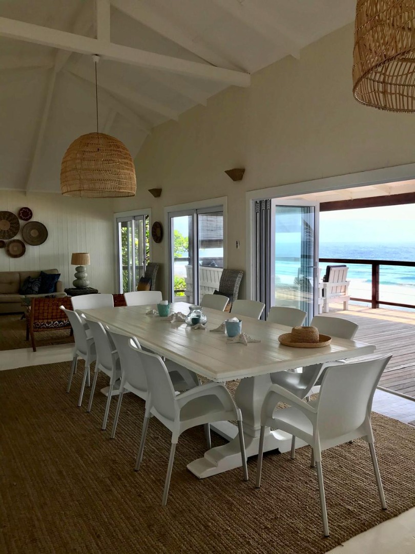 Inside, you’ll find a bright and airy open plan living space that just screams 'holiday vibes'. With high vaulted ceilings and a lovely coastal-boho design, it feels super welcoming. The kitchen is a real highlight, boasting panoramic ocean and beach views through large windows and bi-fold doors, making cooking a joy. The whole place comes fully furnished and has aircon, so you can just move in or rent it out, which is an income generating opportunity.