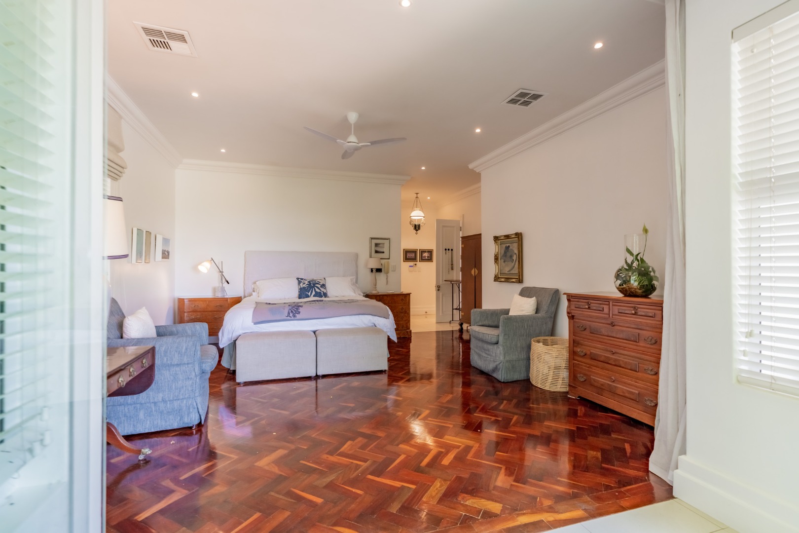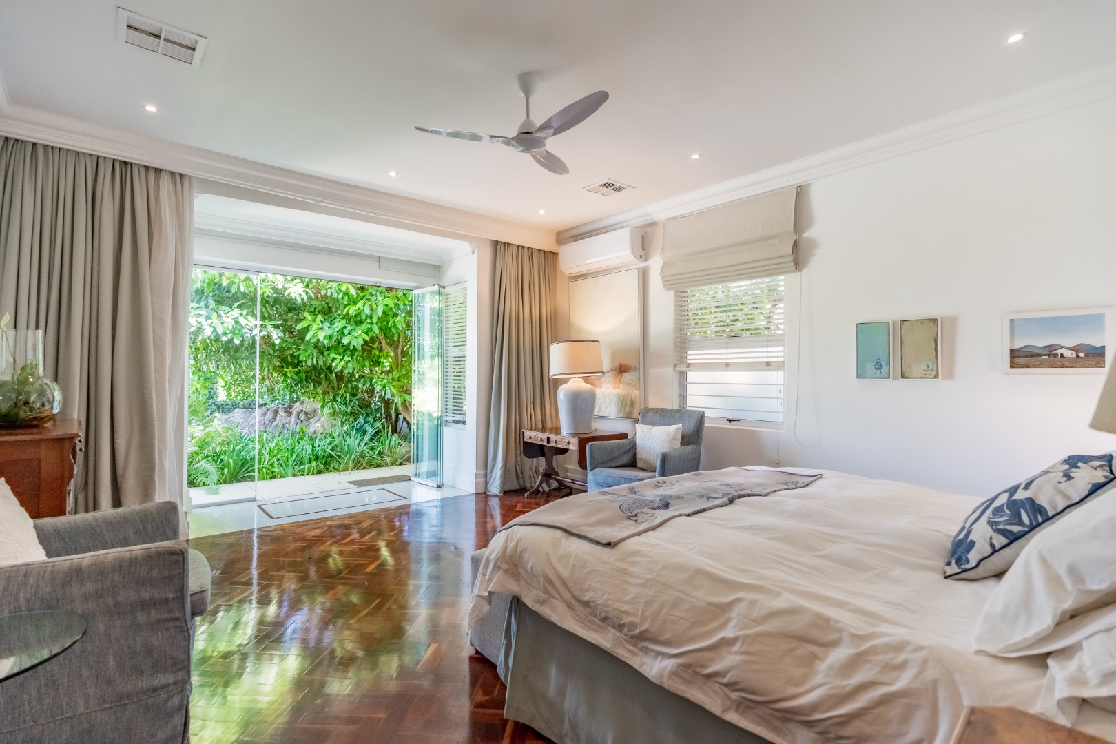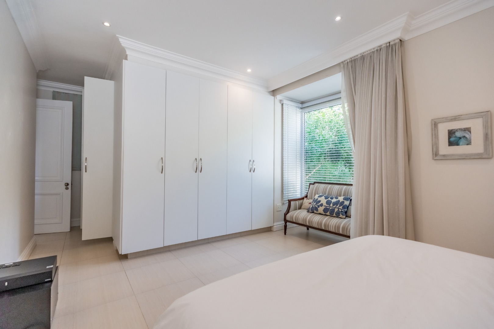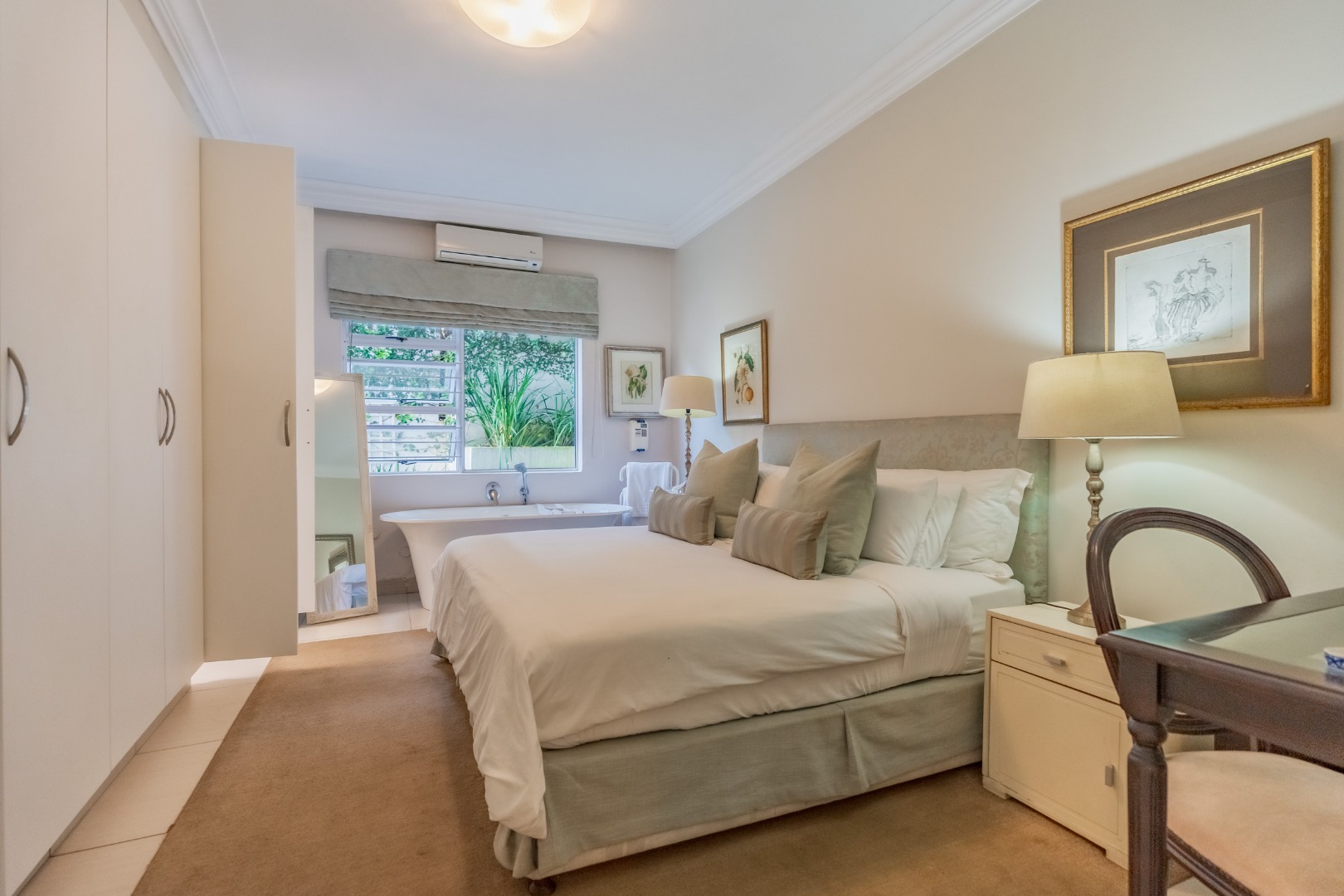 Accommodation within the main residence comprises three, en-suite bedrooms, together with a guest loo. The main bedroom is generous in scale, opening directly onto the garden, allowing greenery and filtered sea views to form part of the outlook. A walk-through dressing room fitted with bespoke cabinetry leads to a well-appointed en-suite bathroom arranged with a separate loo, freestanding bath, and glass-enclosed shower.