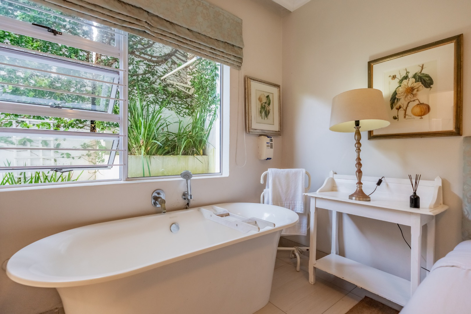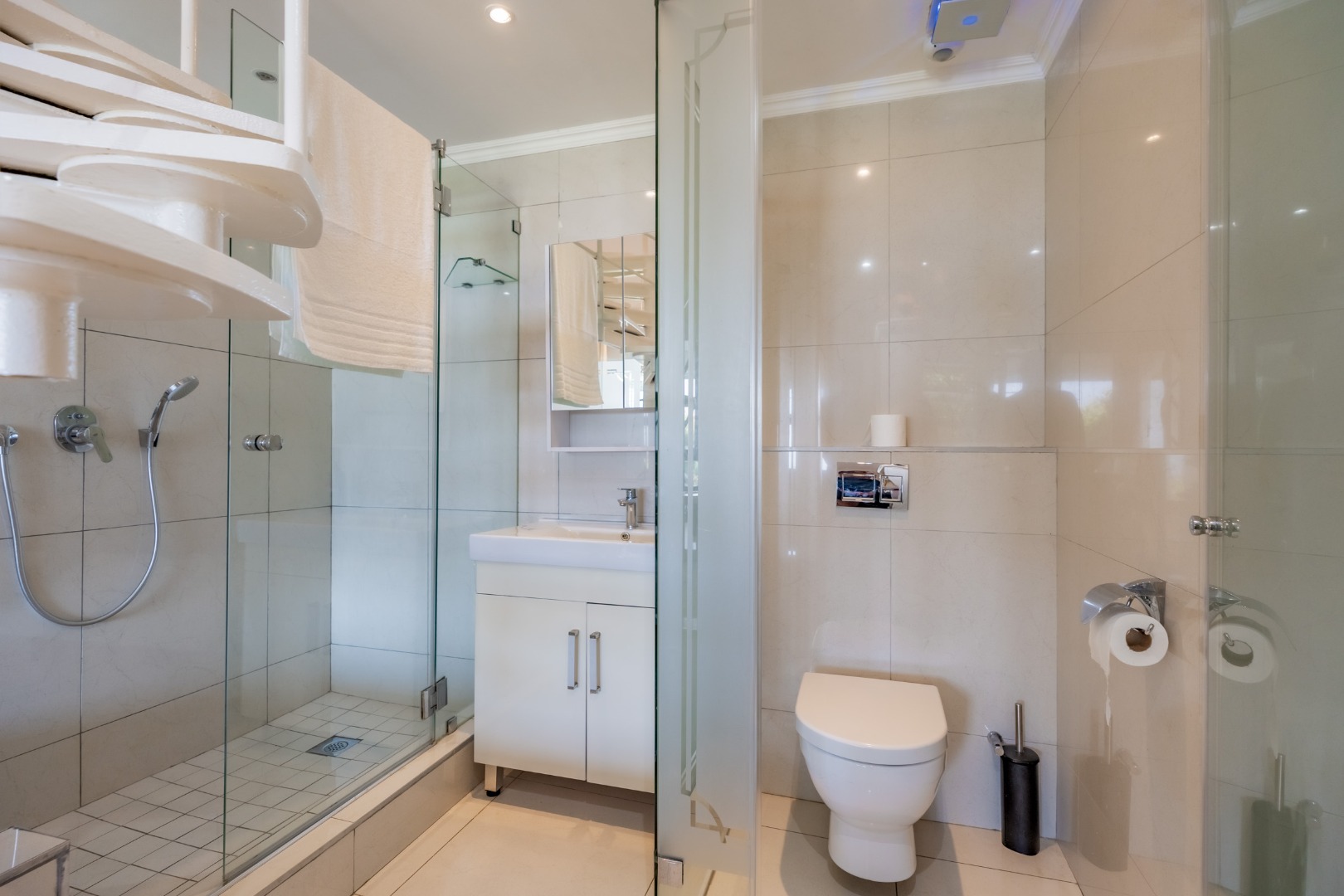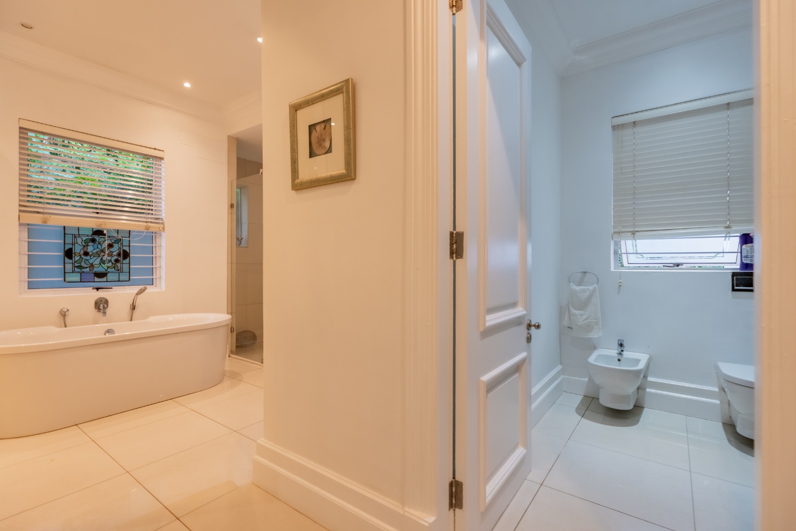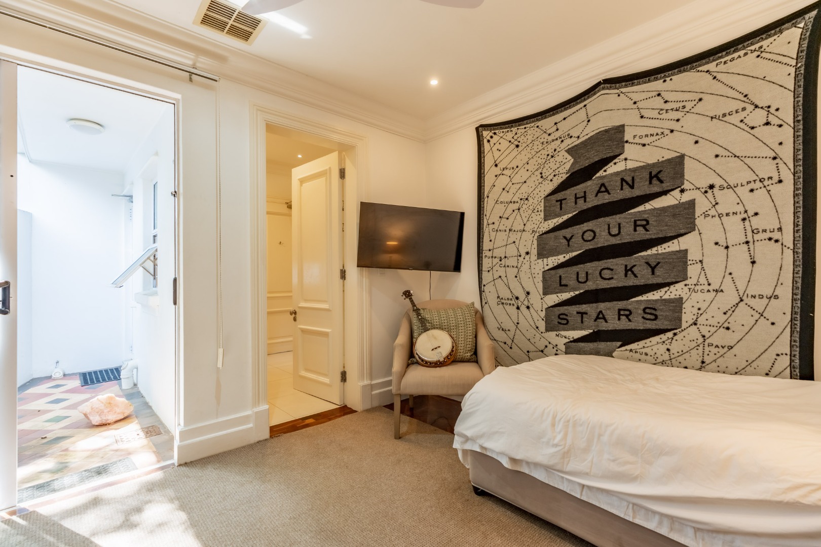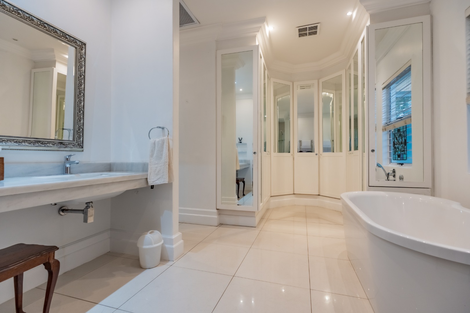 Accommodation within the main residence comprises three, en-suite bedrooms, together with a guest loo. The main bedroom is generous in scale, opening directly onto the garden, allowing greenery and filtered sea views to form part of the outlook. A walk-through dressing room fitted with bespoke cabinetry leads to a well-appointed en-suite bathroom arranged with a separate loo, freestanding bath, and glass-enclosed shower.