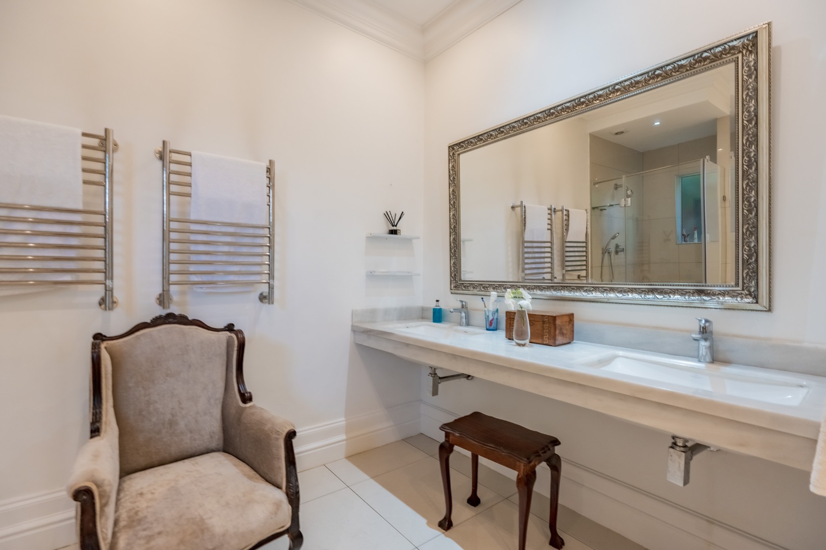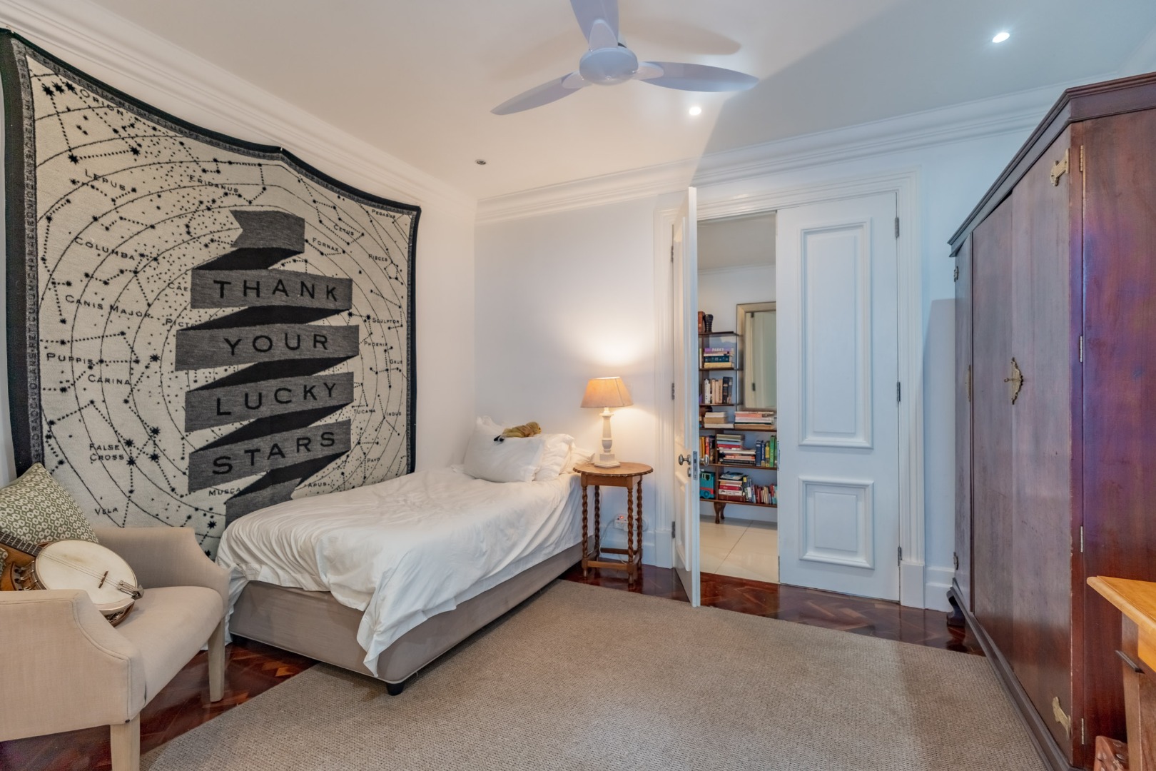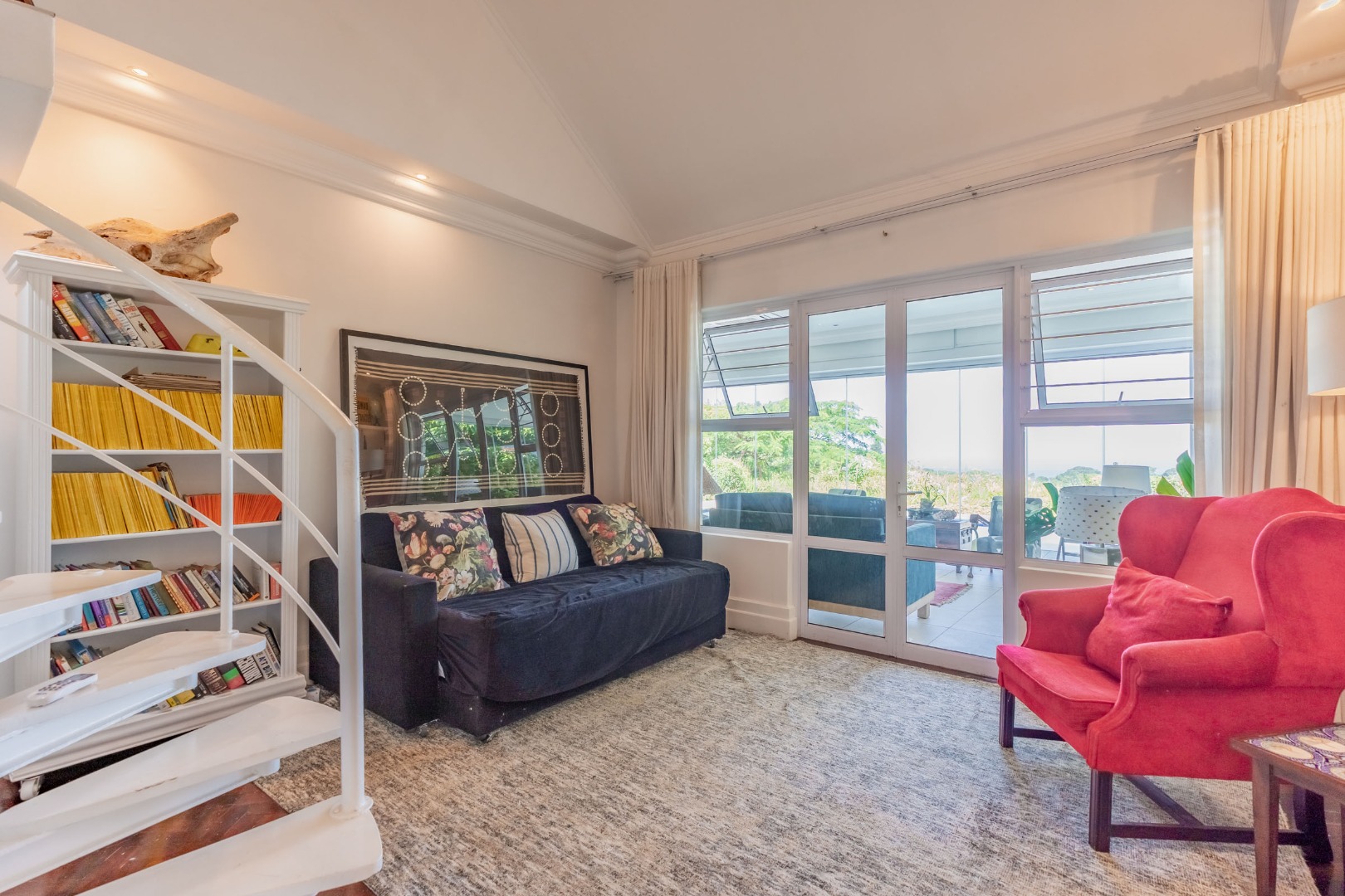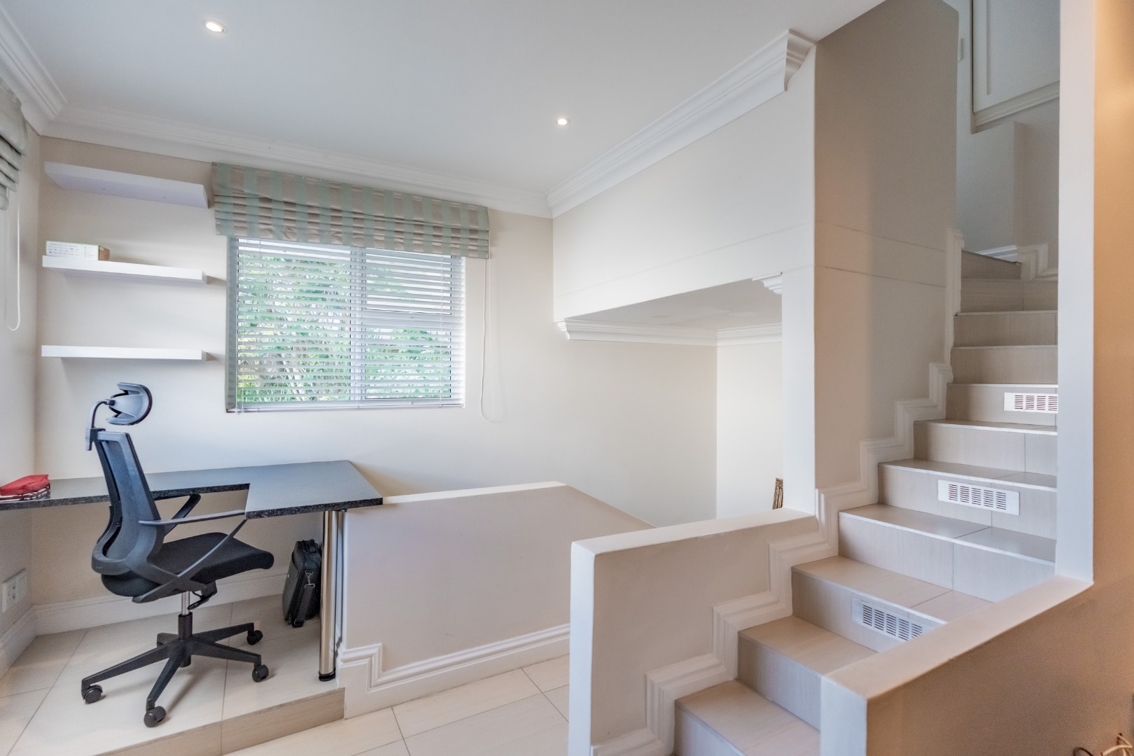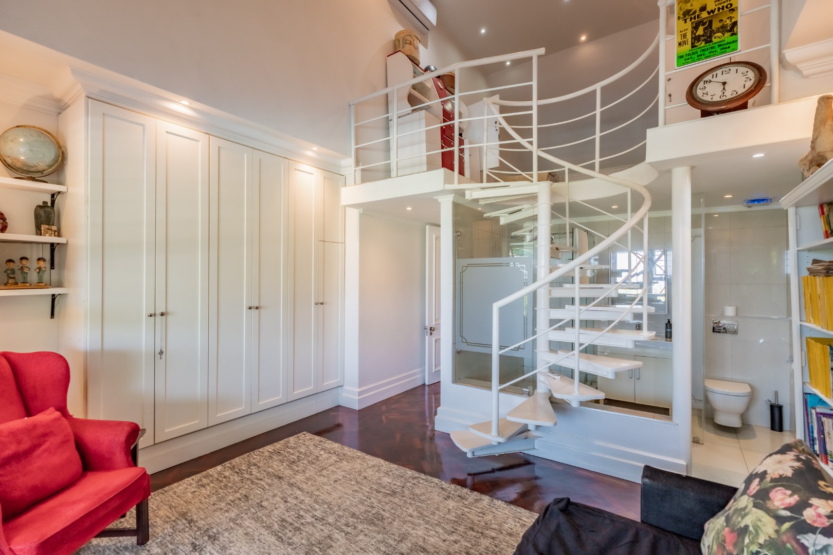 The remaining bedrooms are well proportioned and carefully considered. One is arranged in a loft-style configuration, featuring a private lounge below and a spiral staircase leading to the sleeping area above, making it ideally suited to a teenager or guest suite. The third bedroom is quietly positioned, comfortably sized, and complete with its own en-suite bathroom.