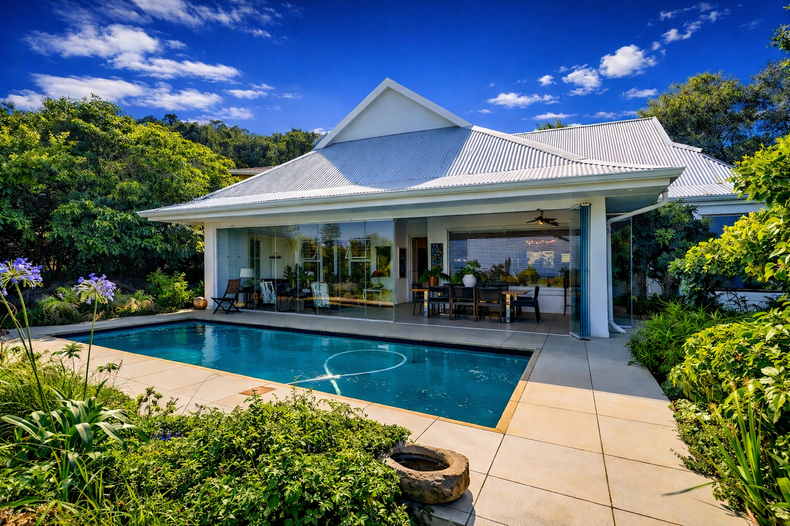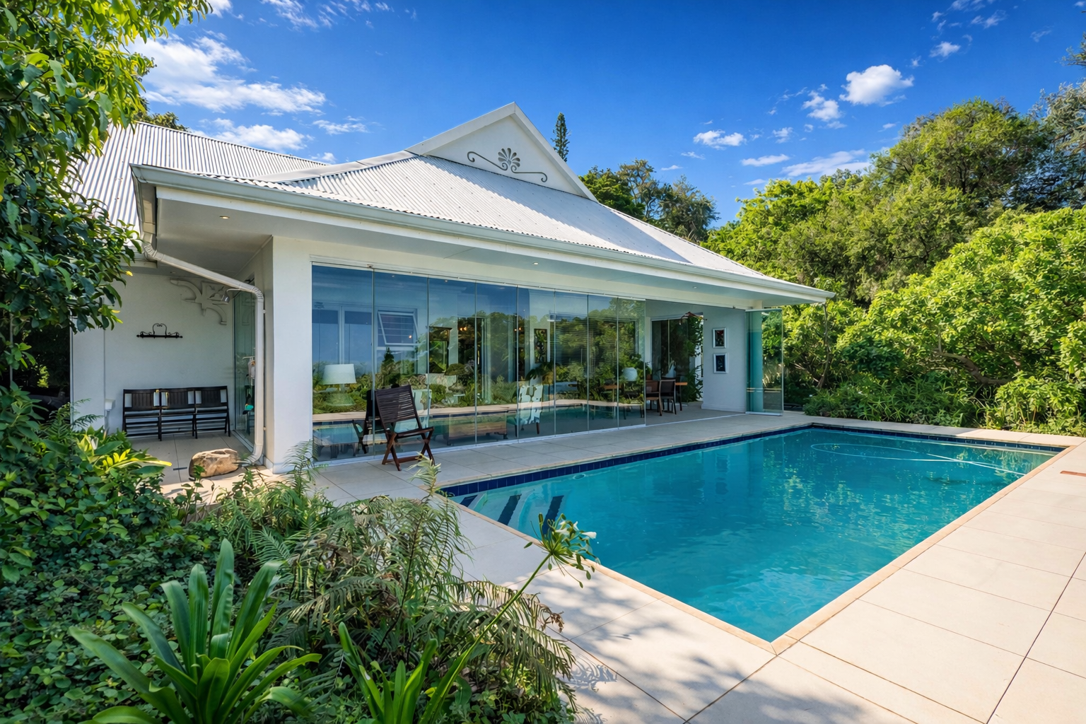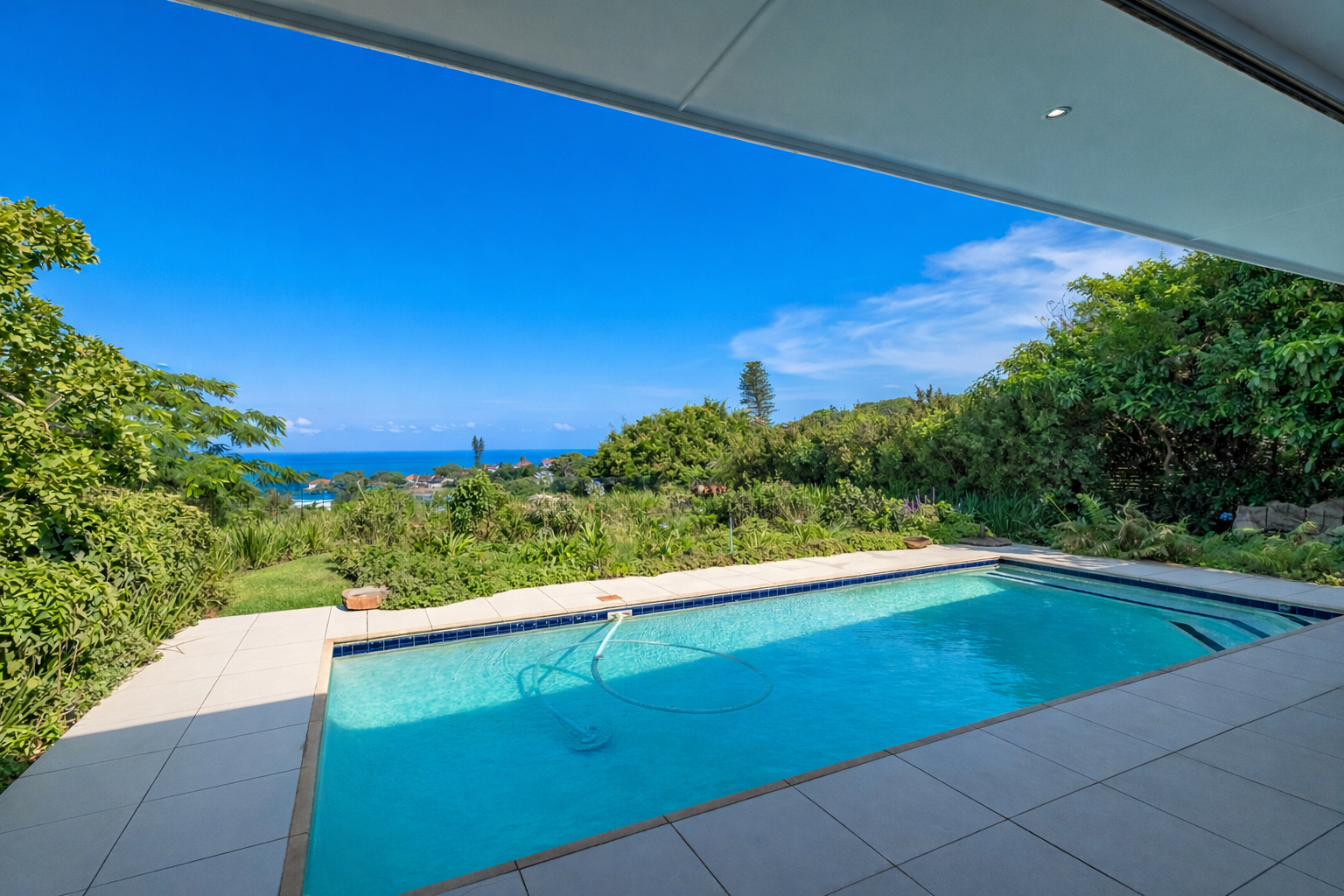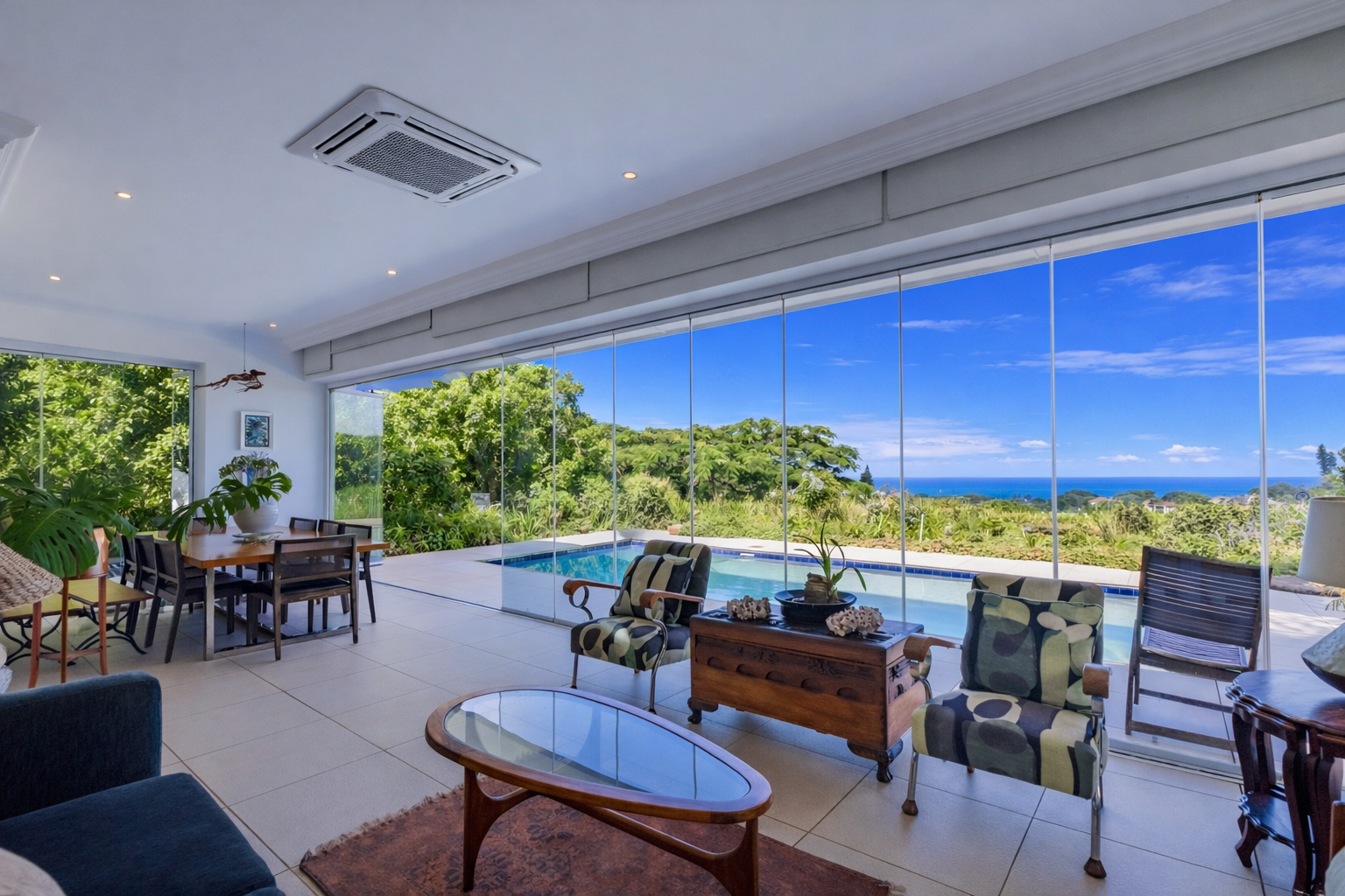 A formal entrance sets the tone, leading through gracious double doors into expansive living spaces where the lounge and dining room unfold with effortless cohesion. These areas transition naturally into a secondary lounge or sun lounge. Seamless glass stacking doors enclose the verandah and open directly onto the decked pool area and established garden beyond. From this vantage point, the outlook extends toward the ocean, creating a constant visual dialogue between indoor living and the surrounding landscape.