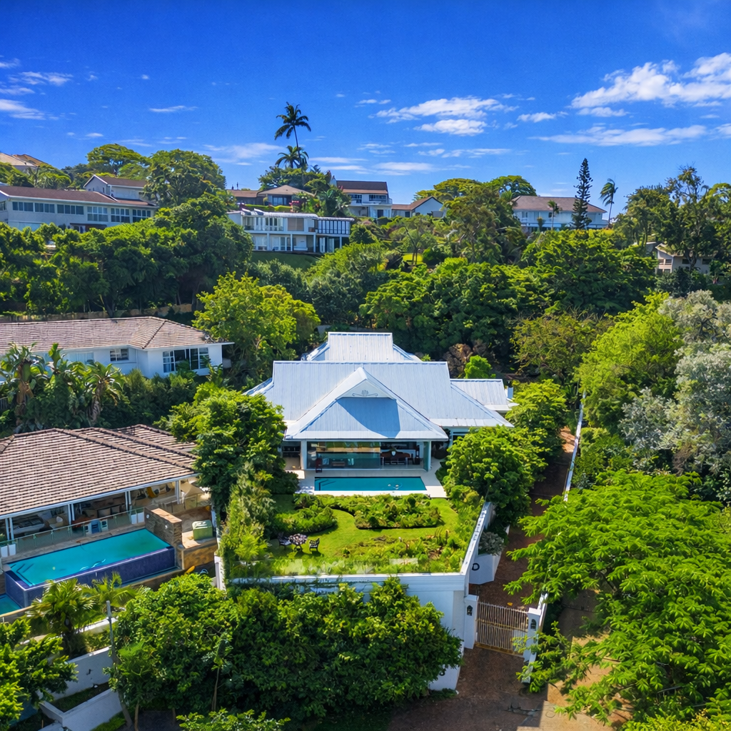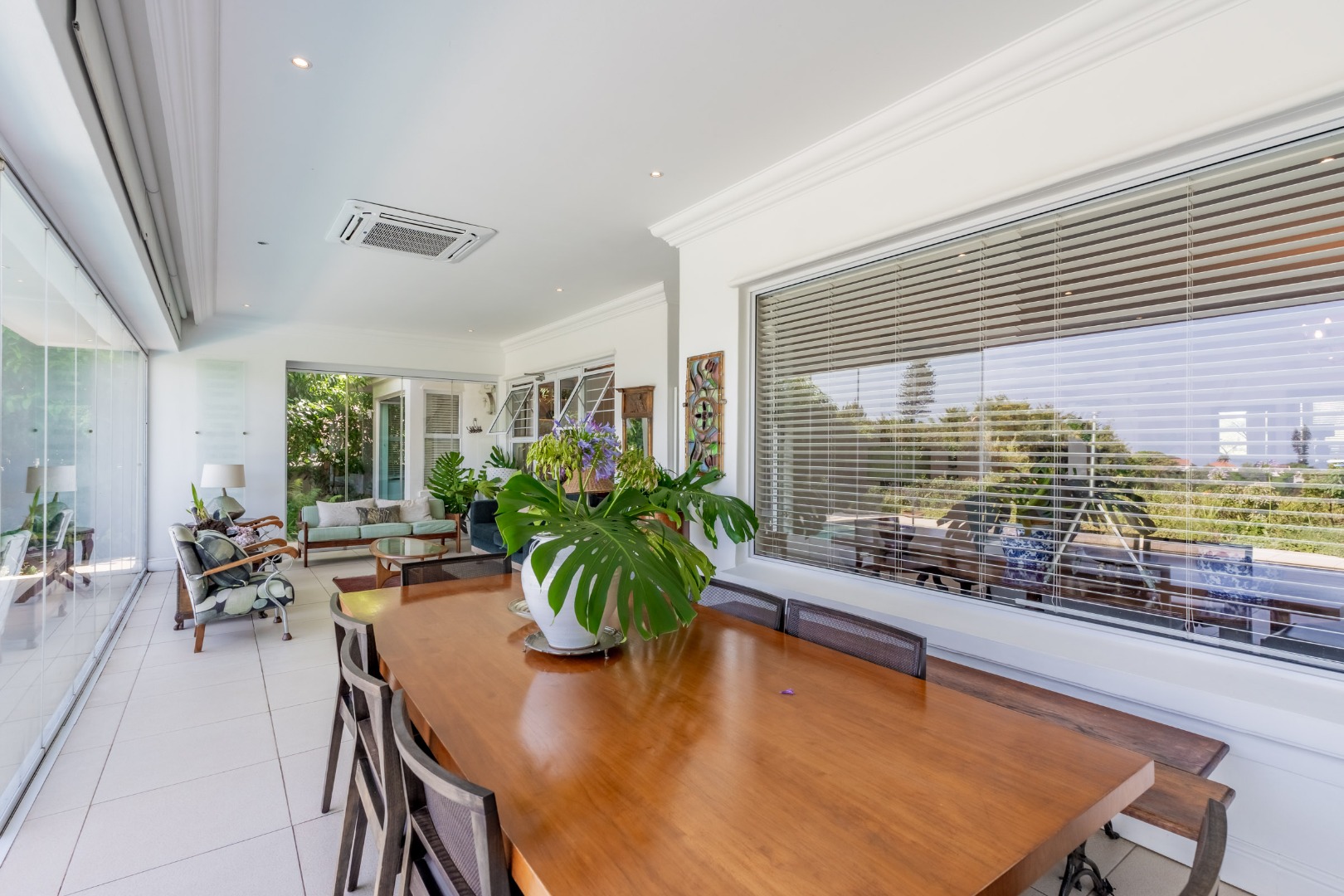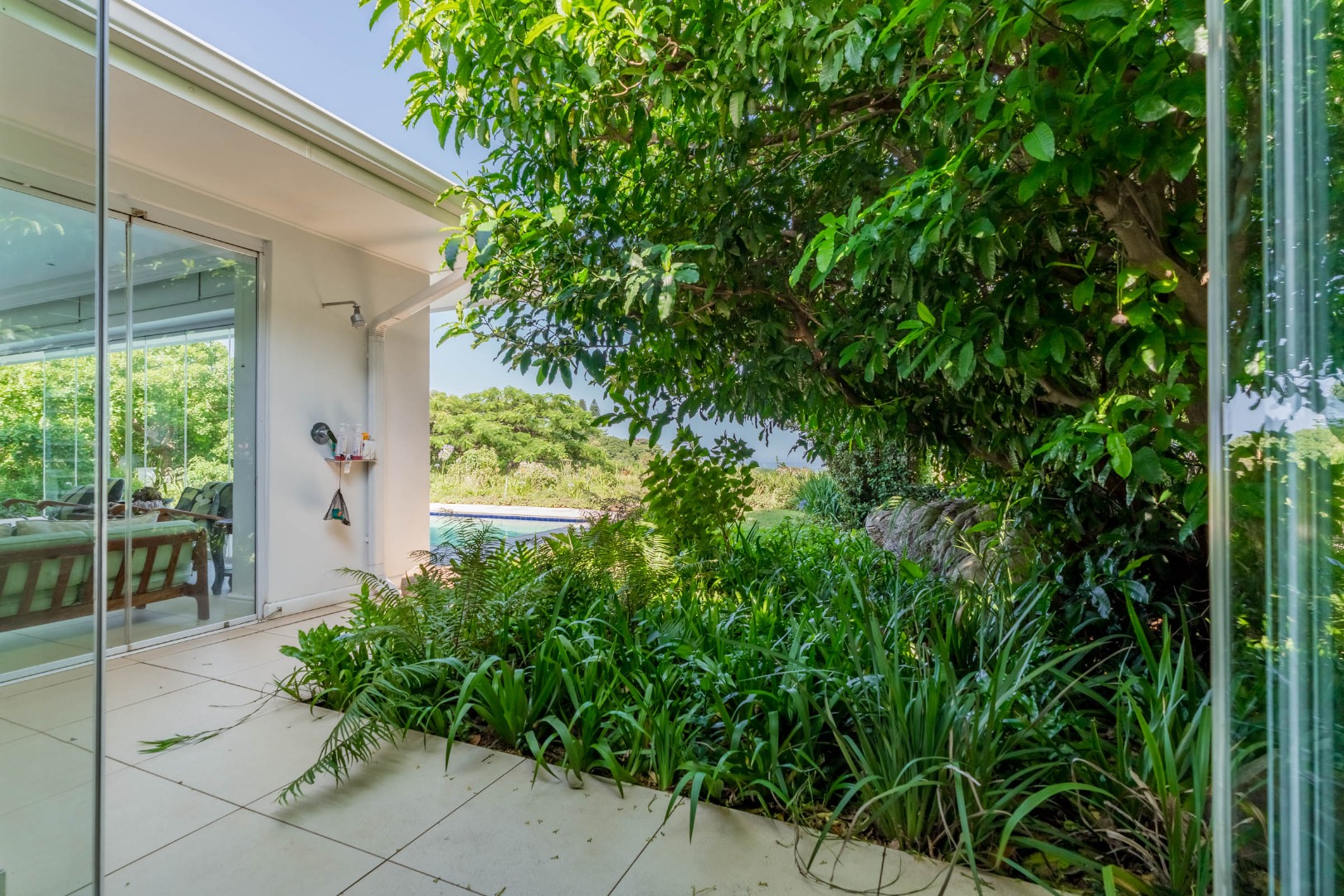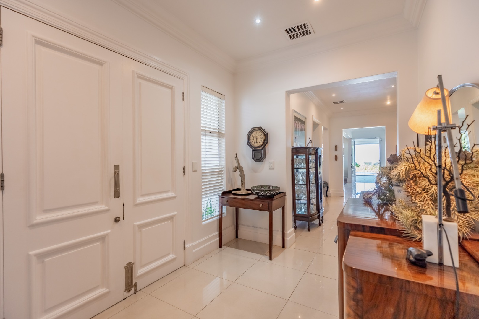 A formal entrance sets the tone, leading through gracious double doors into expansive living spaces where the lounge and dining room unfold with effortless cohesion. These areas transition naturally into a secondary lounge or sun lounge. Seamless glass stacking doors enclose the verandah and open directly onto the decked pool area and established garden beyond. From this vantage point, the outlook extends toward the ocean, creating a constant visual dialogue between indoor living and the surrounding landscape.