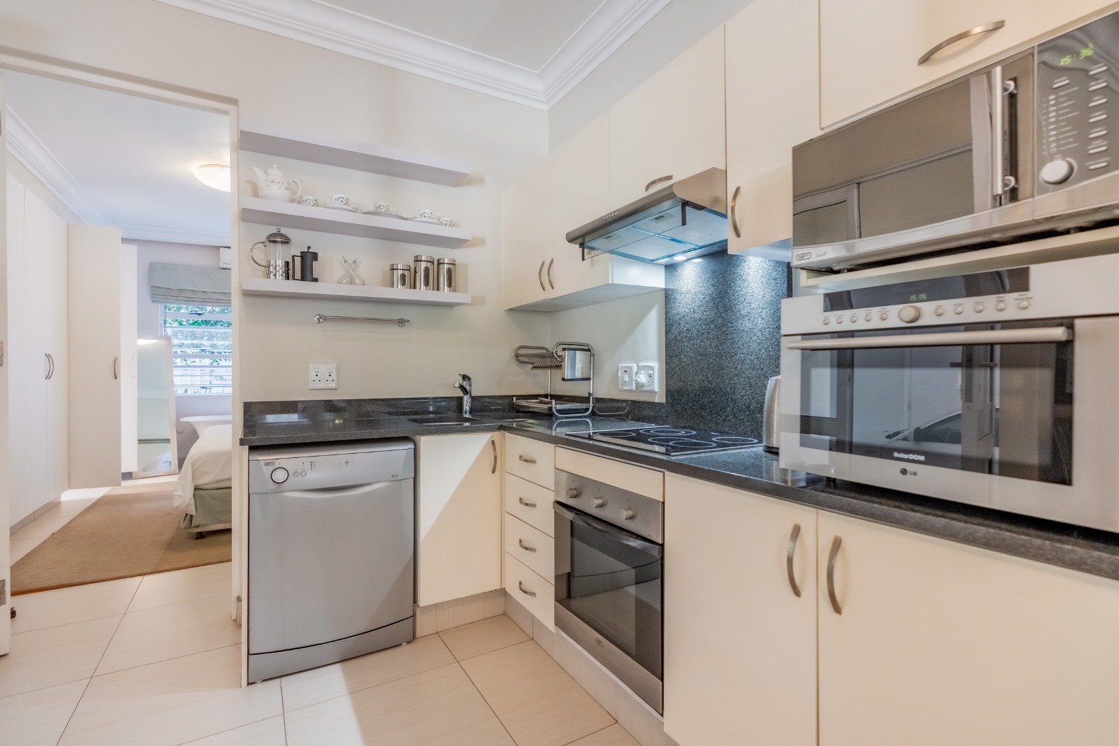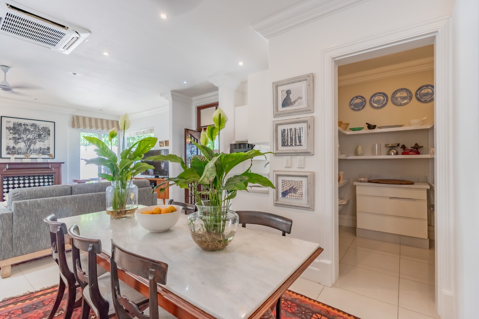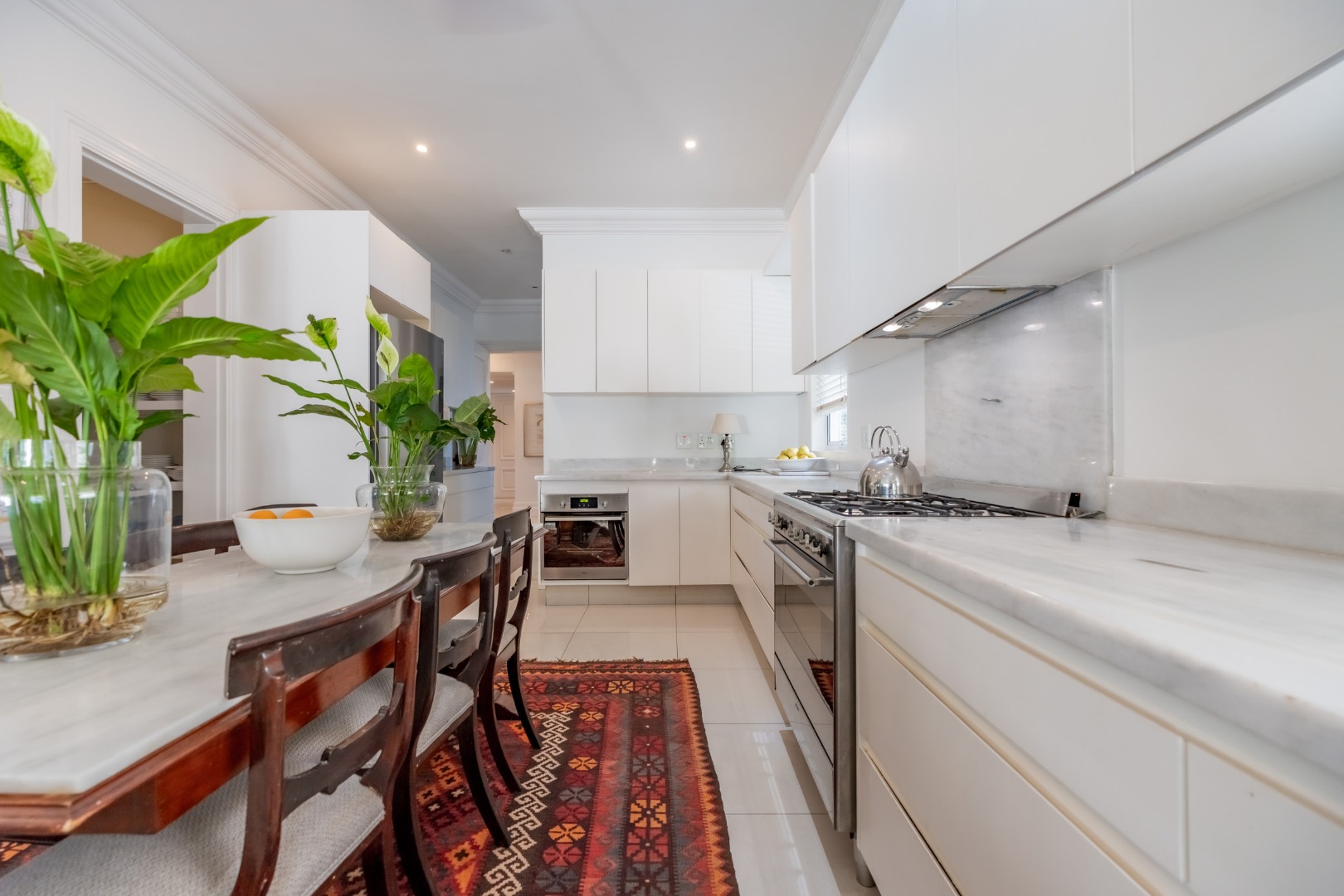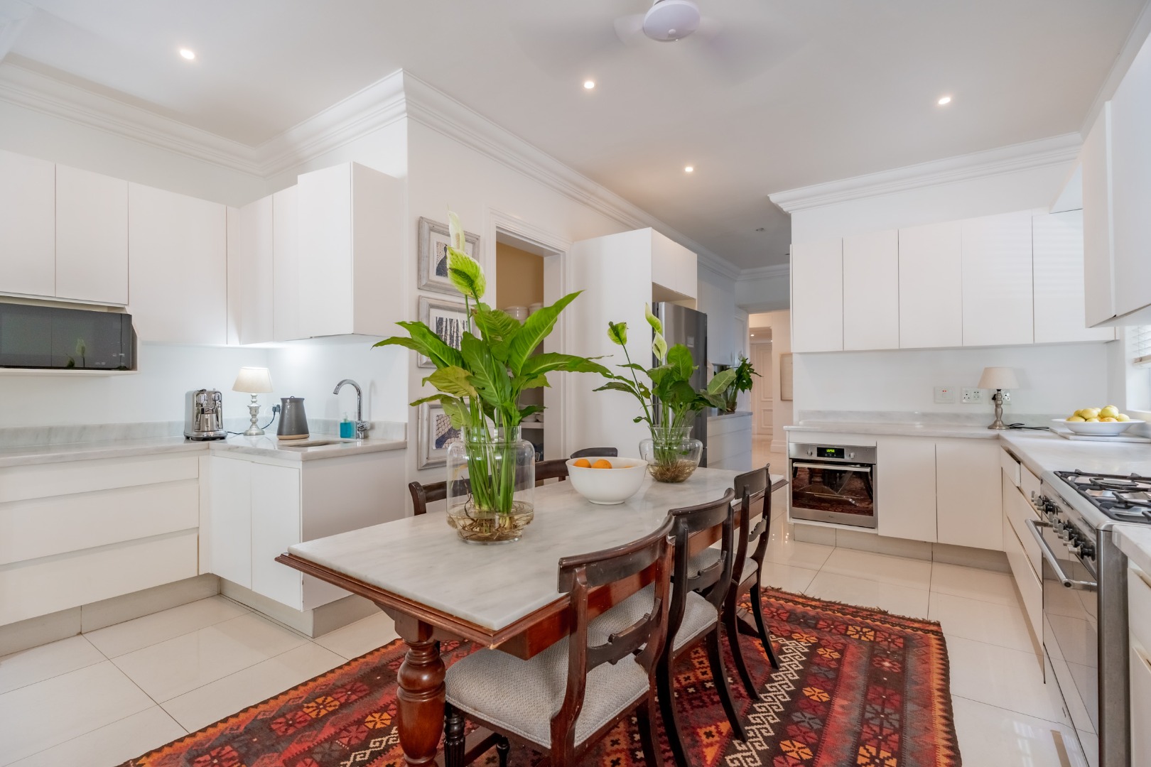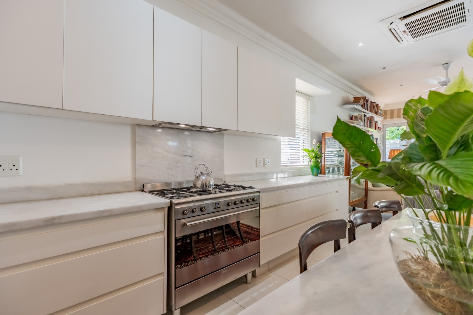 The kitchen is positioned to integrate seamlessly with the living areas and is designed to support both everyday living and entertaining. Generous cabinetry and preparation surfaces are complemented by a walk-in pantry and separate scullery, while a freestanding SMEG gas cooker forms a refined focal point, supported by an electric undercounter oven.
