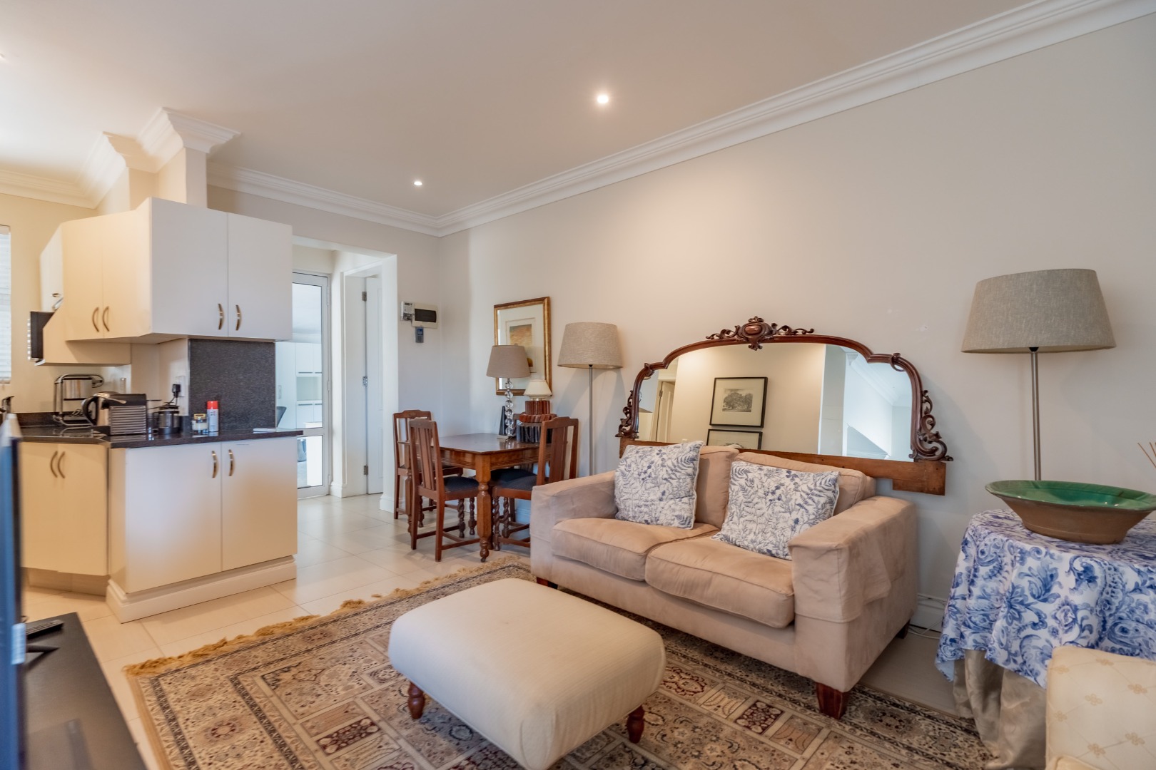 Beyond the main residence, the property offers two self-contained flatlets. The first flatlet is positioned above the main house and may be accessed internally from the entrance foyer or externally via the office or garage. It comprises an open-plan lounge and dining area, a granite-finished kitchen, a main en-suite bedroom, and an additional half-bedroom with steps leading to an open loft-style sleeping area.