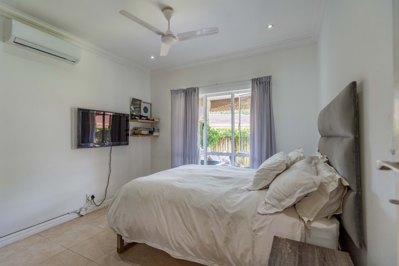 Flowing off the living areas are three well-proportioned bedrooms plus mes, and a family bathroom. Each bedroom is fitted with split air-conditioning and generous cupboard space. The main suite includes a full en-suite bathroom, abundant storage, and glass doors that open onto the covered patio, creating a calm and private retreat.