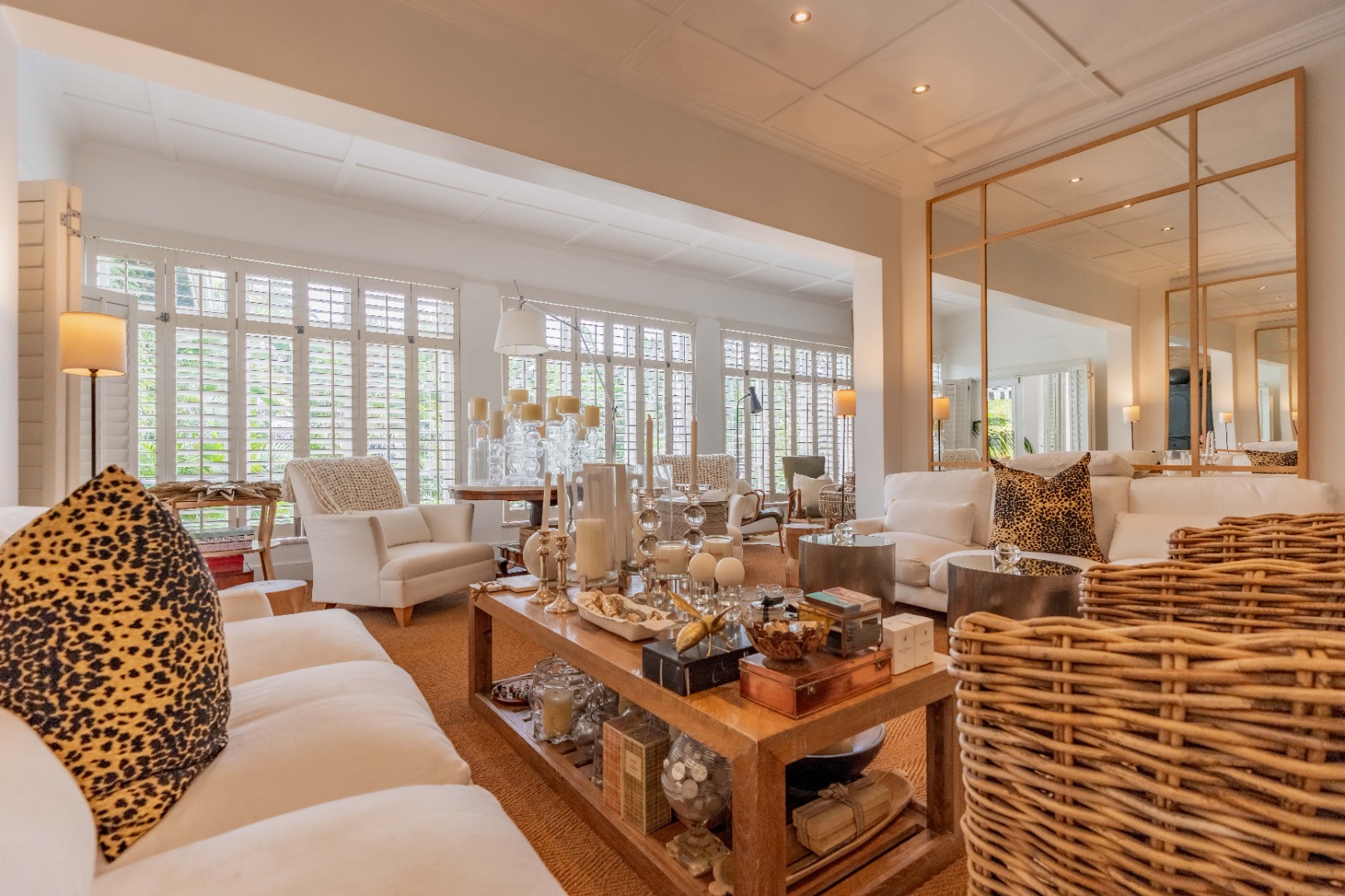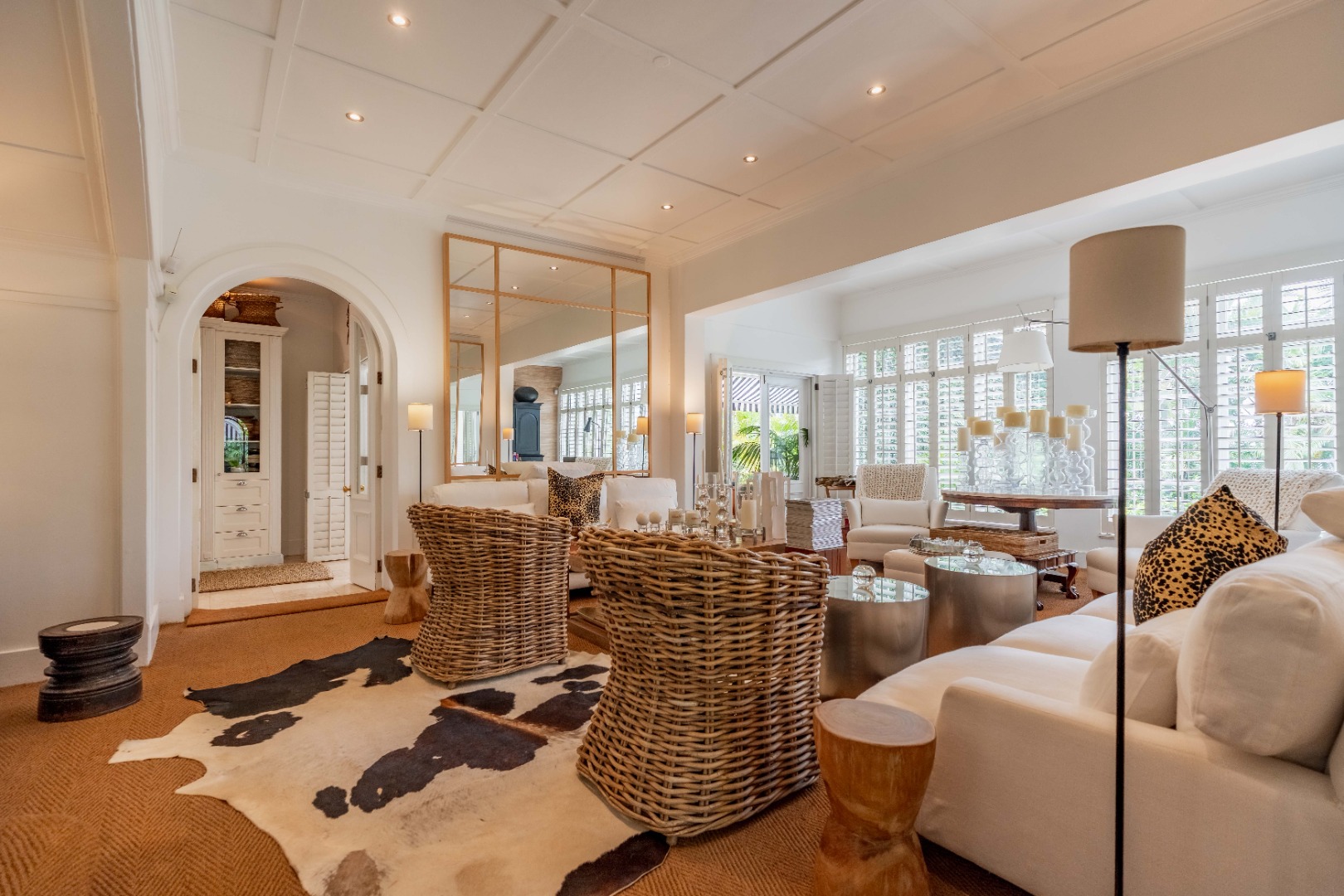 Multiple voluminous living areas flow in perfect symmetry, bathed in natural light and wrapped in a soft neutral palette. The formal lounge and dining spaces are elegant and gracious, detailed with mirrors, plantation shutters, and decorative pillars. Beyond, the family lounge, casual dining zone, and kitchen connect in harmonious rhythm, flowing out through French doors to the covered patio overlooking the sparkling pool.
