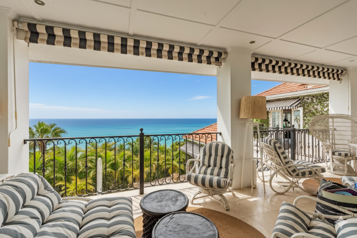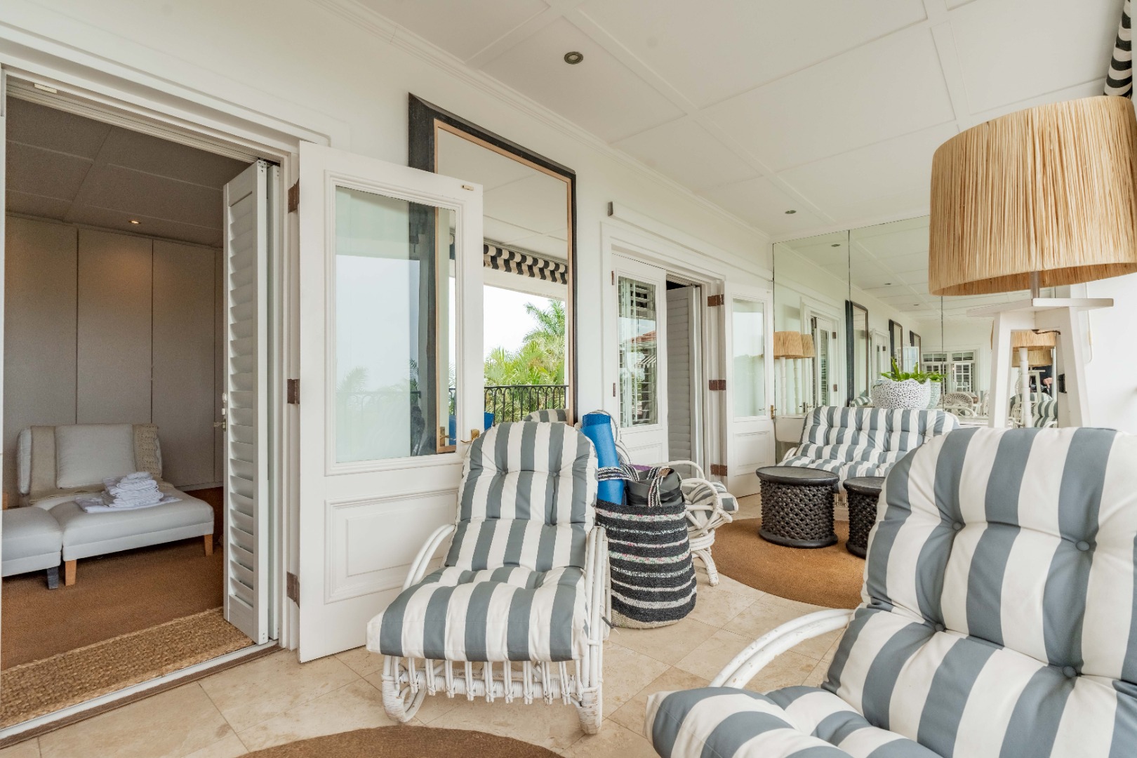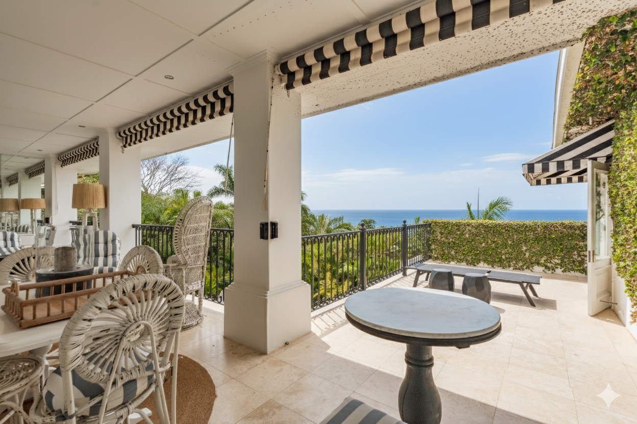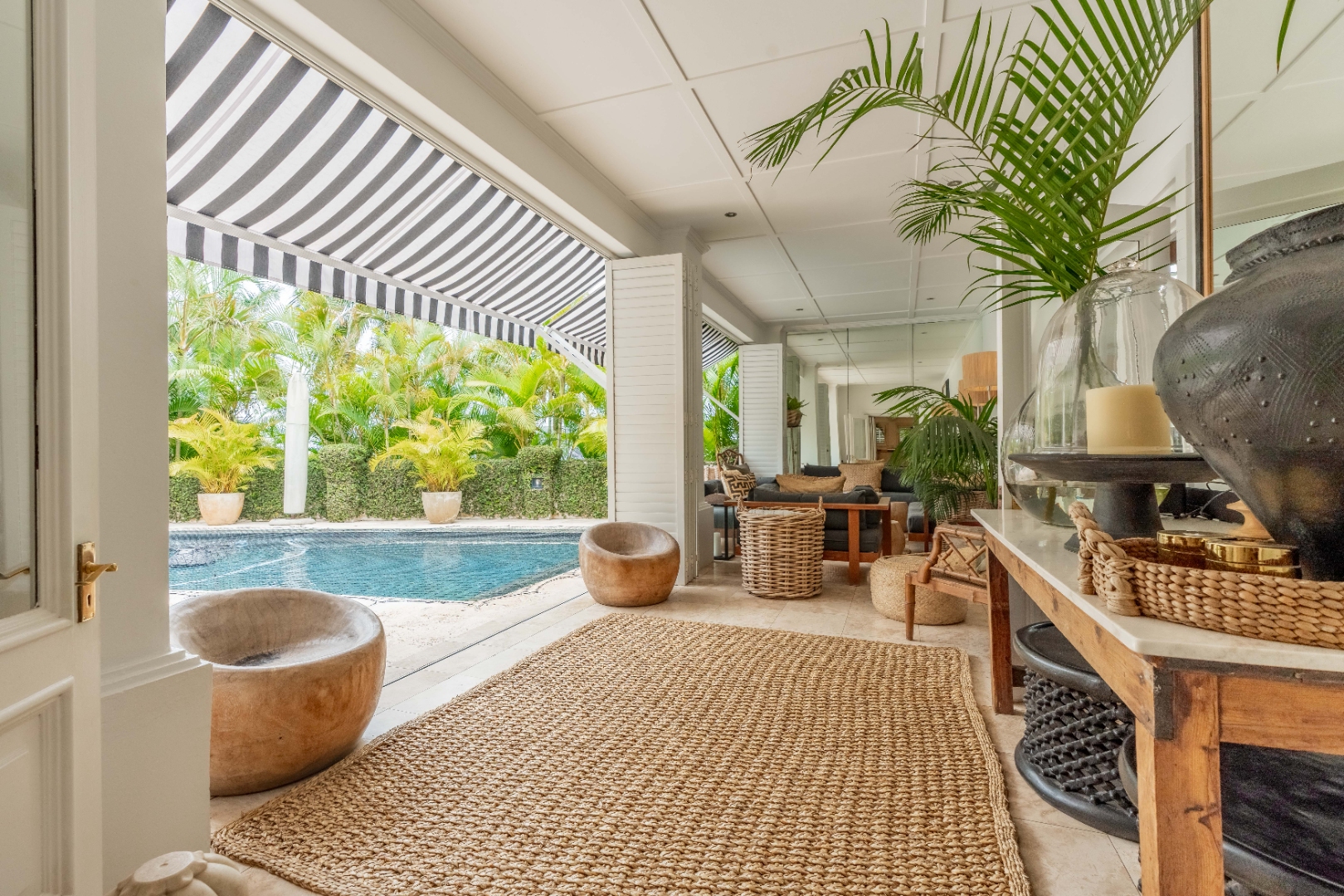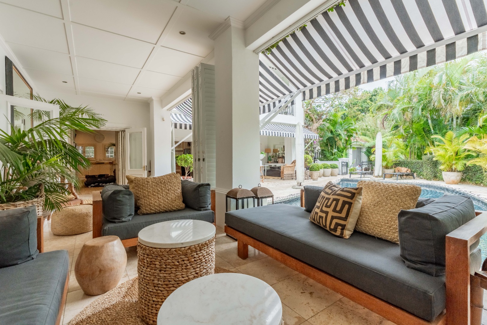 Outdoors, expansive verandahs wrap around the pool, framed by classic columns and striped awnings. These shaded terraces offer tranquil all-weather living with views of the tropical gardens and distant sea, creating an atmosphere of calm sophistication.