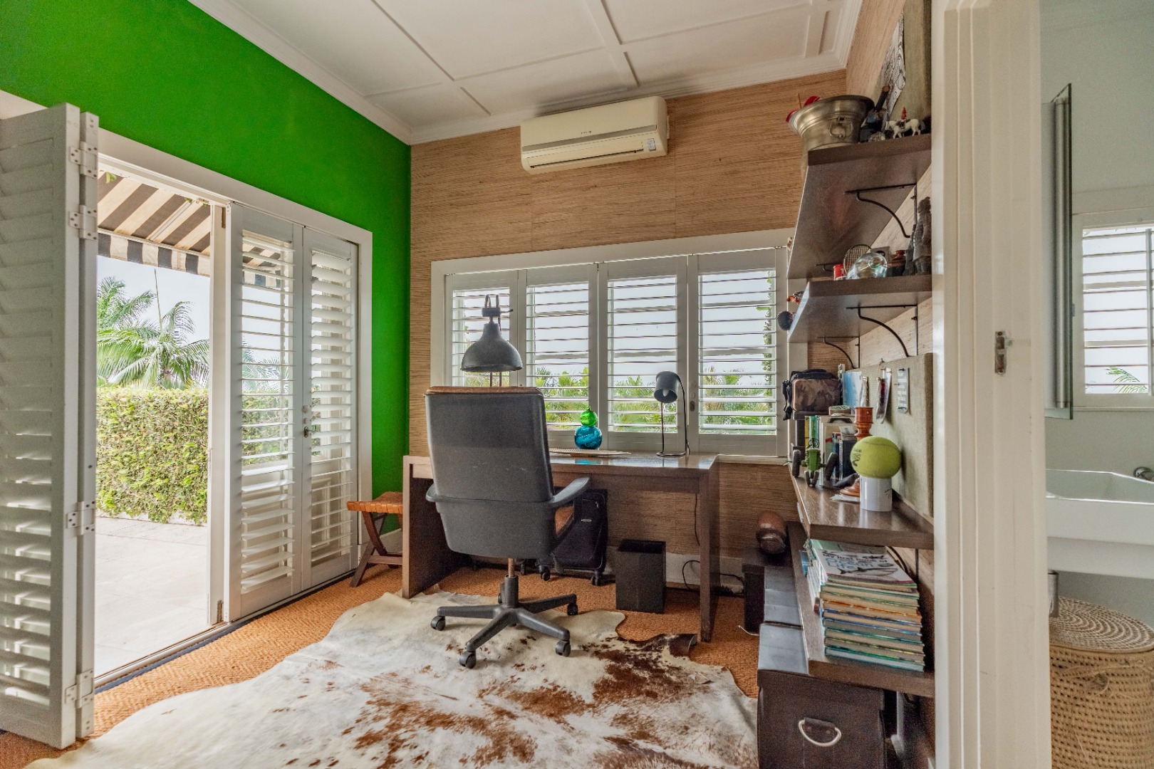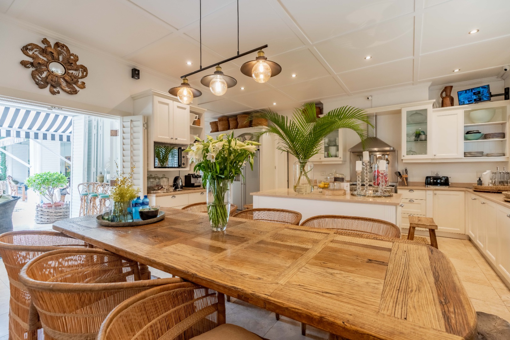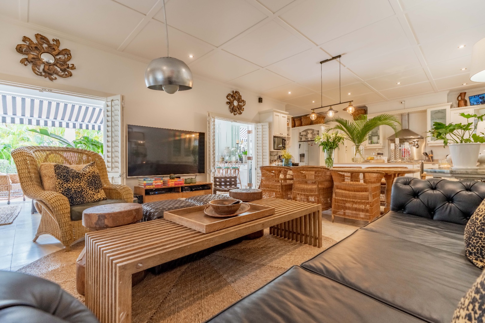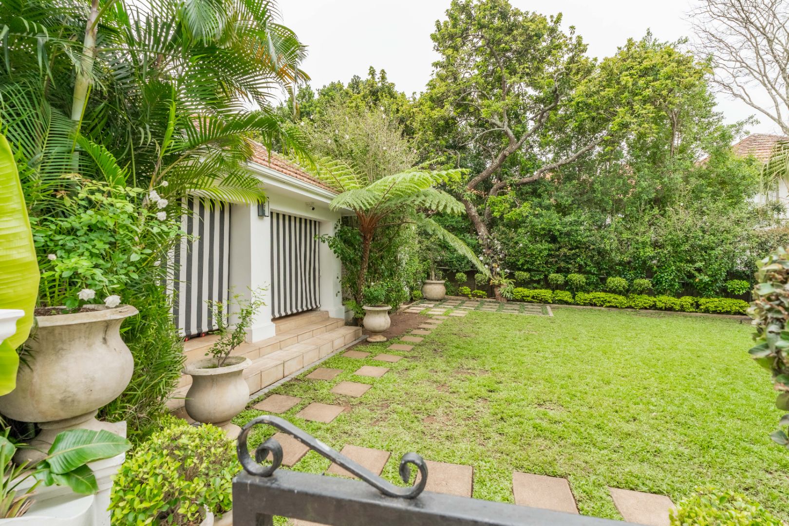 Outdoors, expansive verandahs wrap around the pool, framed by classic columns and striped awnings. These shaded terraces offer tranquil all-weather living with views of the tropical gardens and distant sea, creating an atmosphere of calm sophistication.