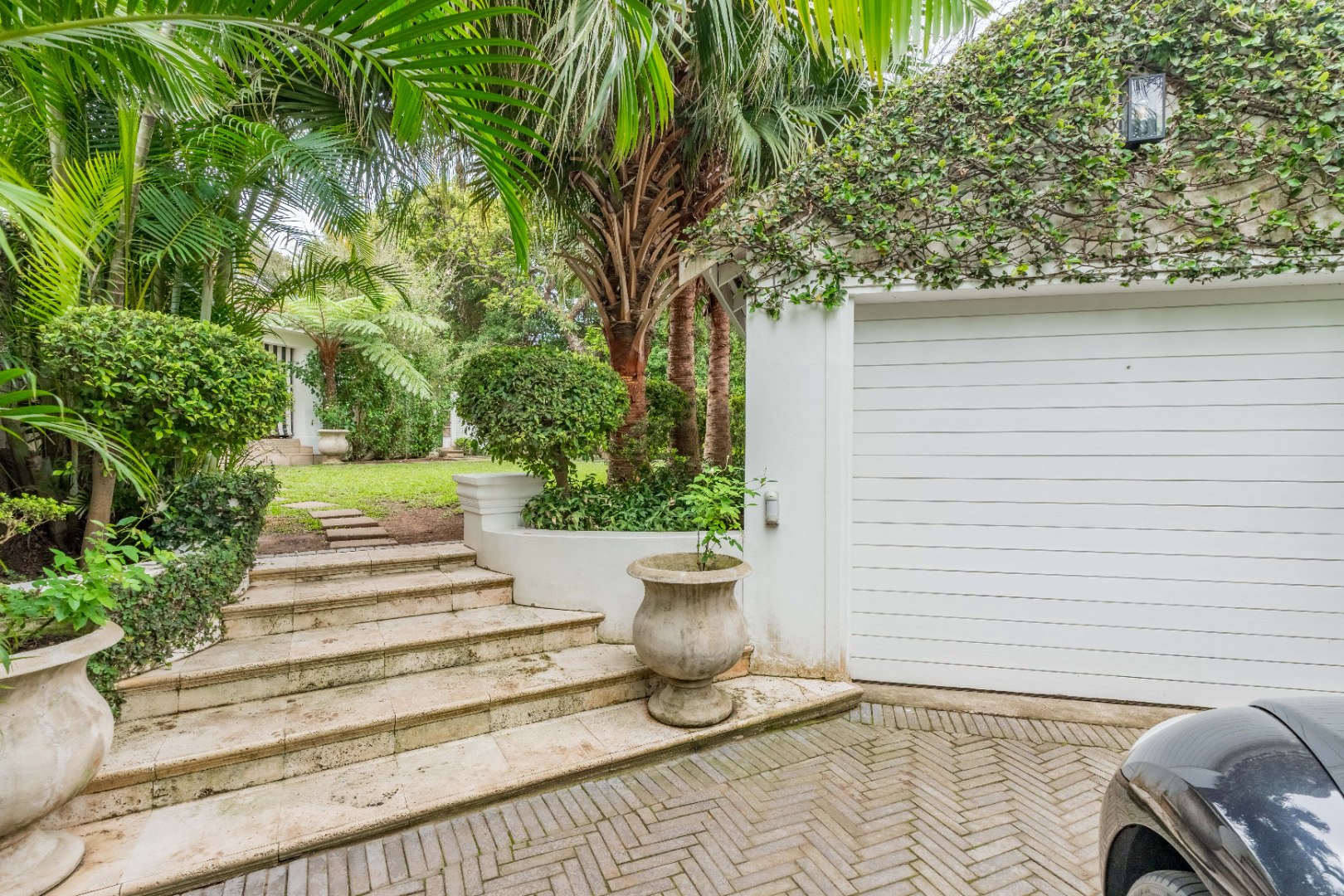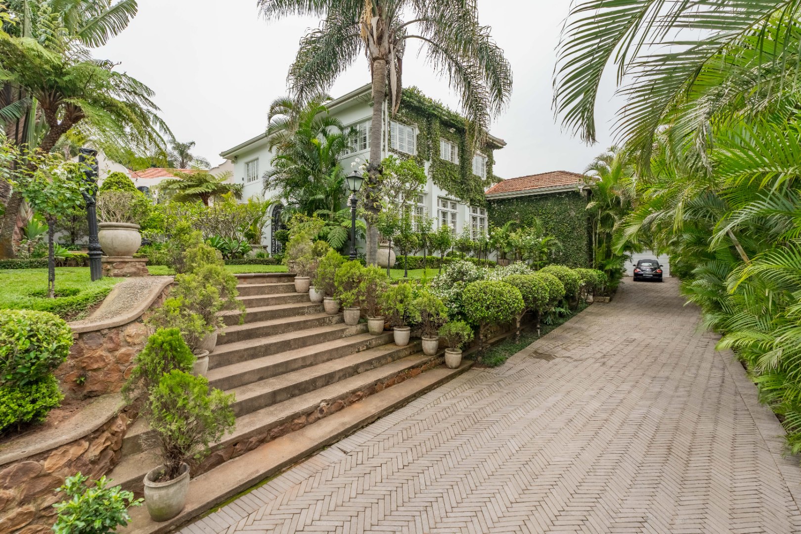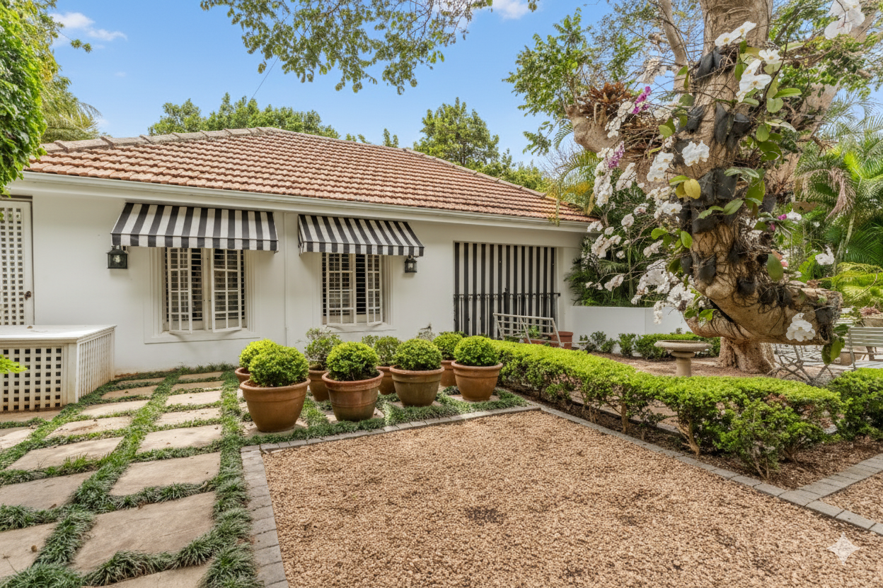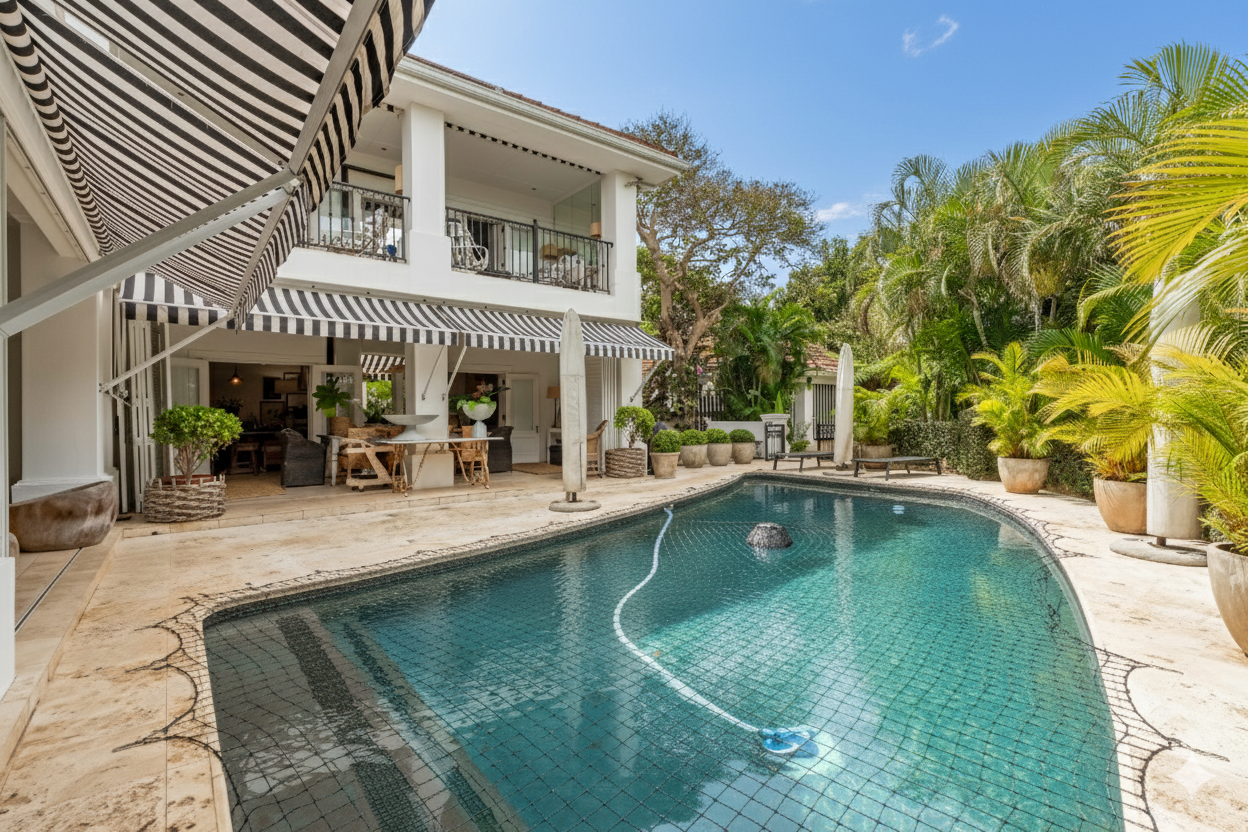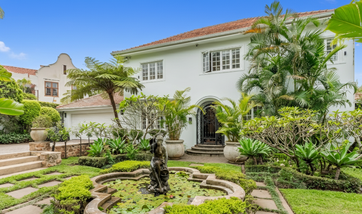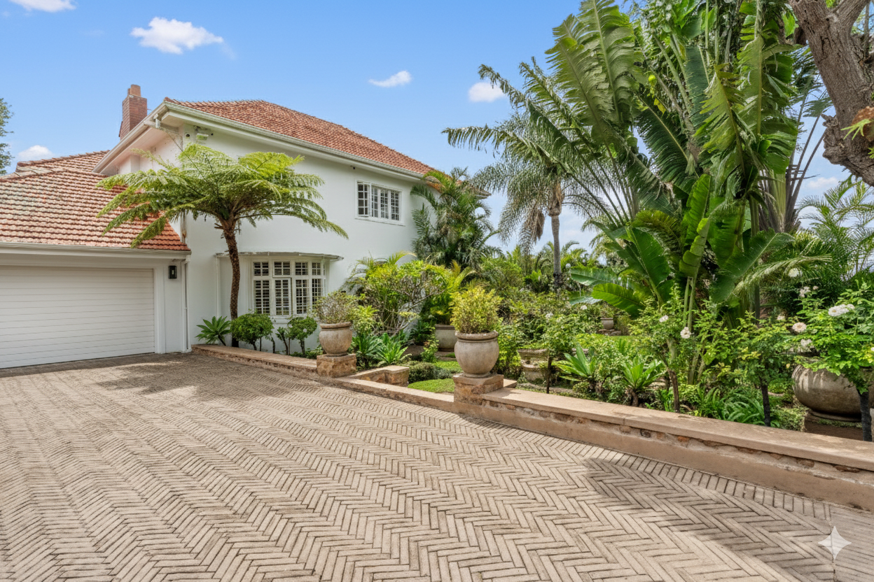 Privacy and security are paramount, set behind dual driveways lined with majestic palms, this stately home offers ample off-street parking and a sense of exclusivity rarely found in upper Durban North. The cobblestone driveway, ivy-clad façade, and manicured gardens immediately set the tone for sophistication and grandeur.