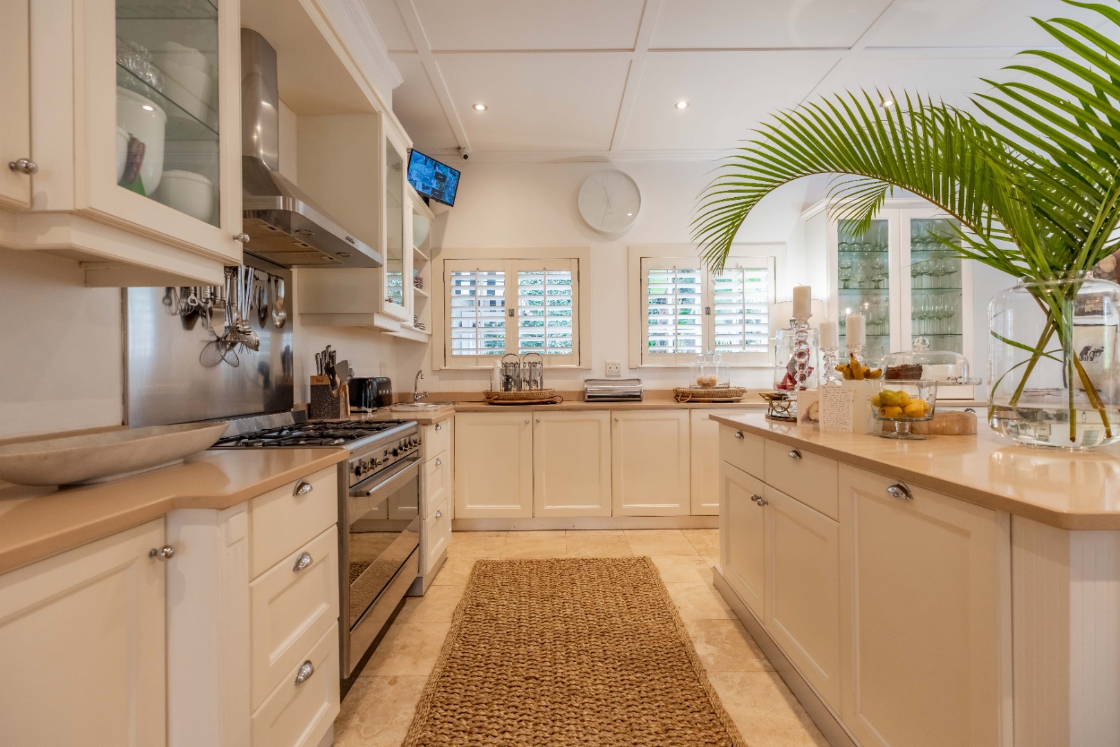 The bespoke kitchen is a statement of design, finished with Caesarstone countertops, double ovens, gas hob, and a walk-in pantry. A dedicated dining and lounge area within the kitchen enhances its social charm, while the large adjoining scullery with workstation and laundry maintains its polished aesthetic.
