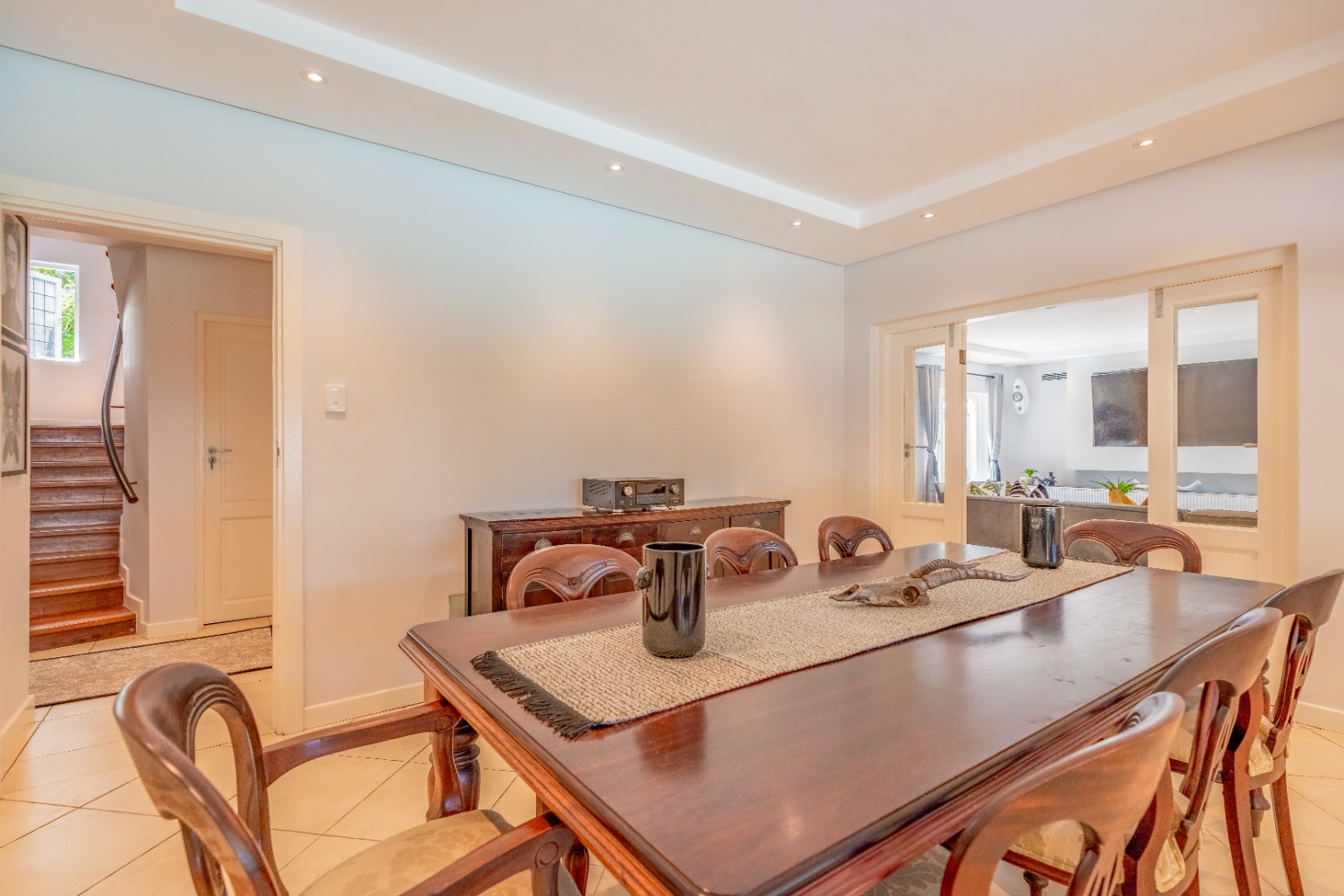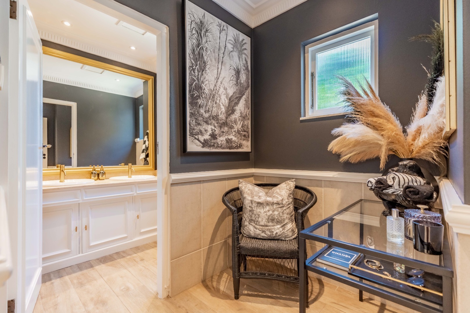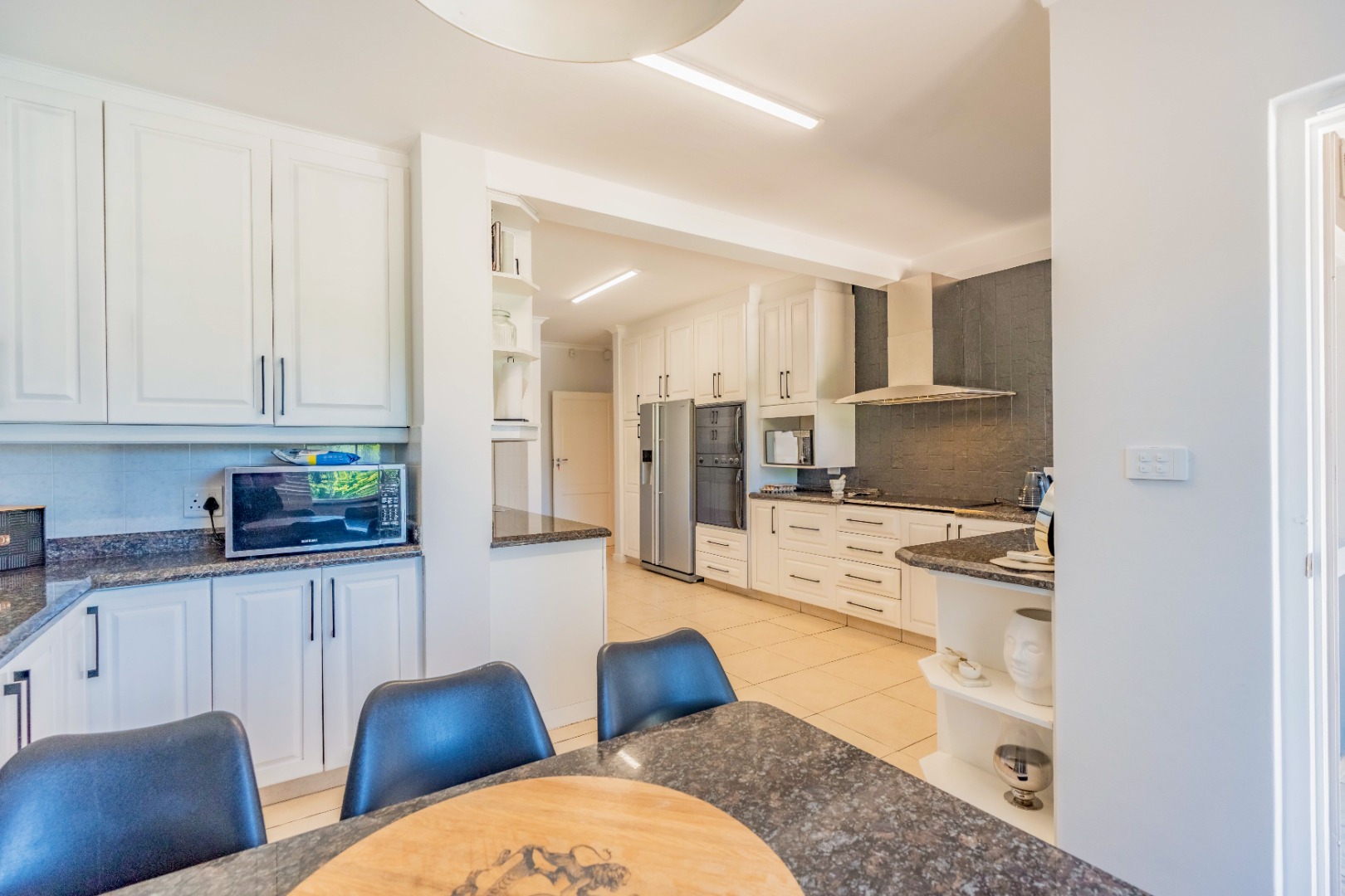The kitchen is beautifully appointed with a contemporary palette of white cabinetry, rich wood accents and stone countertops. A charcoal splashback adds contrast, while modern hardware, eye-level ovens, a gas hob and stainless-steel extractor elevate both style and functionality. Bespoke glass display cabinets introduce a refined decorative layer, and the breakfast nook enjoys calming views across the garden. A separate scullery and laundry maintain discreet workflow and preserve the kitchen’s clean-lined aesthetic.