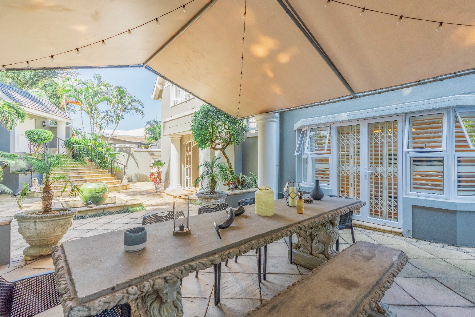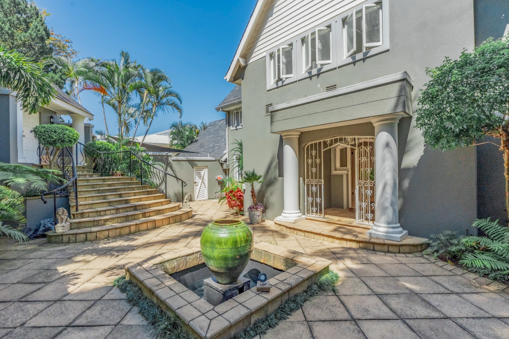Outdoor living is exceptional, with the property spilling out onto sprawling, meticulously maintained lawns bordered by mature palms, lush tropical planting and beautifully structured landscaping. The resort-style poolscape forms the focal point of the garden, framed by broad sun-drenched paving, multiple lounging pockets and elevated terracing that enhances the sense of scale and privacy. The covered patio provides a generous sheltered space for outdoor dining and relaxation, positioned perfectly to overlook the pool, lawns and surrounding greenery. Additional terraces styled with stone pots, sculptural planters and layered foliage create a collection of inviting alfresco zones, while the tranquil front courtyard—with stepped paving and a water feature—adds another calm outdoor retreat.