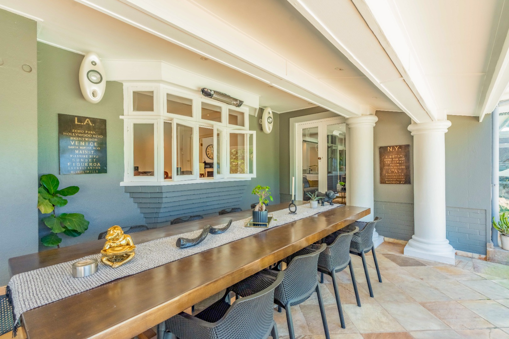 The dining area extends this sequence seamlessly, positioned to capture natural light and treetop outlooks, with wide glass doors connecting the interiors directly to the covered patio and sweeping lawns.