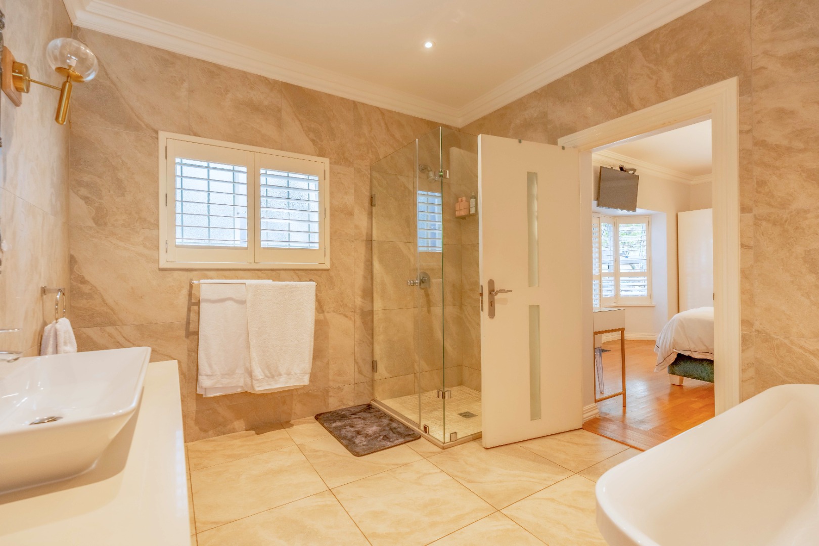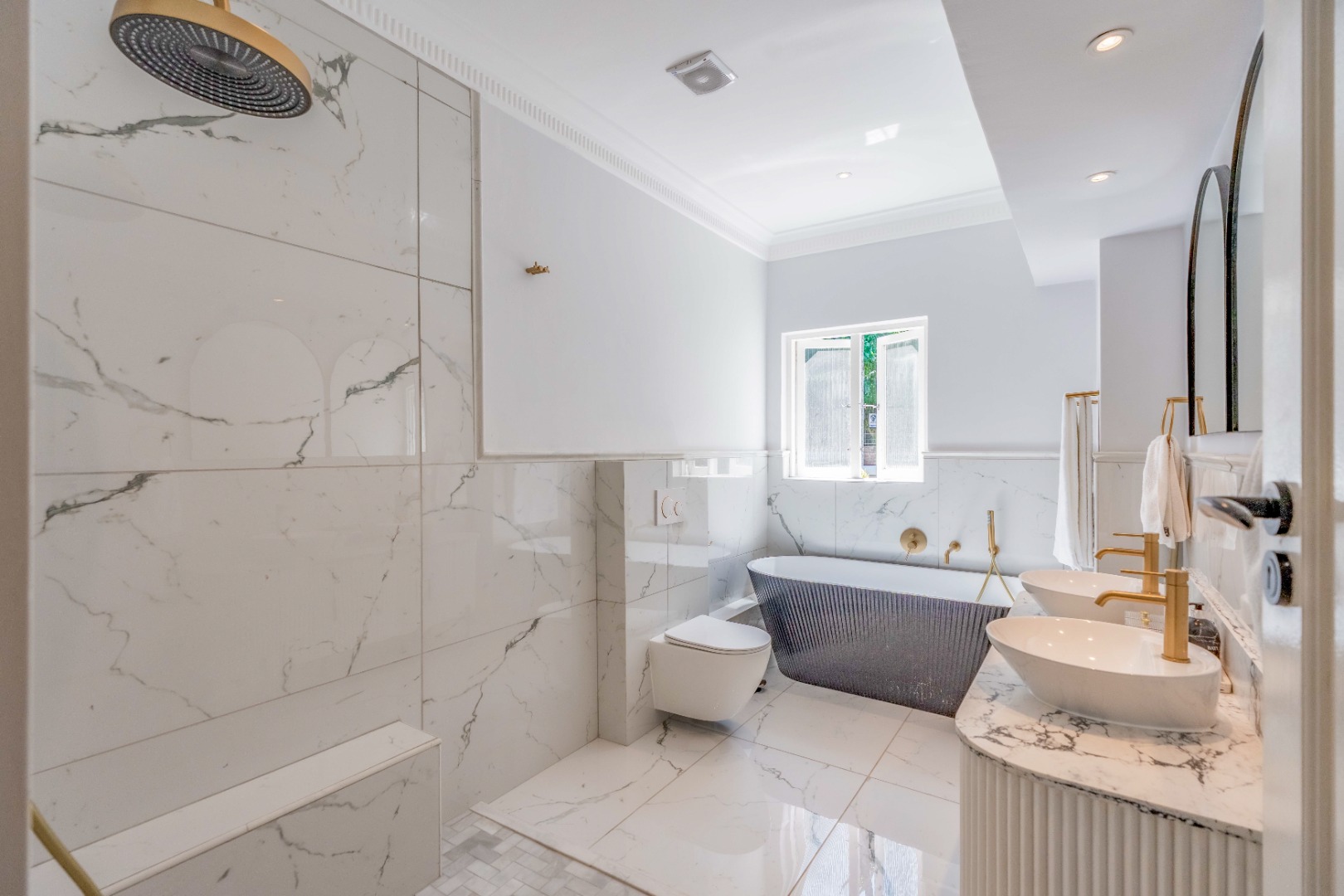 Bathrooms throughout the home are finished to a high contemporary standard, featuring marble-look tiles, floating vanities, frameless glass showers and modern sanitaryware.