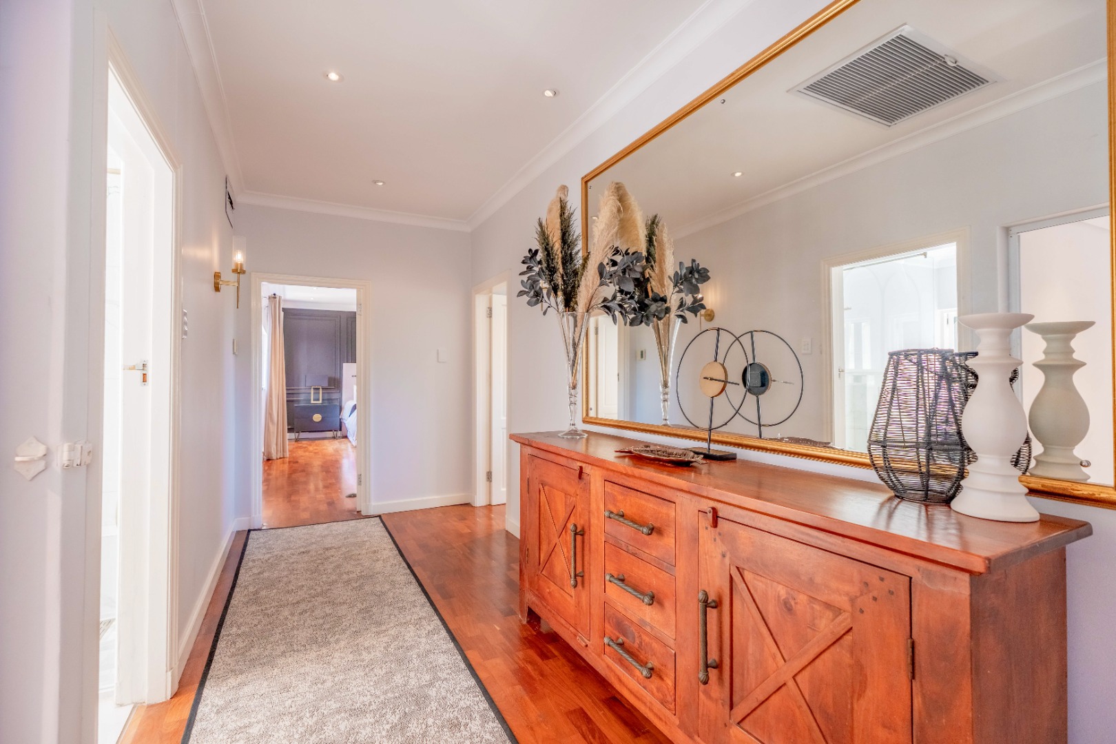 The home’s entertainment axis is anchored by an impressive indoor bar, crafted in rich timber with mirrored back panels, ambient lighting and generous display cabinetry. This bespoke installation connects to a secondary lounge, creating a sophisticated social hub ideal for hosting.