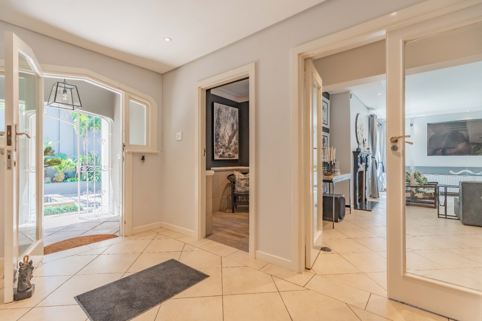 The private home office provides multiple workstations, feature wallpaper, abundant shelving and excellent natural light, delivering a polished workspace separate from the primary living zones — and offering flatlet conversion potential should one wish to create an independent suite downstairs. A spacious downstairs en-suite bedroom adds versatility for guests or extended family. A guest loo completes this level.