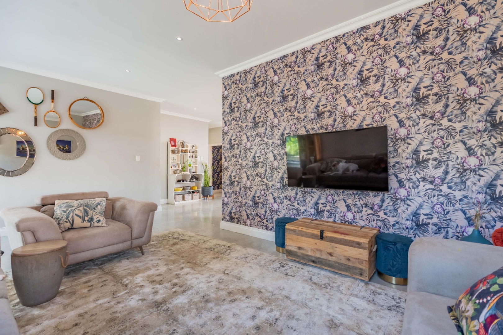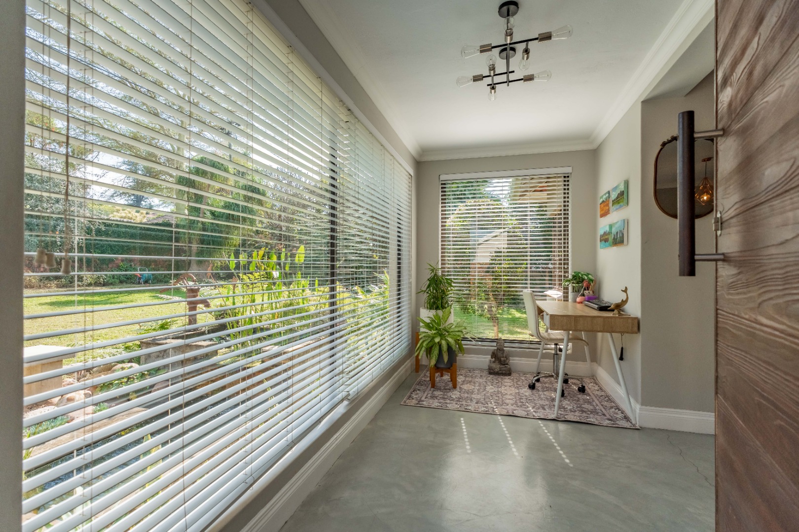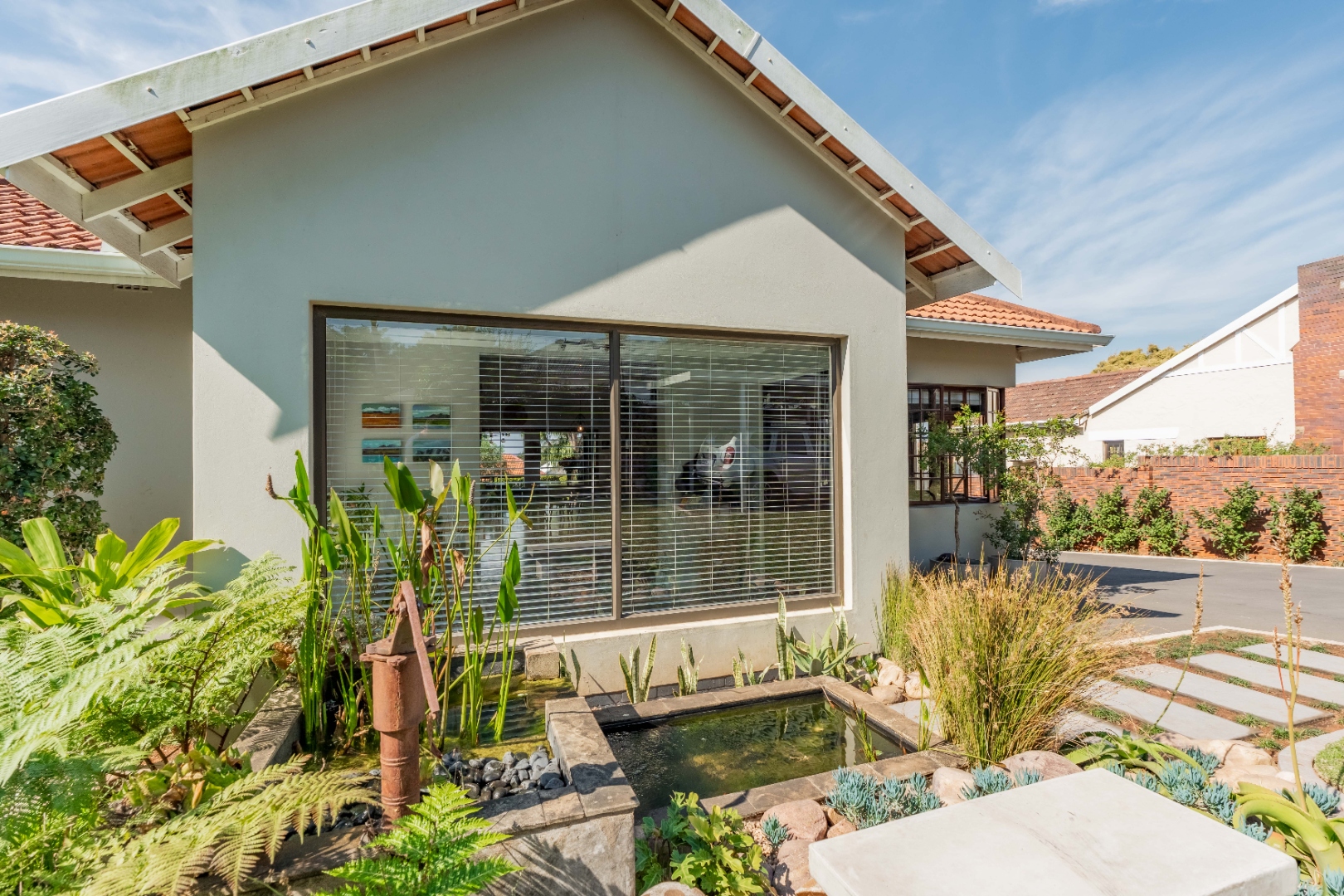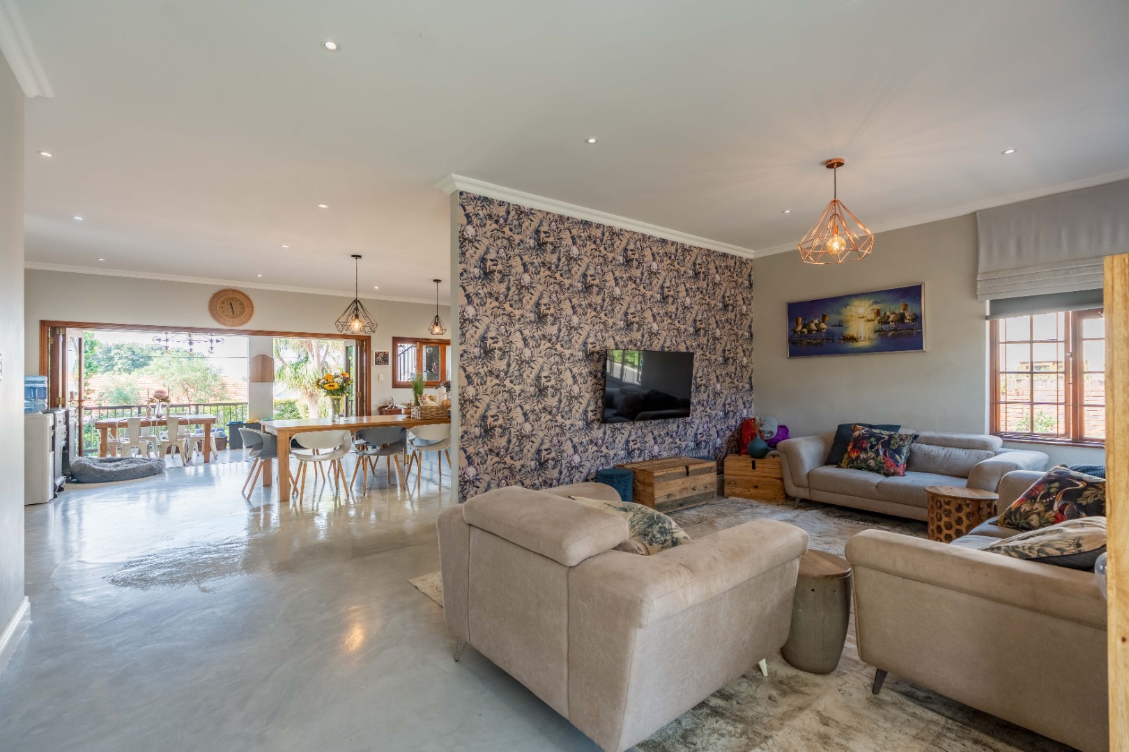 A stunning floor-to-ceiling glass feature window welcomes you into a light-filled entrance hall, framing a serene water feature and setting the tone for the spaciousness that follows. Polished concrete floors and curated lighting define the open plan living and dining areas, where warmth, scale, and understated living meet.