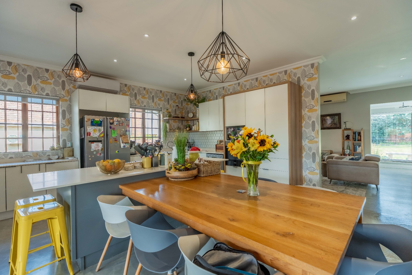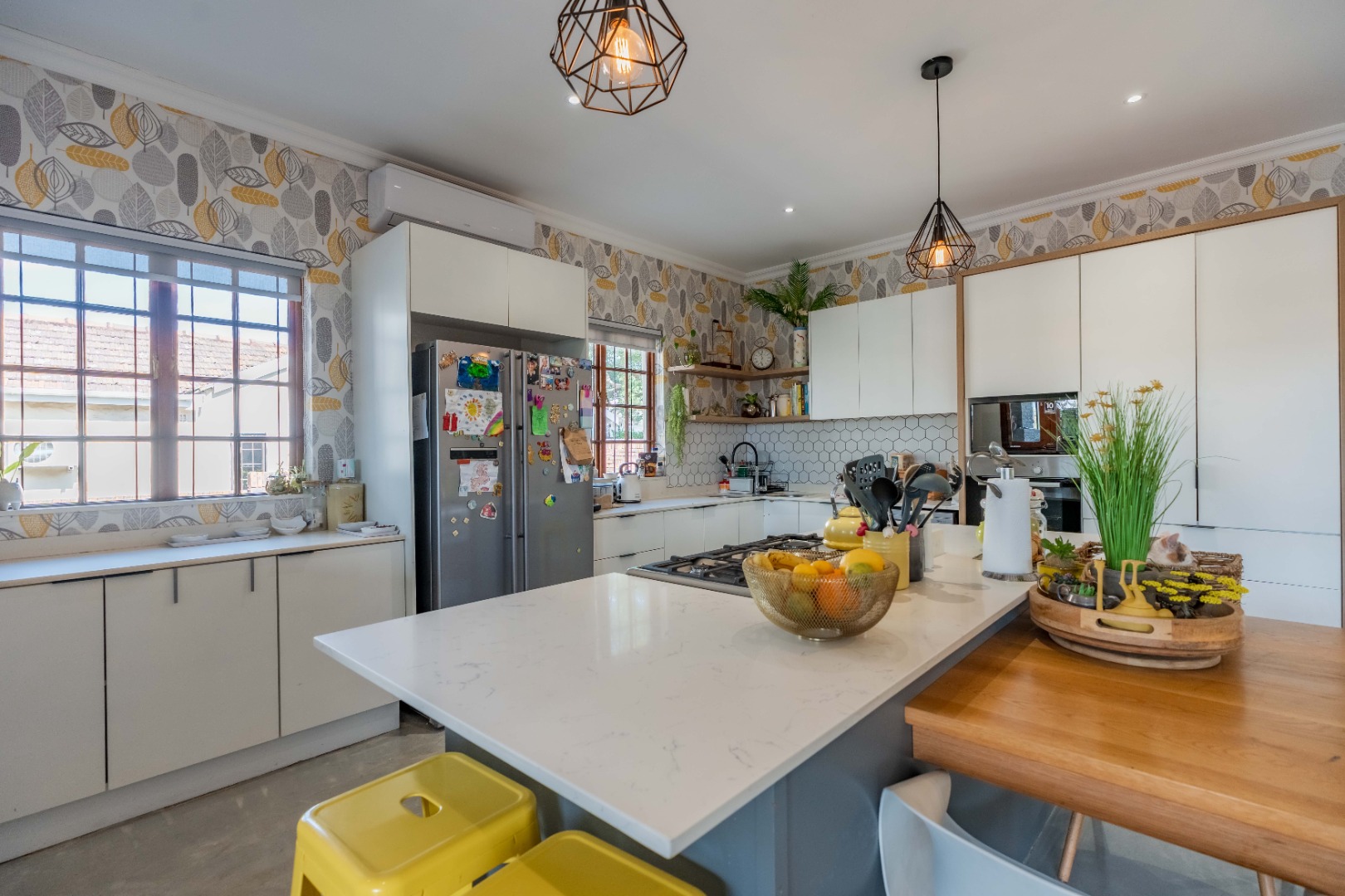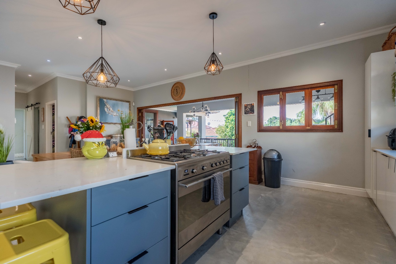 The bespoke, expansive, open plan kitchen, light, bright, and impeccably appointed features crisp white cabinetry, floating shelving, premium appliances, and a pantry cupboard, complemented by a central island with integrated breakfast bar. A stack-back serving window connects the kitchen to the outdoor conversation counter, reinforcing the seamless flow between indoor and outdoor living.