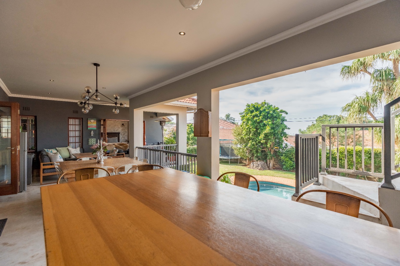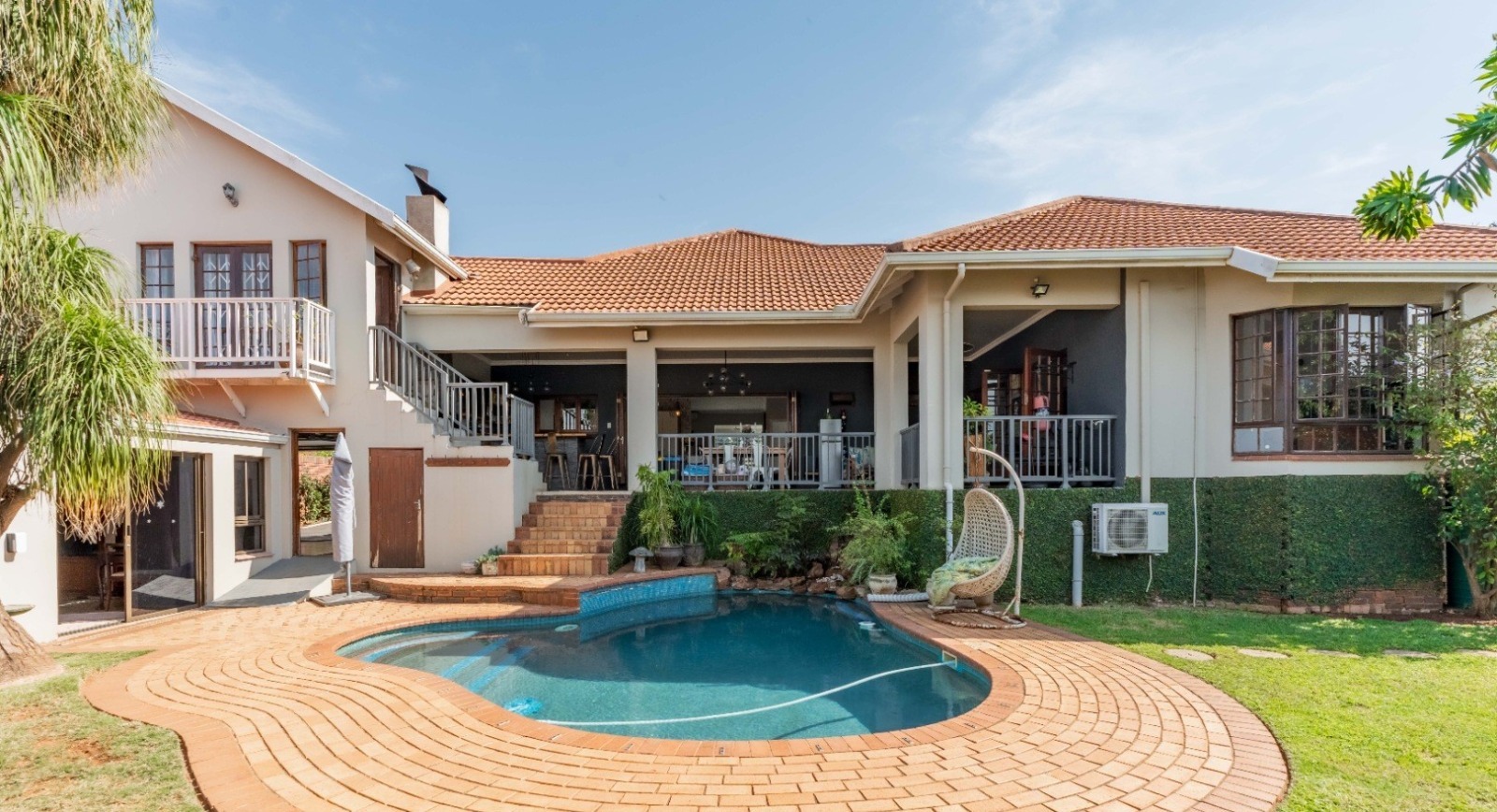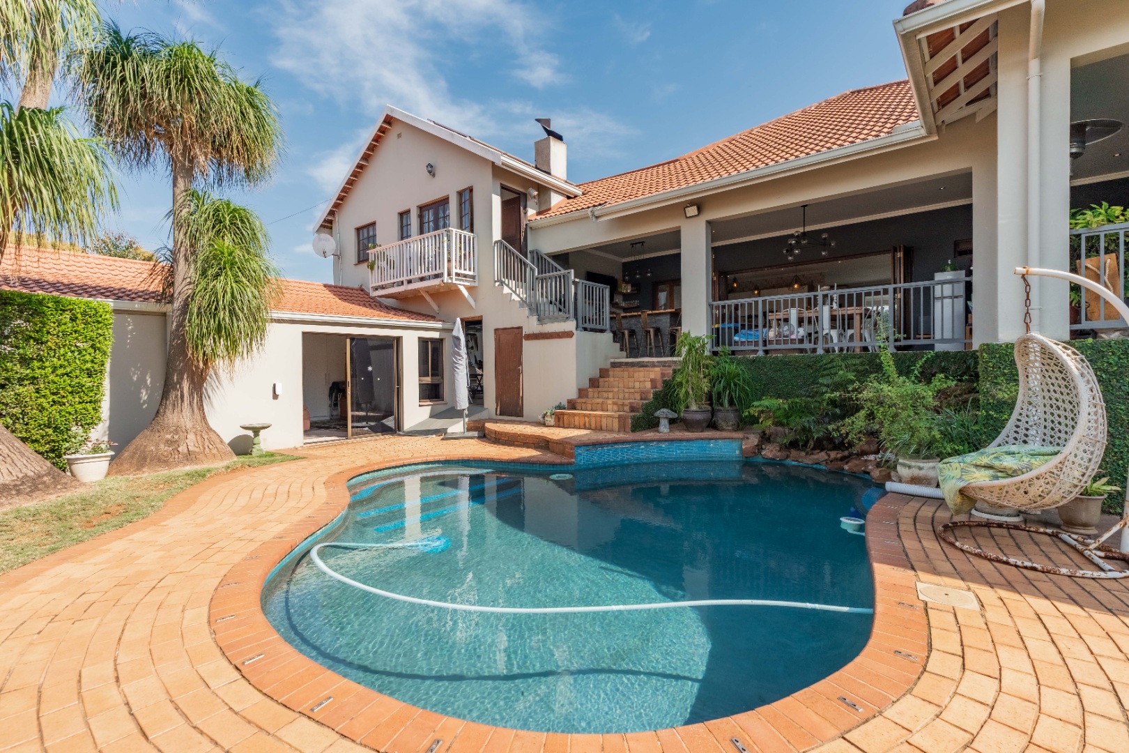 Full stack back doors open seamlessly to the expansive, covered, L-shaped verandah with a built-in braai, conversation counter, and ample space for alfresco dining and lounging. This space overlooks a sunlit, manicured ,level garden and a sparkling pool — the ultimate backdrop for entertaining and everyday relaxation.