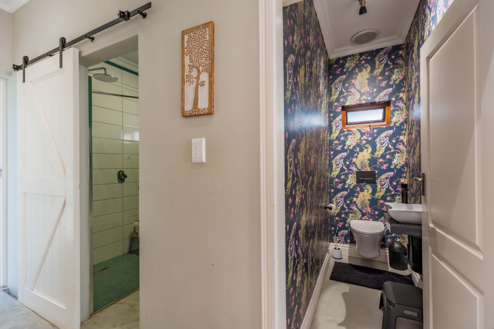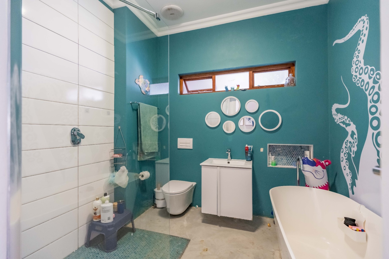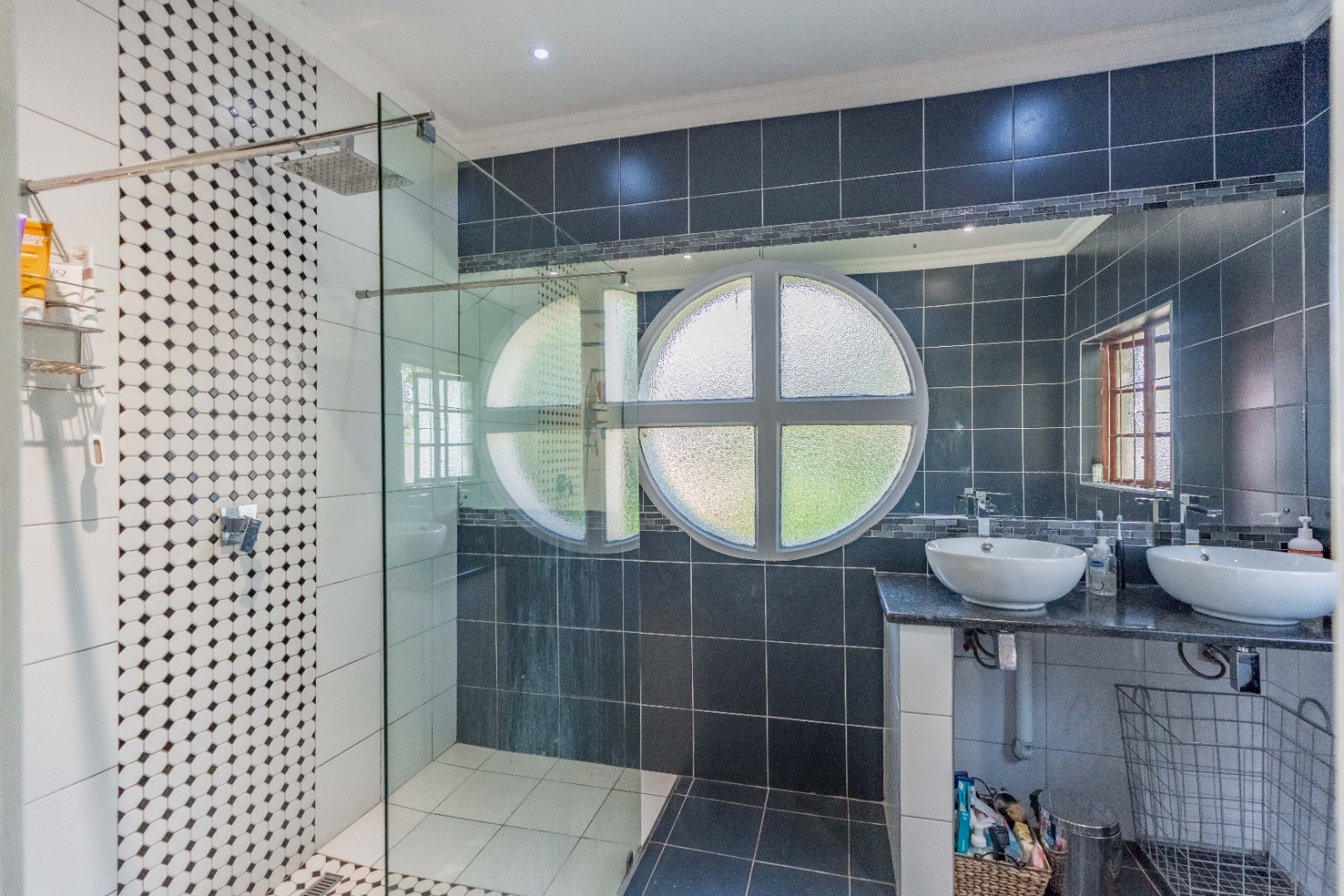Three spacious bedrooms anchor the main residence. The large primary suite opens onto the patio and features a walk-through dressing area, slatted glass detail, and an open-plan en-suite bathroom with a walk-in shower, double vanity, and bold circular feature window. Two additional bedrooms are serviced by a designer family bathroom with a freestanding tub and walk-in shower, plus a guest loo.
