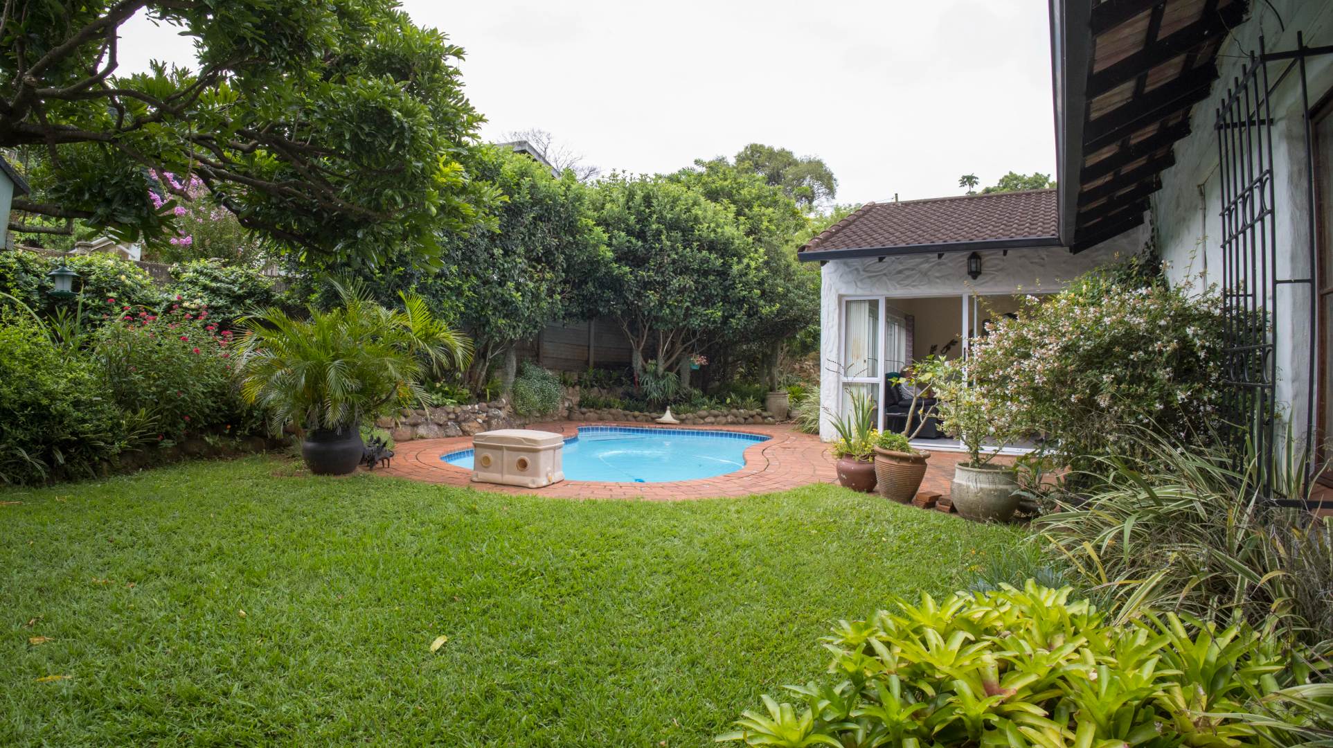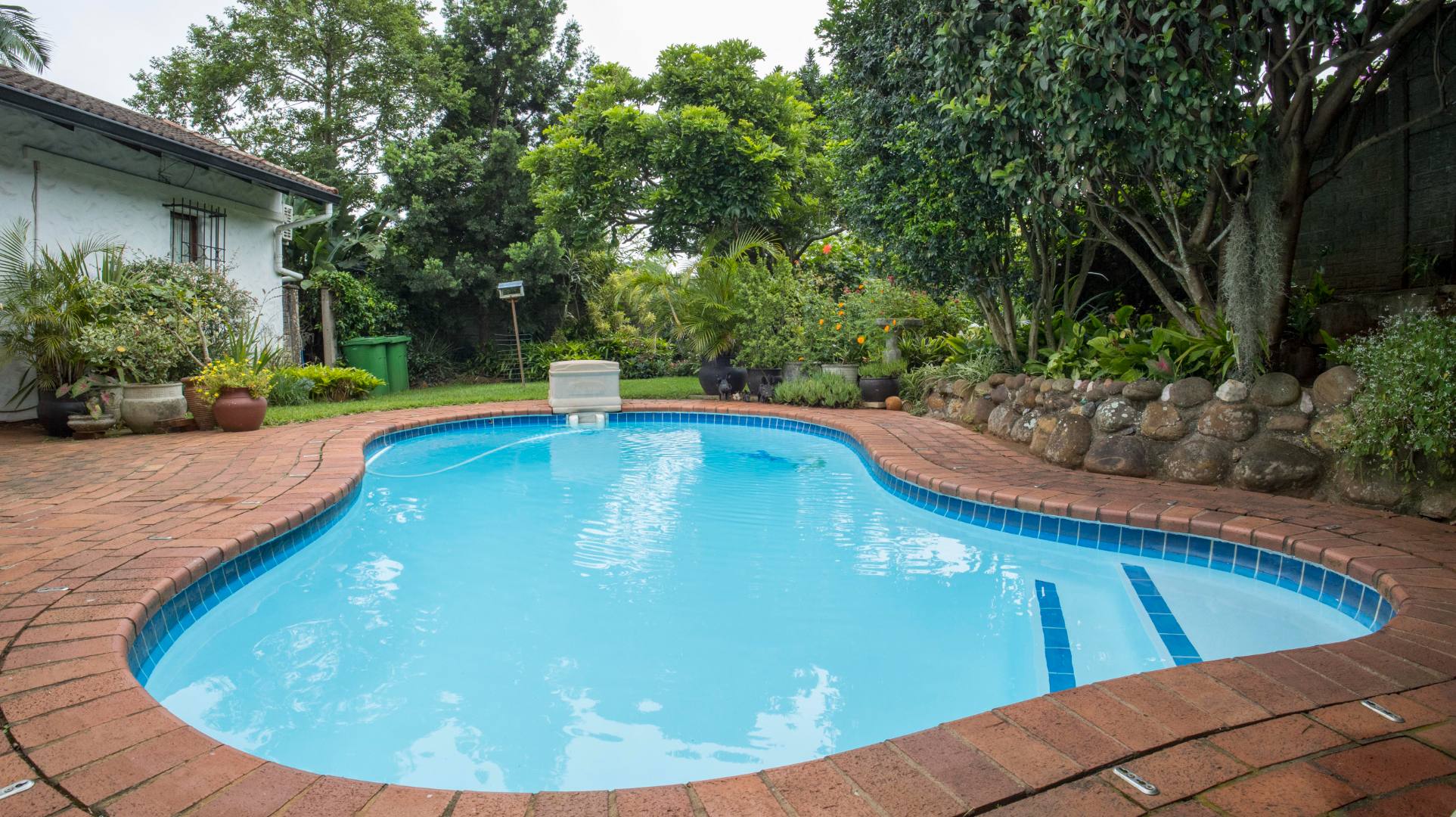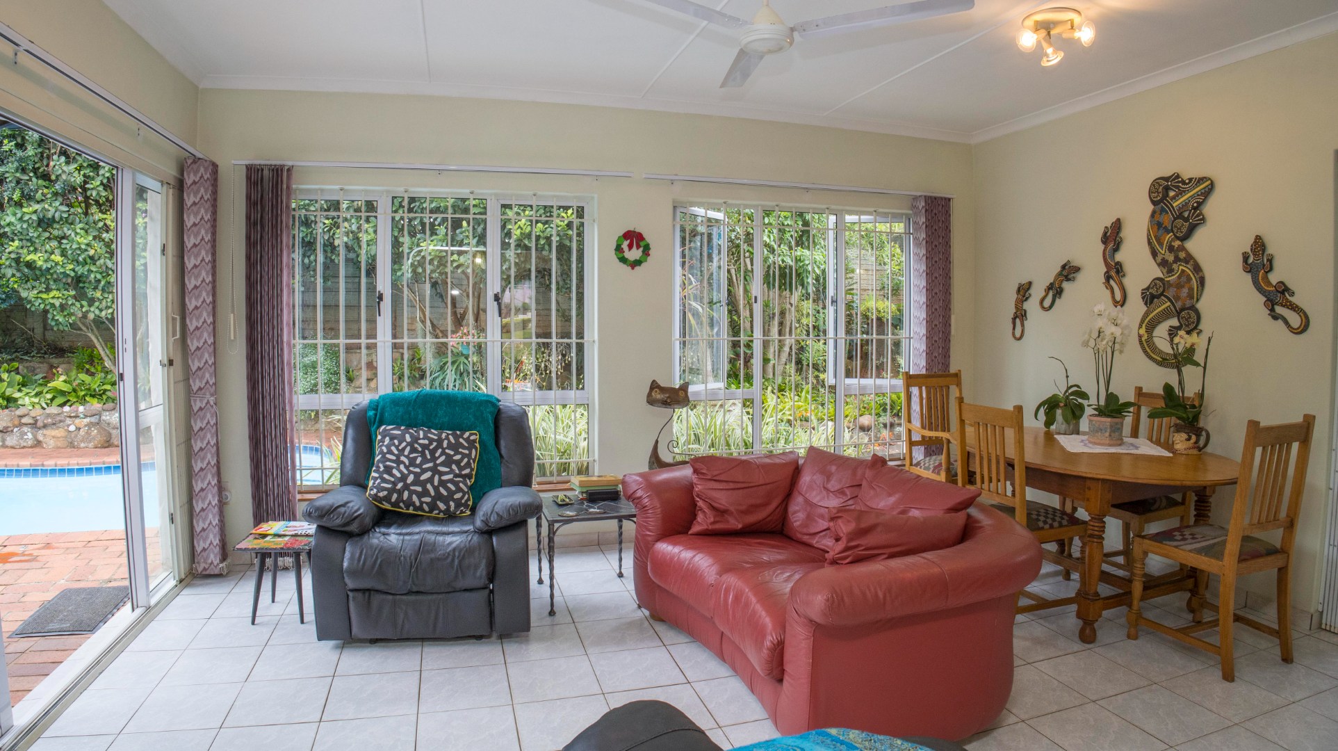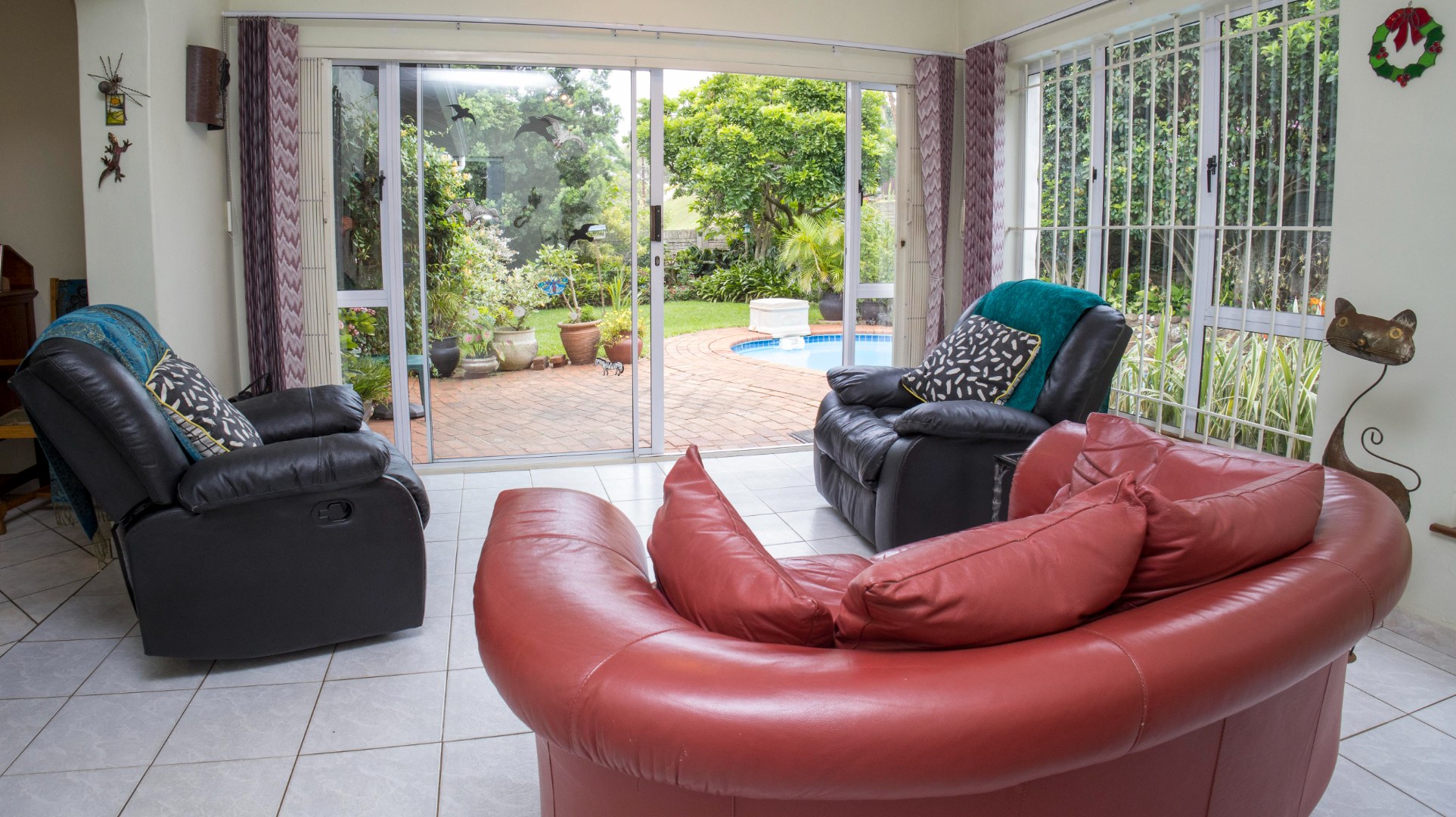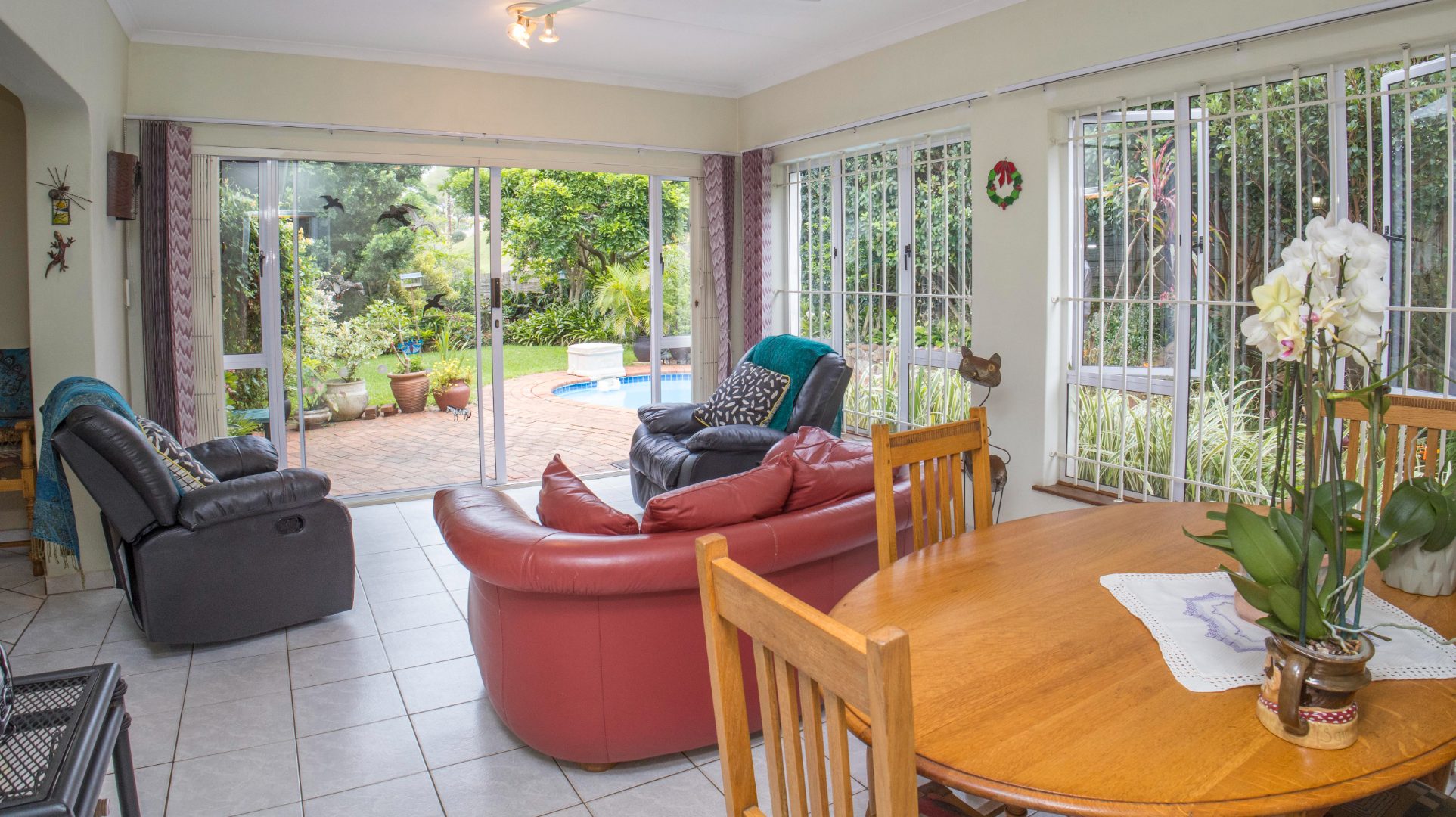 The property boasts a sparkling swimming pool overlooked by a sun lounge, ideal for relaxed indoor-outdoor entertaining.