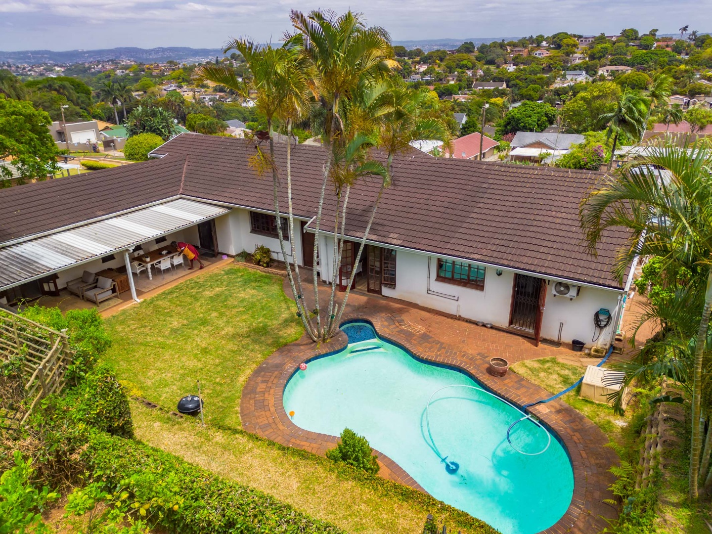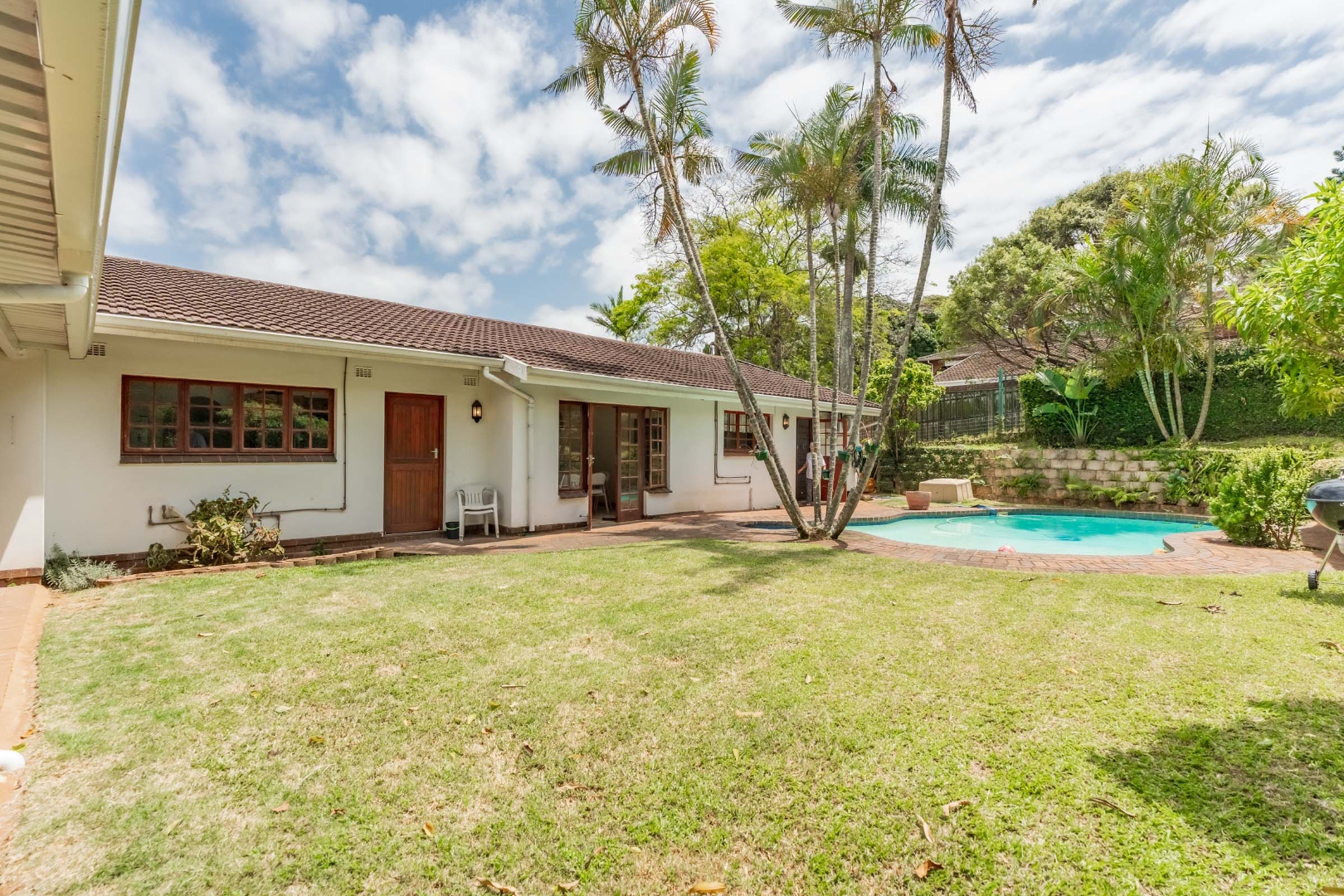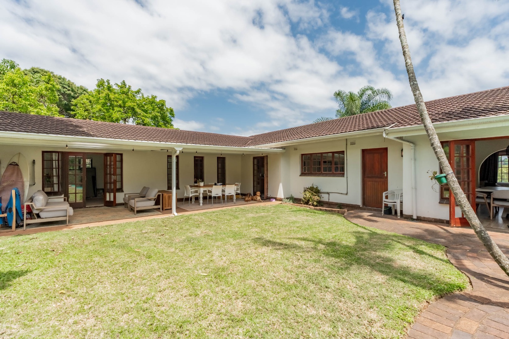 This inviting 4-bedroom, 3-bathroom family home in Glen Anil, Durban North, offers a harmonious blend of comfortable living and outdoor enjoyment. Set on a generous almost level erf, the property boasts a charming white exterior with a tiled roof, creating a welcoming first impression. The design emphasizes seamless indoor-outdoor flow, perfect for the South African lifestyle.