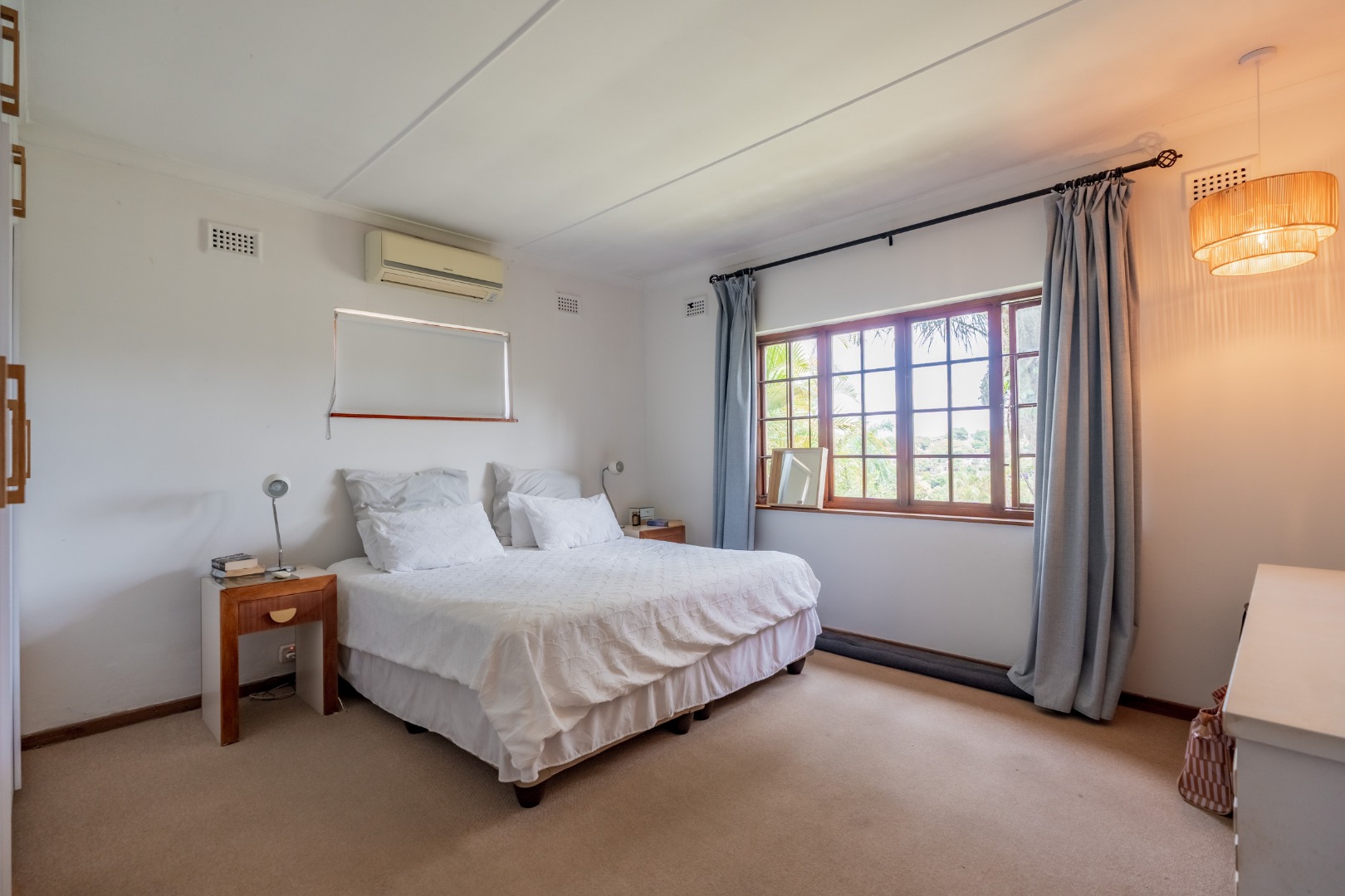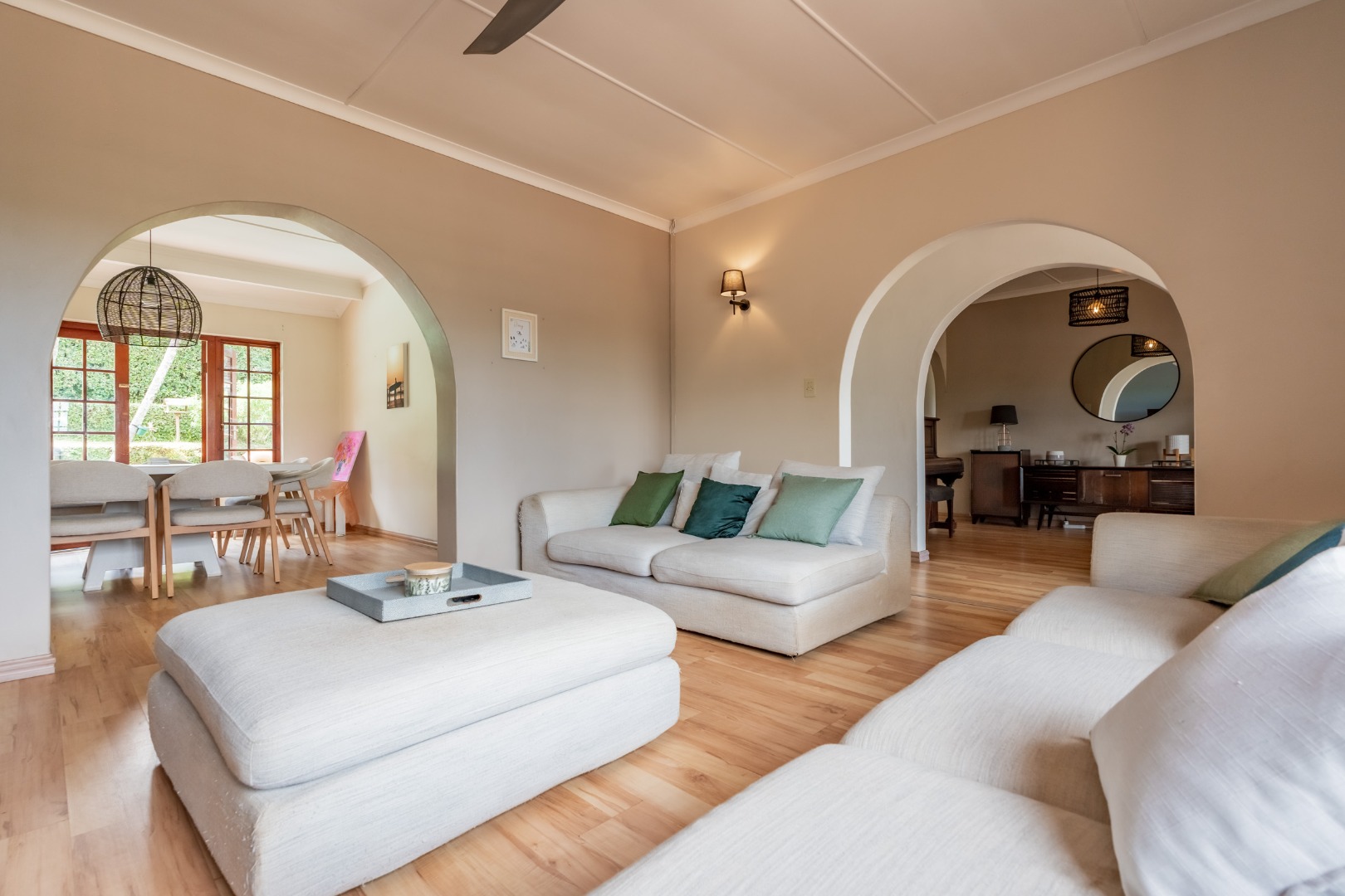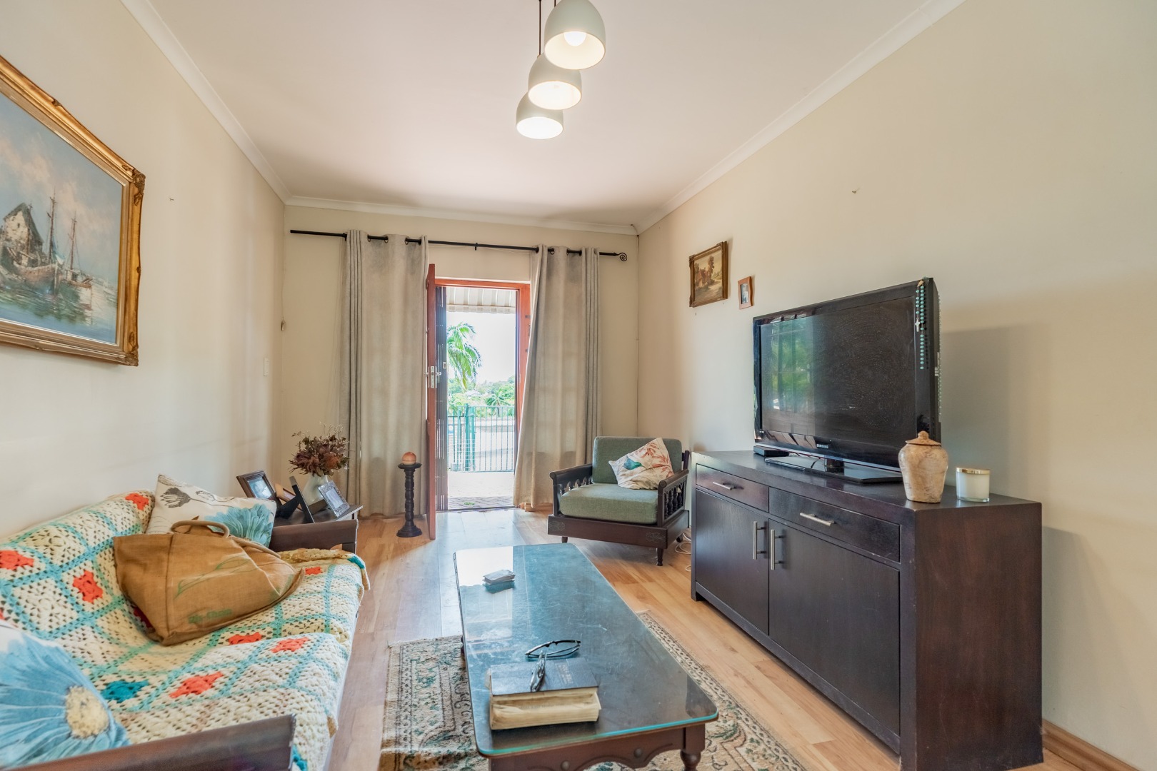 This inviting 4-bedroom, 3-bathroom family home in Glen Anil, Durban North, offers a harmonious blend of comfortable living and outdoor enjoyment. Set on a generous almost level erf, the property boasts a charming white exterior with a tiled roof, creating a welcoming first impression. The design emphasizes seamless indoor-outdoor flow, perfect for the South African lifestyle.
