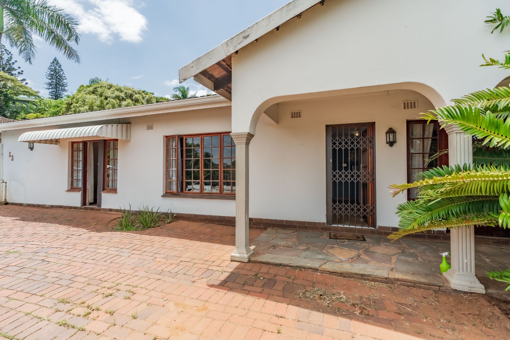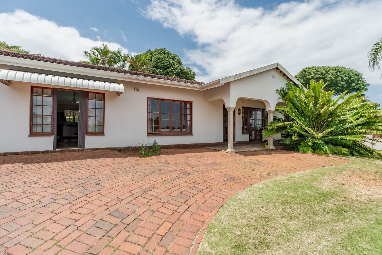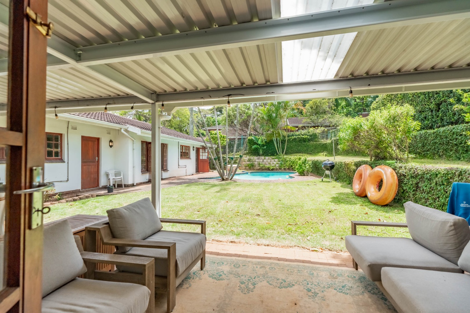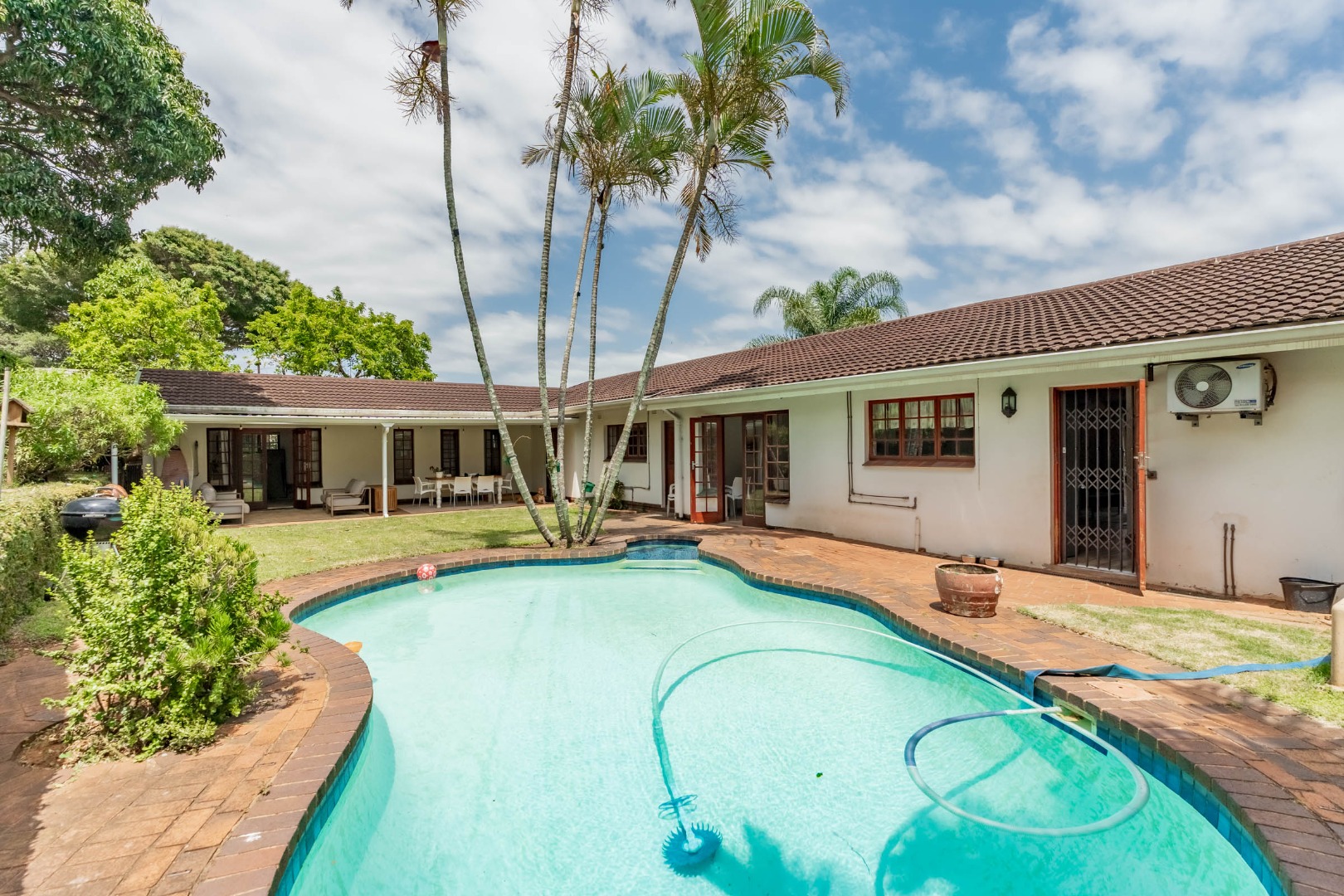 This inviting 4-bedroom, 3-bathroom family home in Glen Anil, Durban North, offers a harmonious blend of comfortable living and outdoor enjoyment. Set on a generous almost level erf, the property boasts a charming white exterior with a tiled roof, creating a welcoming first impression. The design emphasizes seamless indoor-outdoor flow, perfect for the South African lifestyle.