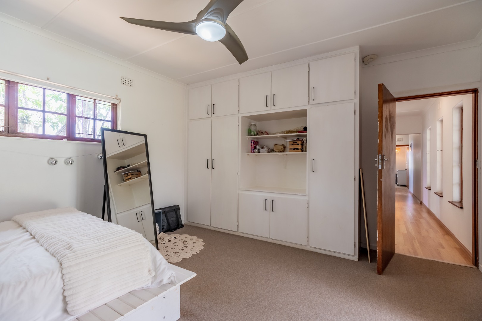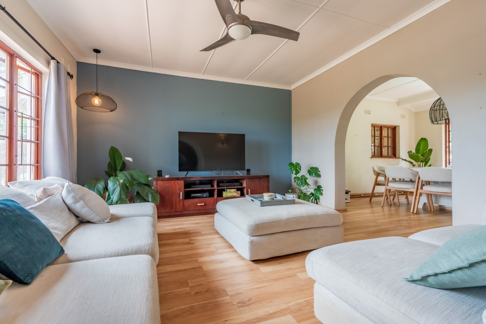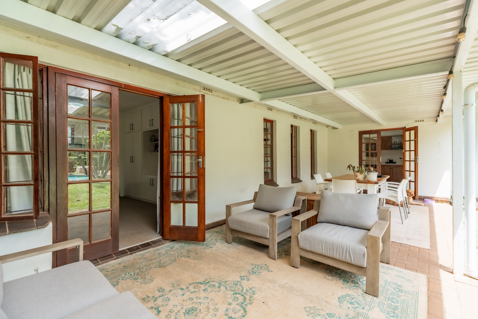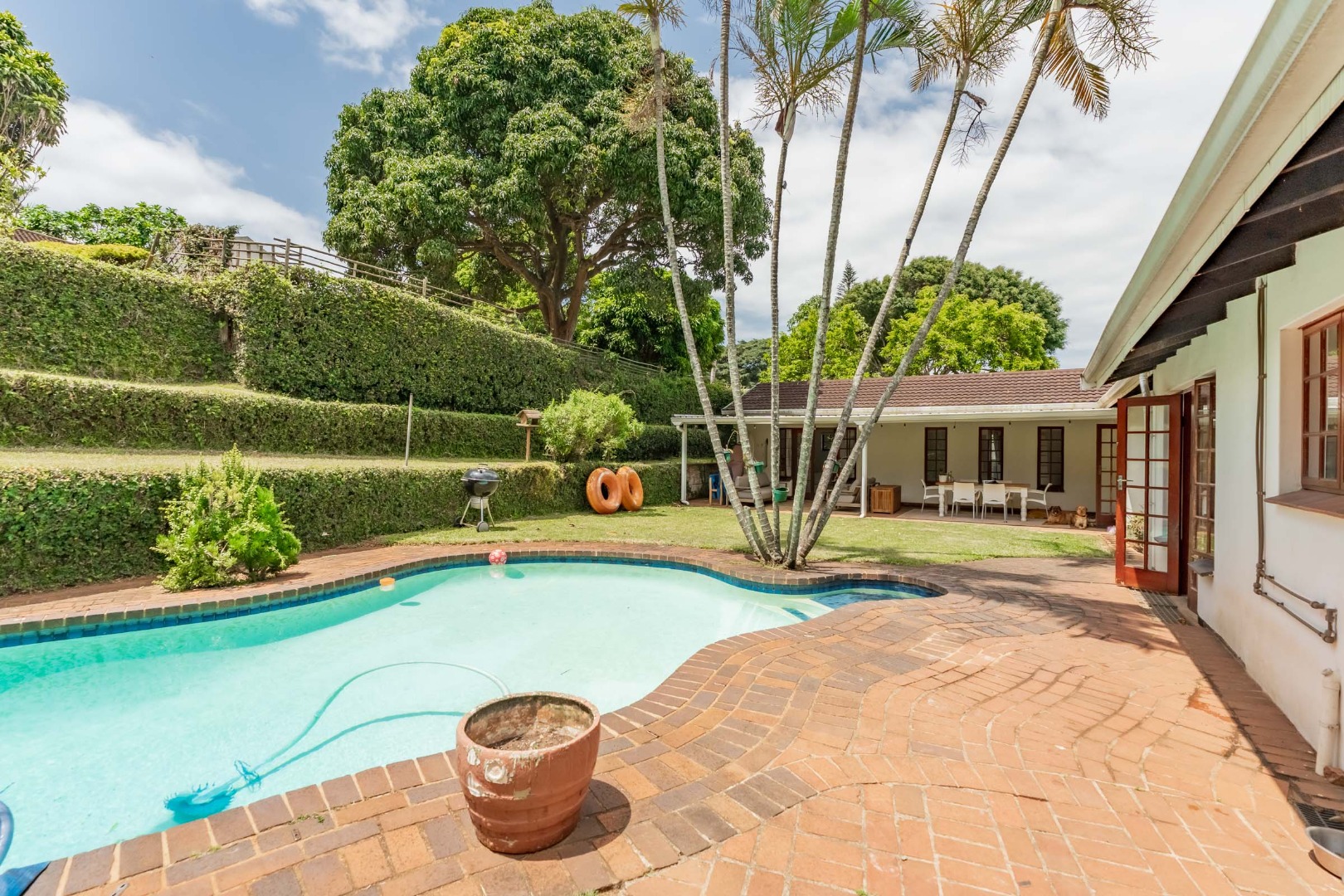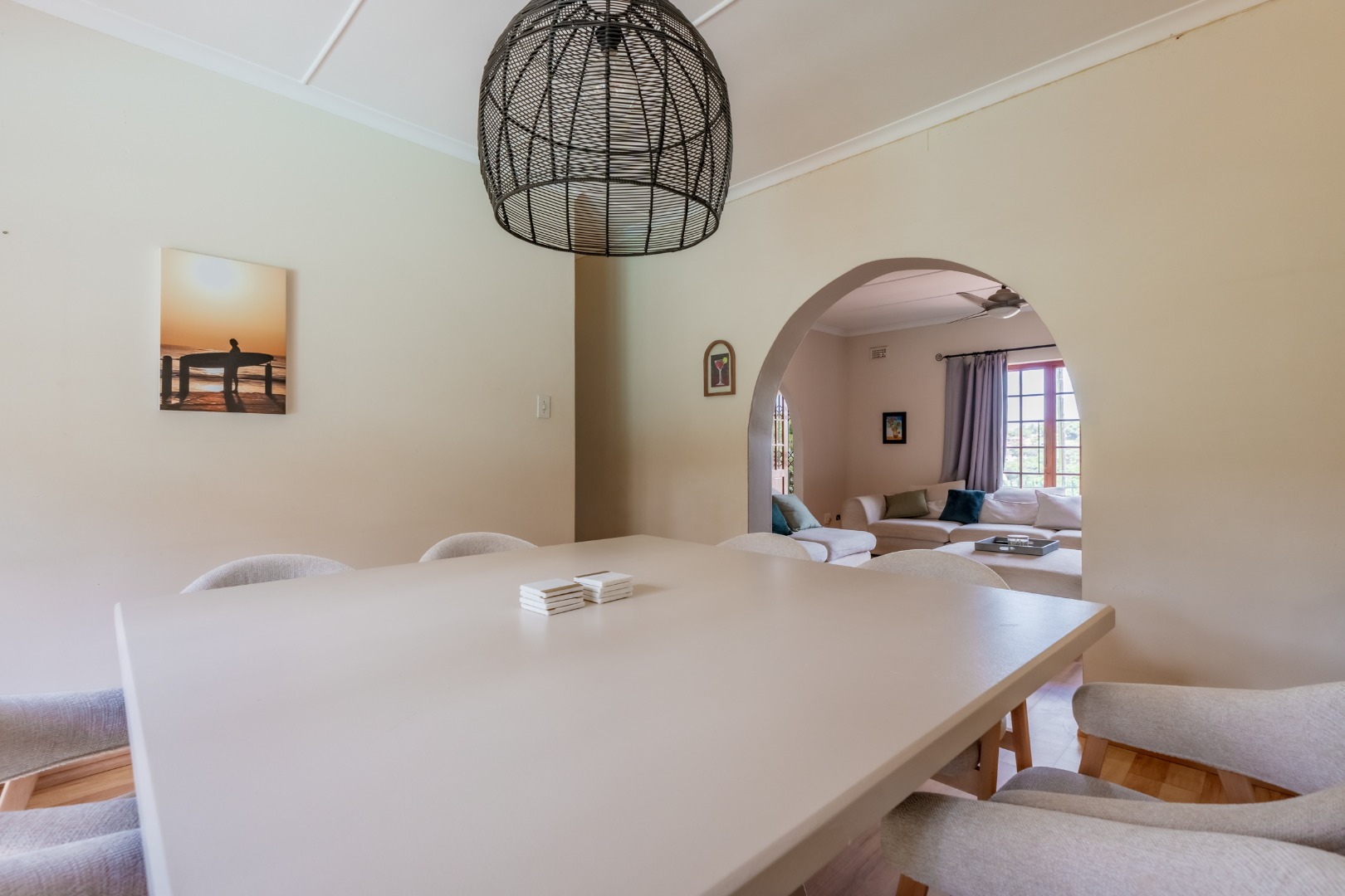 This inviting 4-bedroom, 3-bathroom family home in Glen Anil, Durban North, offers a harmonious blend of comfortable living and outdoor enjoyment. Set on a generous almost level erf, the property boasts a charming white exterior with a tiled roof, creating a welcoming first impression. The design emphasizes seamless indoor-outdoor flow, perfect for the South African lifestyle.