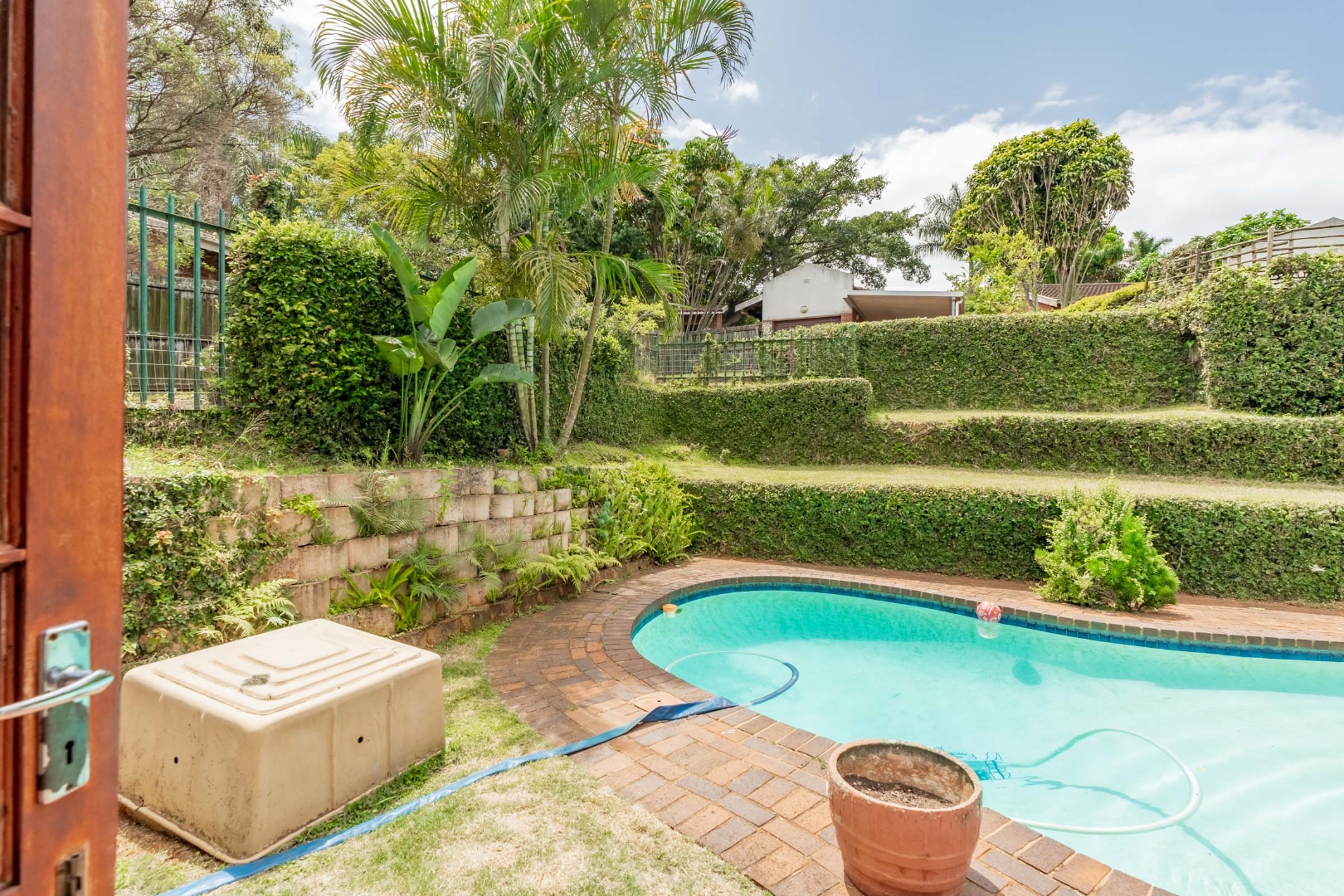 The outdoor areas are a true highlight, centered around a private, free-form swimming pool with a brick paver surround. A large, covered patio, complete with an awning, extends the living space outdoors, ideal for al fresco dining and entertaining. The spacious, terraced garden features mature trees, well-maintained hedges, and tropical foliage, creating a private oasis. Lots of on-site open parking provides convenient accommodation for vehicles.