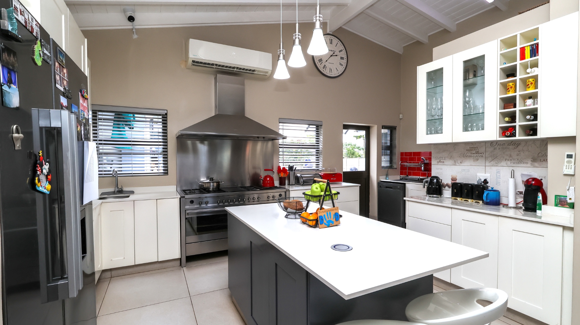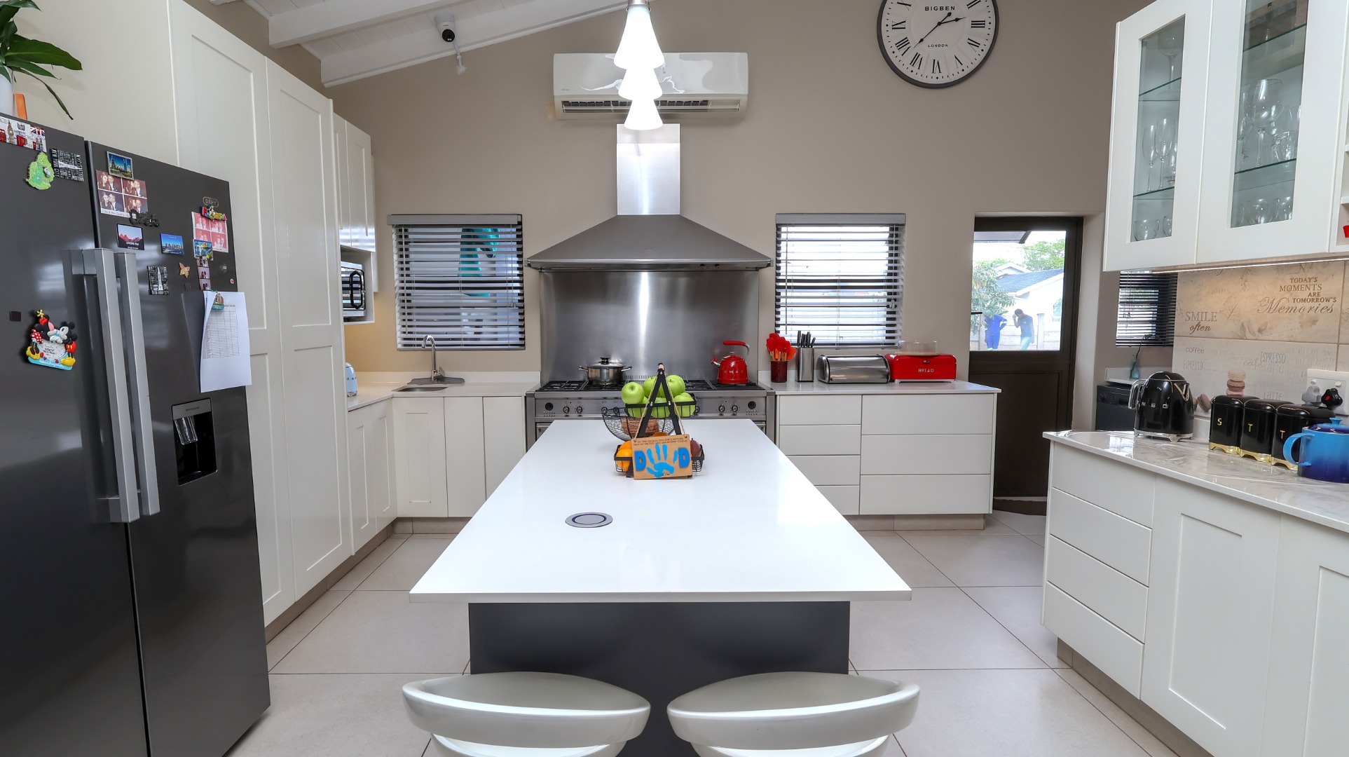 Gourmet Kitchen: A chef's dream, the kitchen is anchored by expansive, pristine Caesarstone countertops and a magnificent double SMEG gas stove. A generous separate scullery ensures the main kitchen area remains clutter-free and pristine, offering additional storage and appliance space.