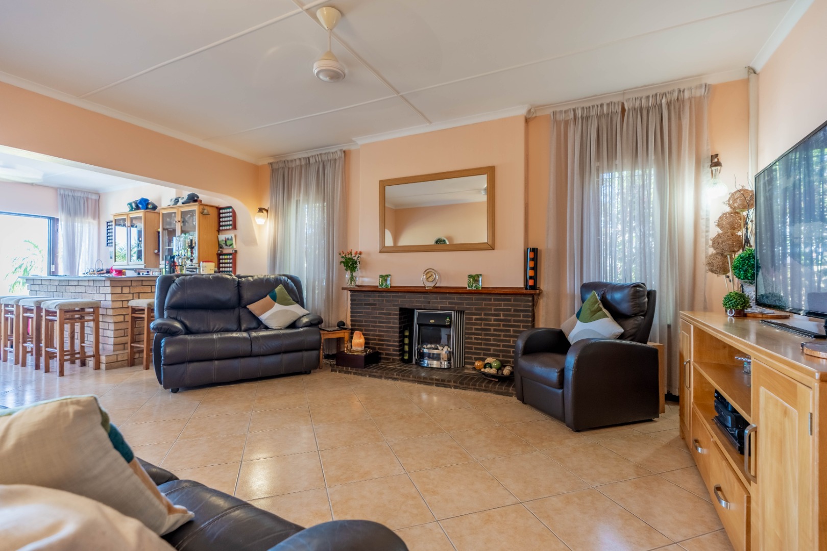 The property welcomes you through an entrance hall into comfortable living areas including a lounge and dining room, creating a warm and inviting space for everyday living and entertaining. The kitchen is fitted with melamine finishes and built-in cupboards, providing practical storage and workspace.