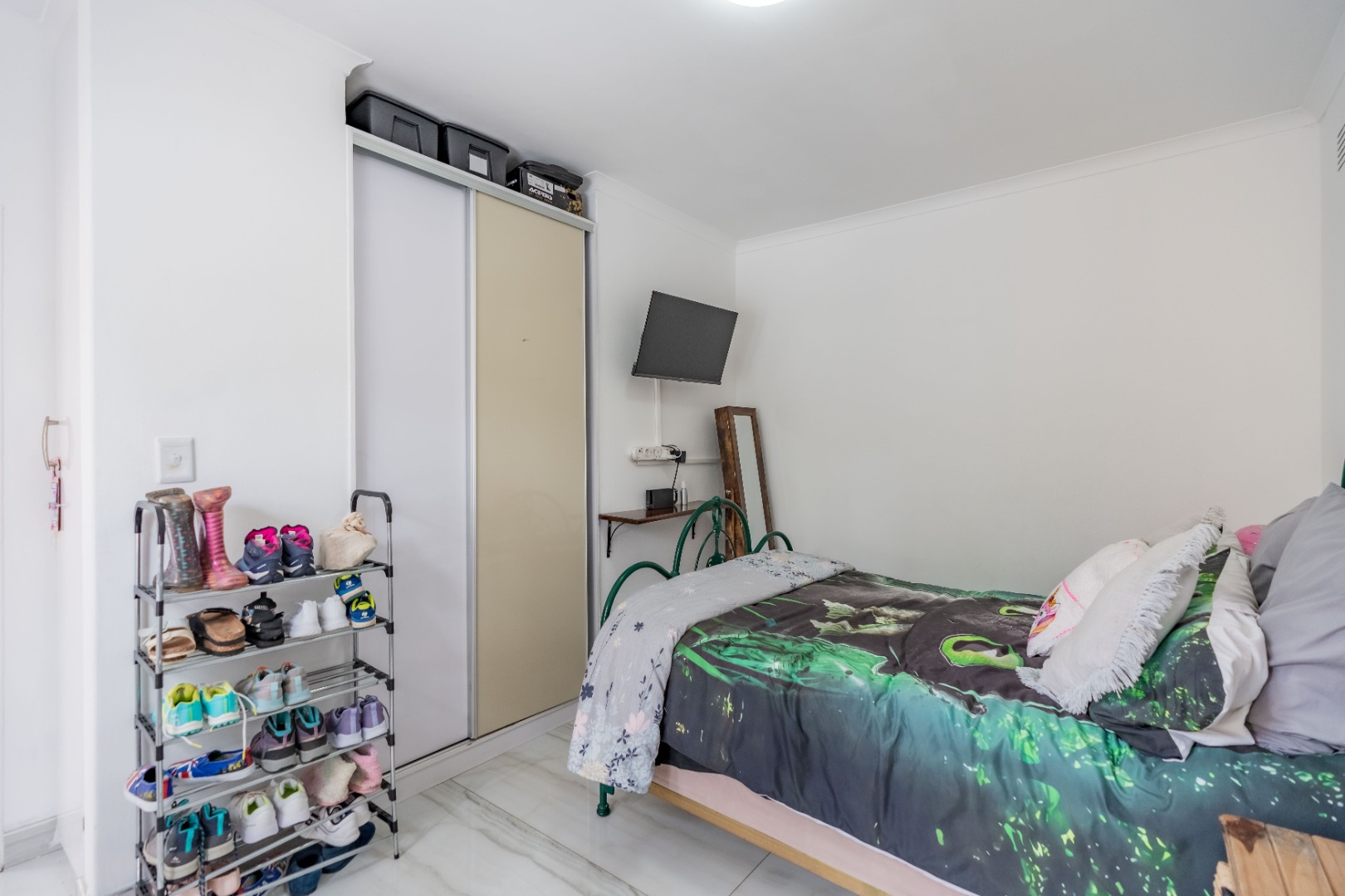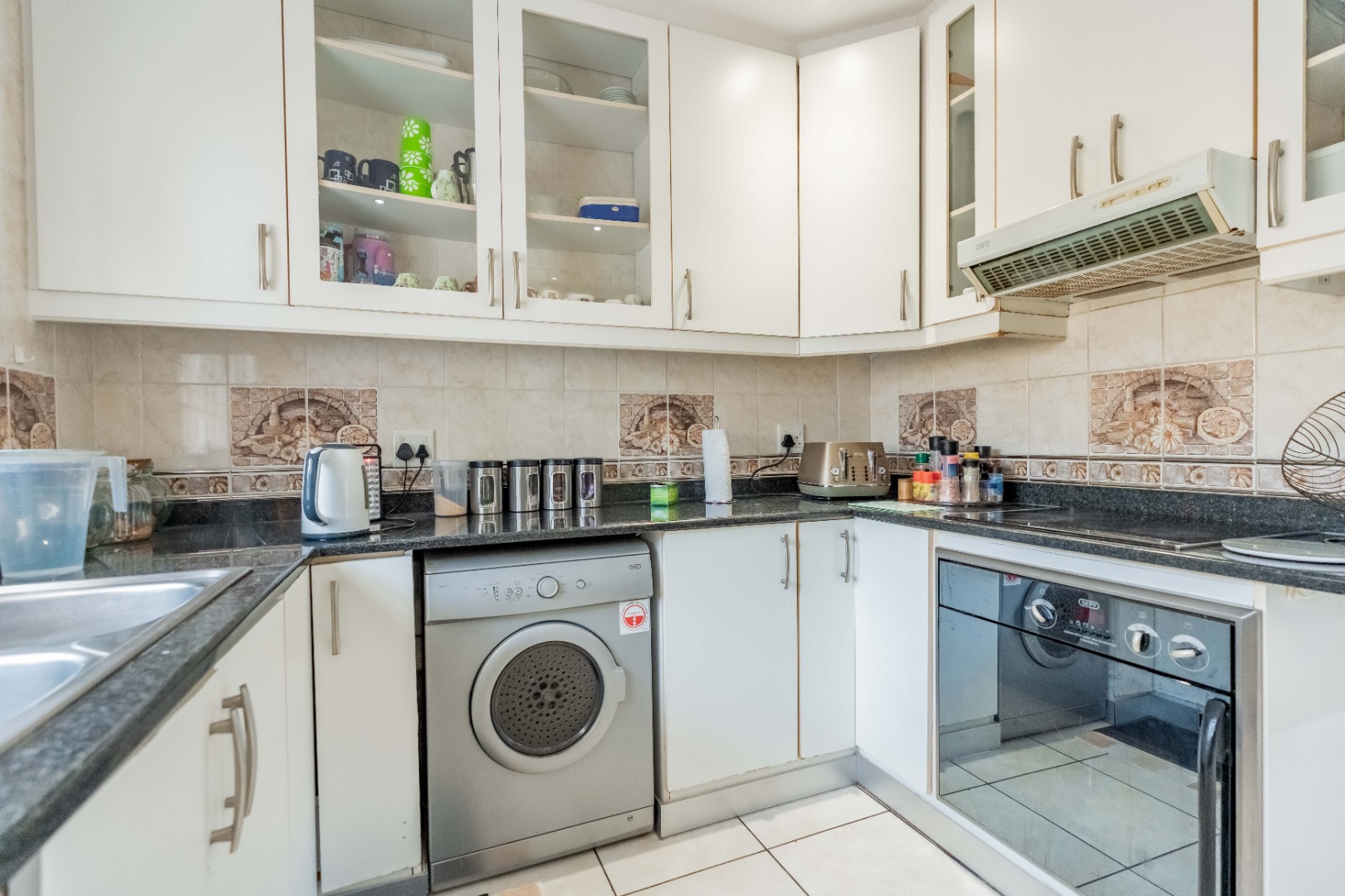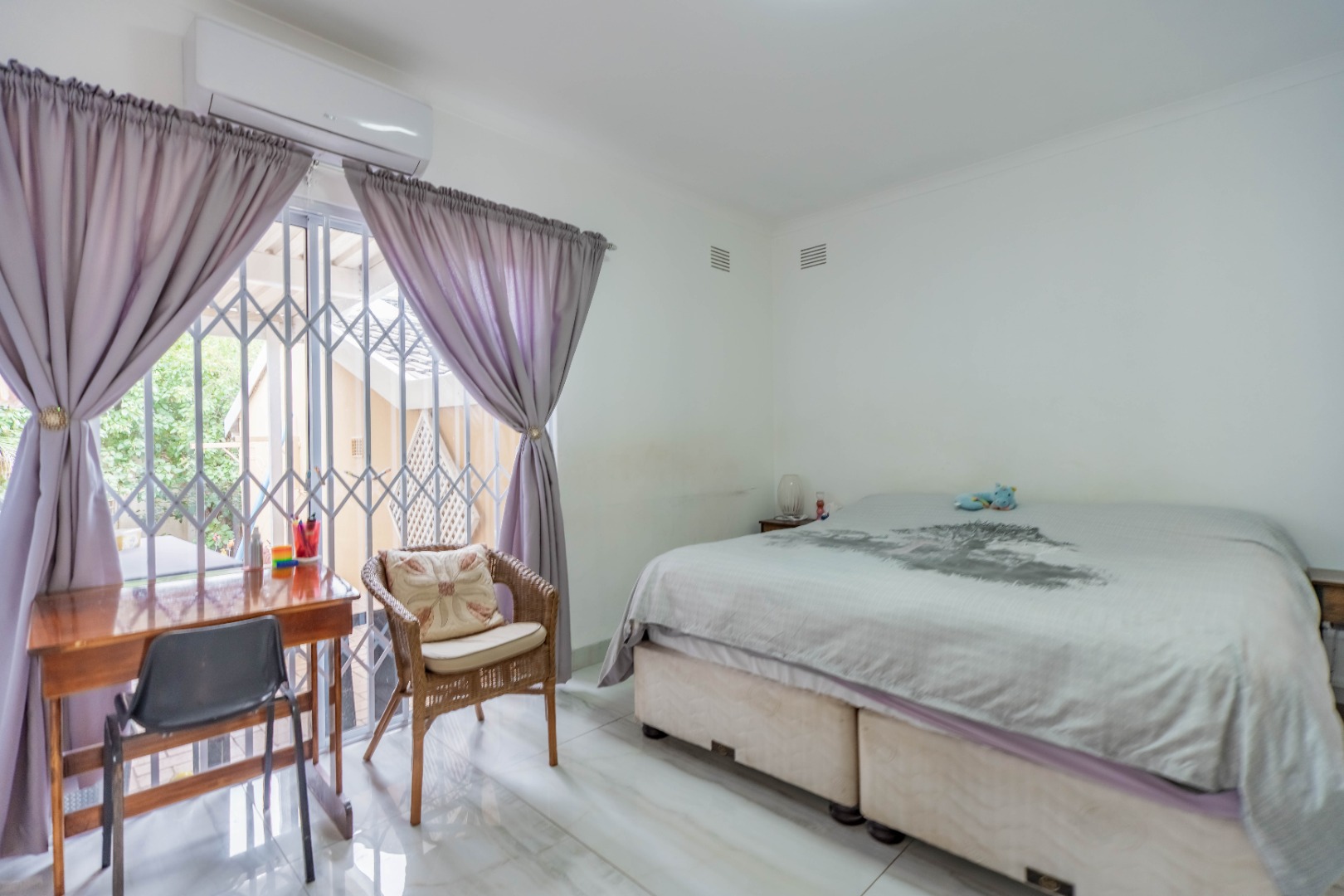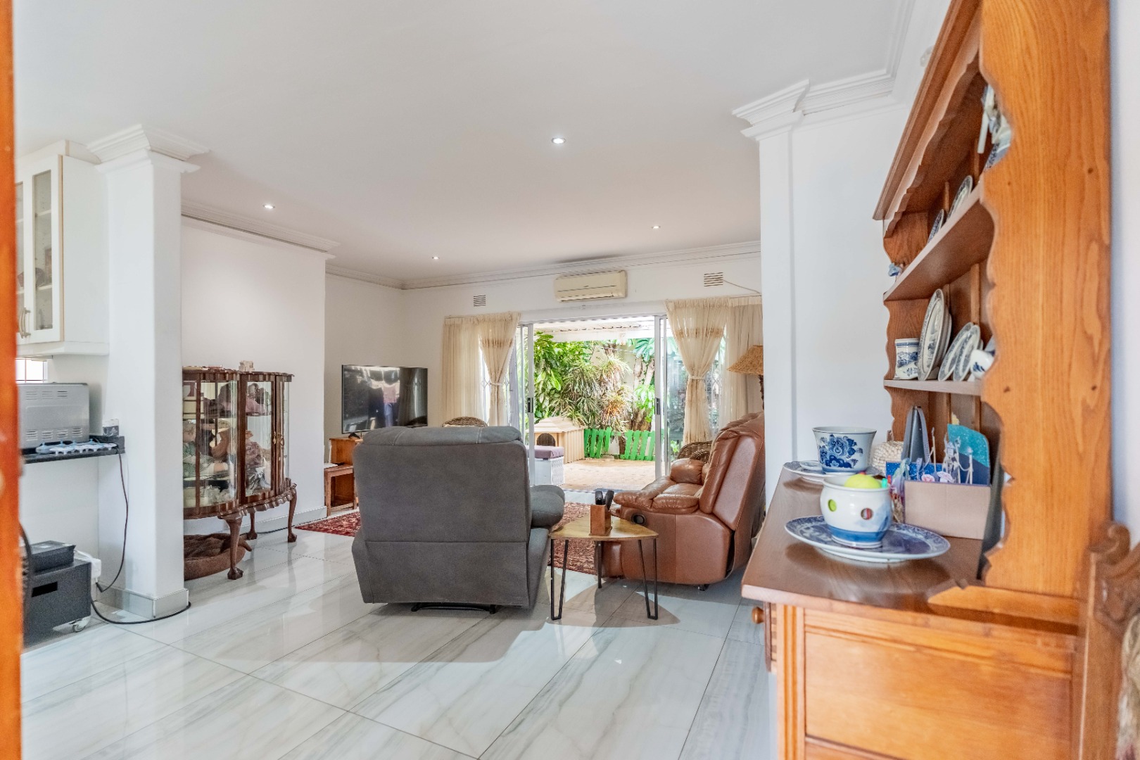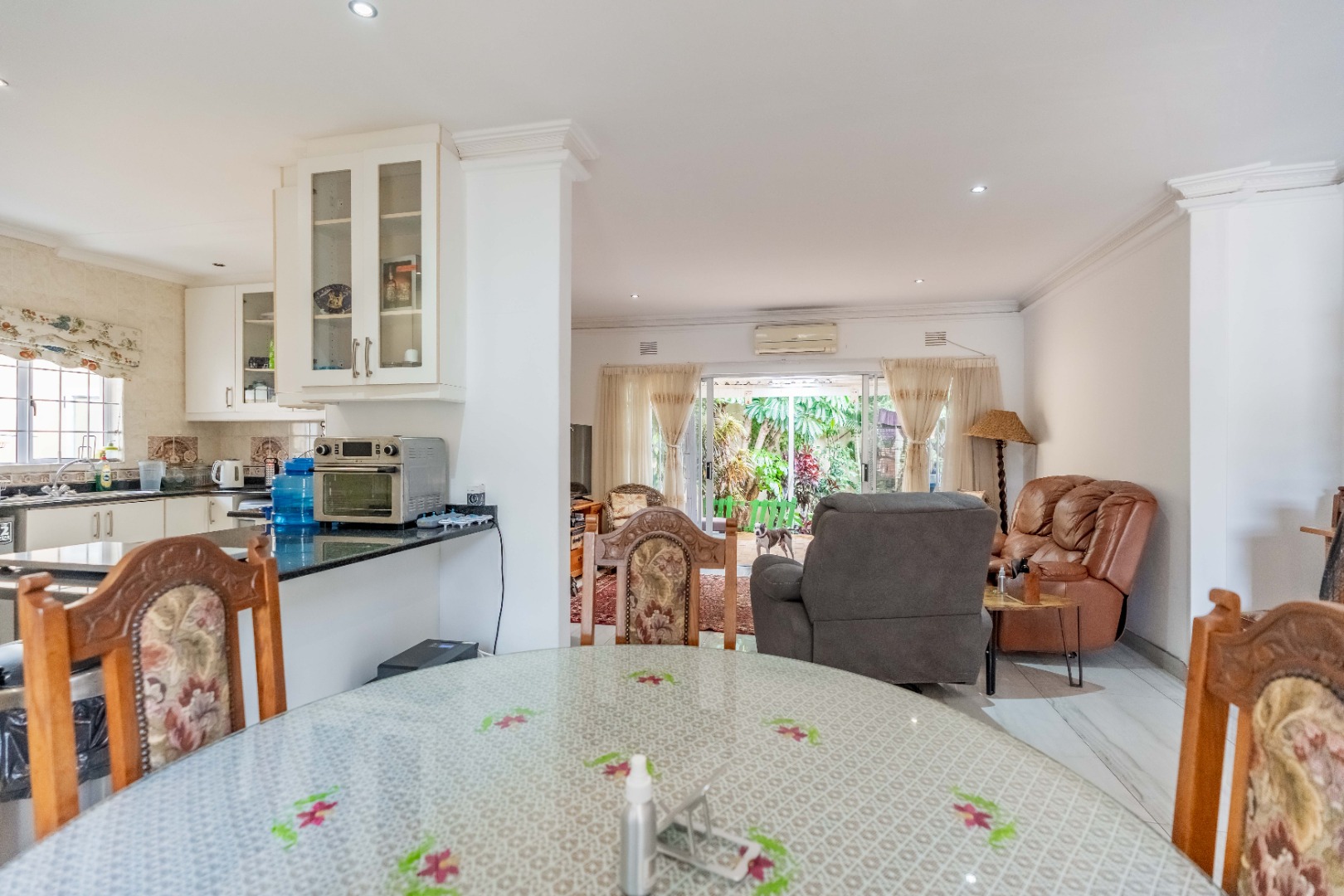 Step inside to an open-plan living area, characterized by bright white tiled flooring and neutral walls, creating a welcoming atmosphere. The home boasts a well-appointed kitchen, a dedicated dining room, and a spacious lounge, all benefiting from ample natural light and air conditioning for year-round comfort.