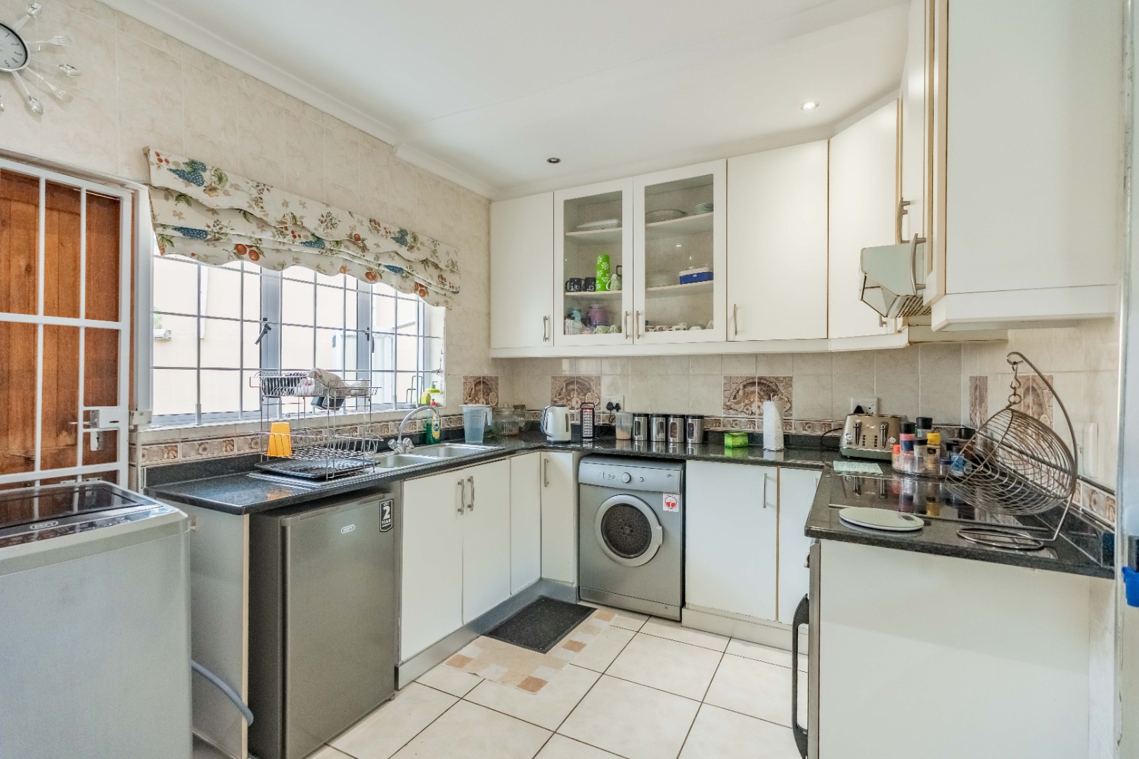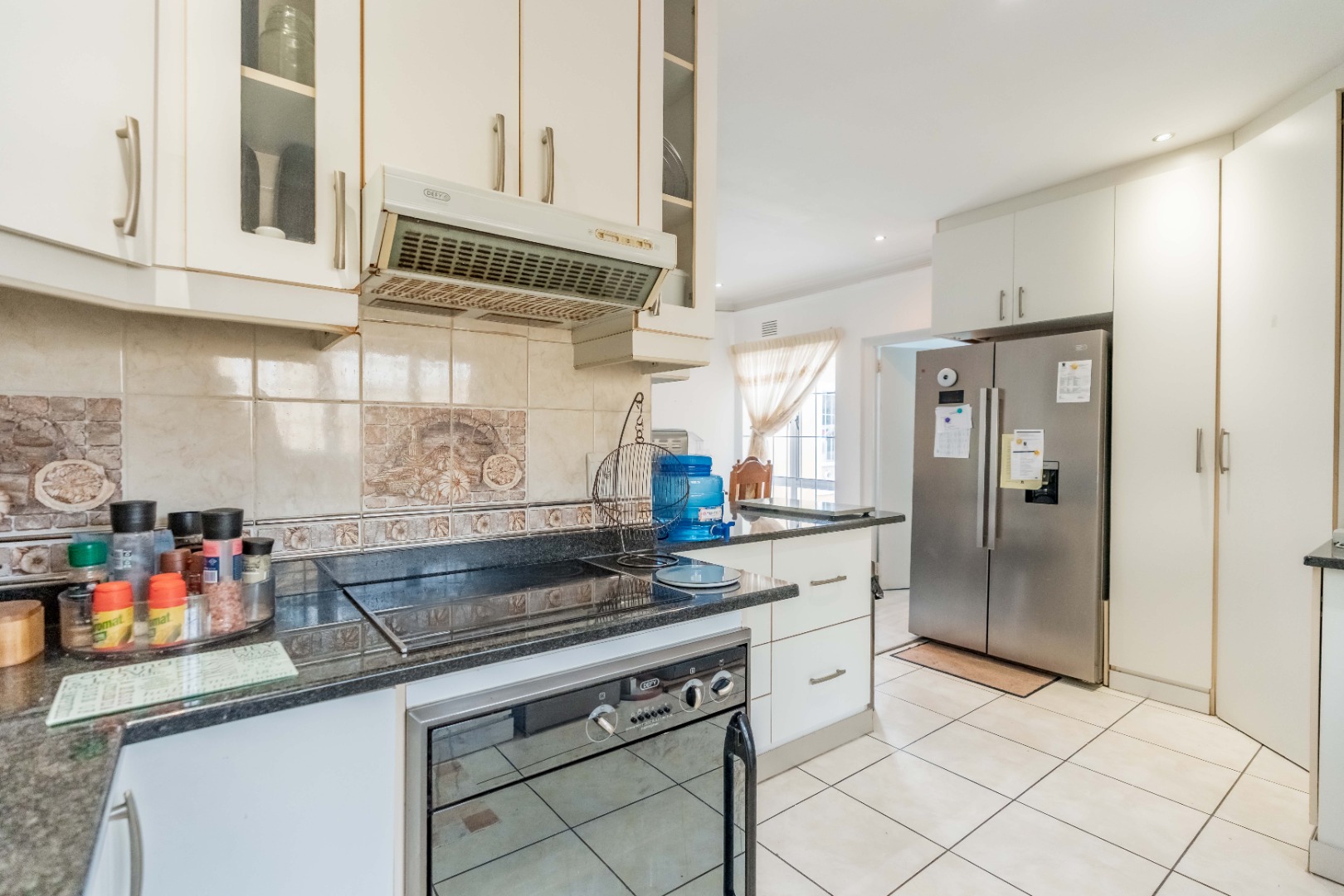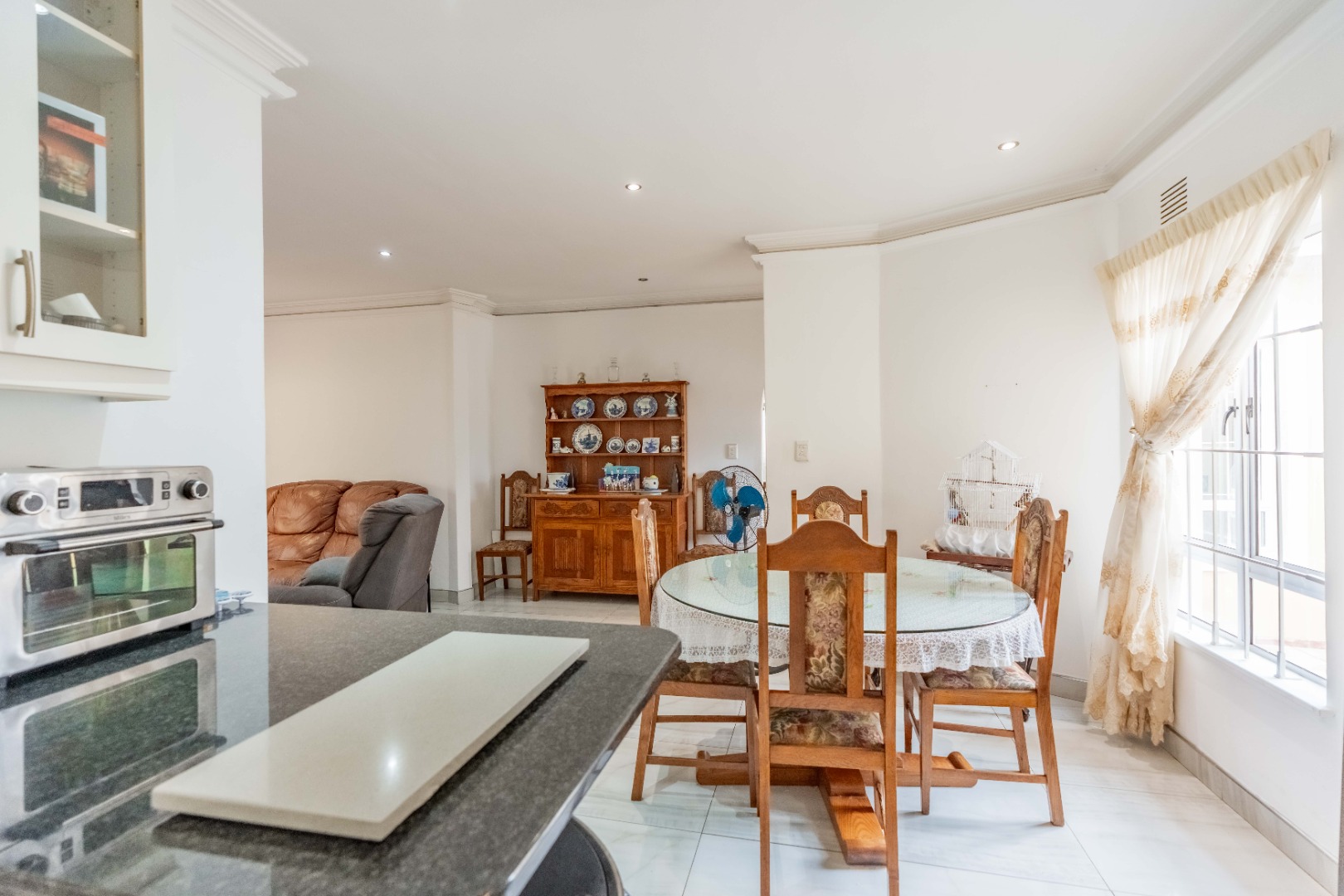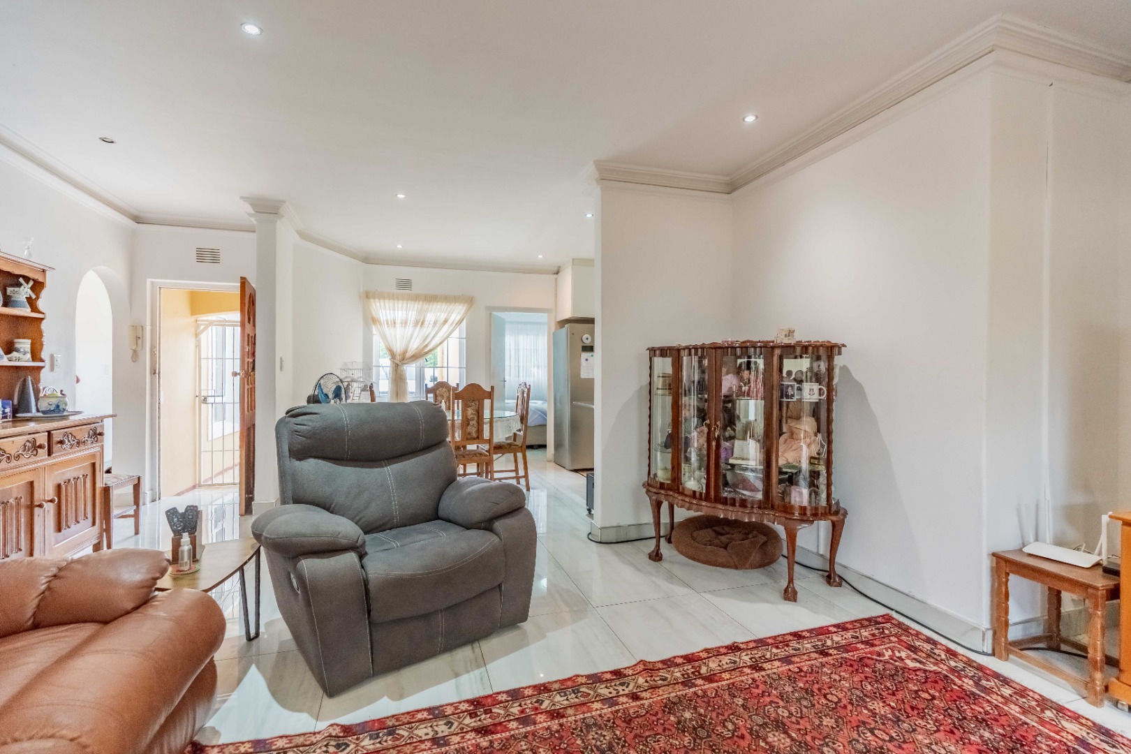 Step inside to an open-plan living area, characterized by bright white tiled flooring and neutral walls, creating a welcoming atmosphere. The home boasts a well-appointed kitchen, a dedicated dining room, and a spacious lounge, all benefiting from ample natural light and air conditioning for year-round comfort.
