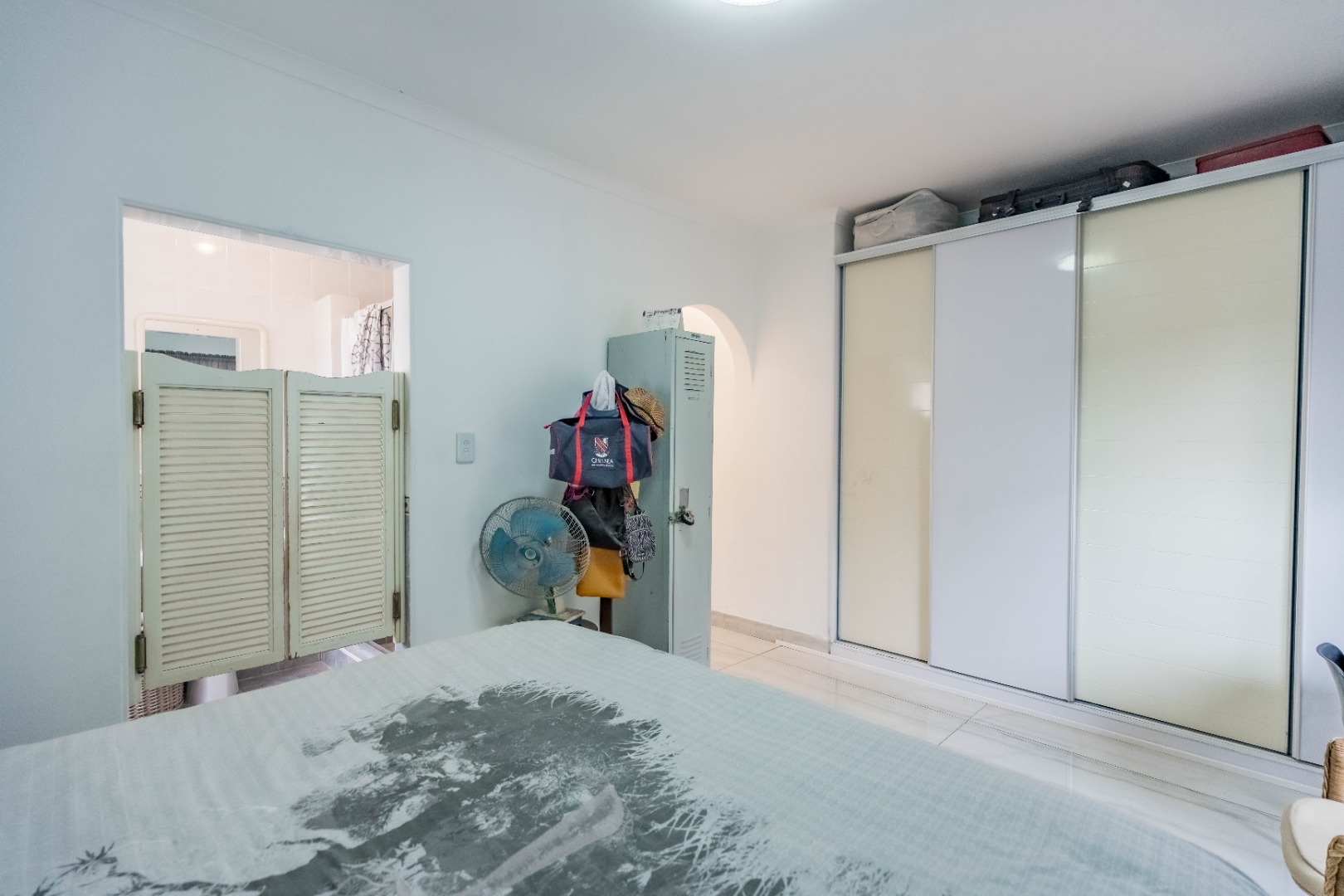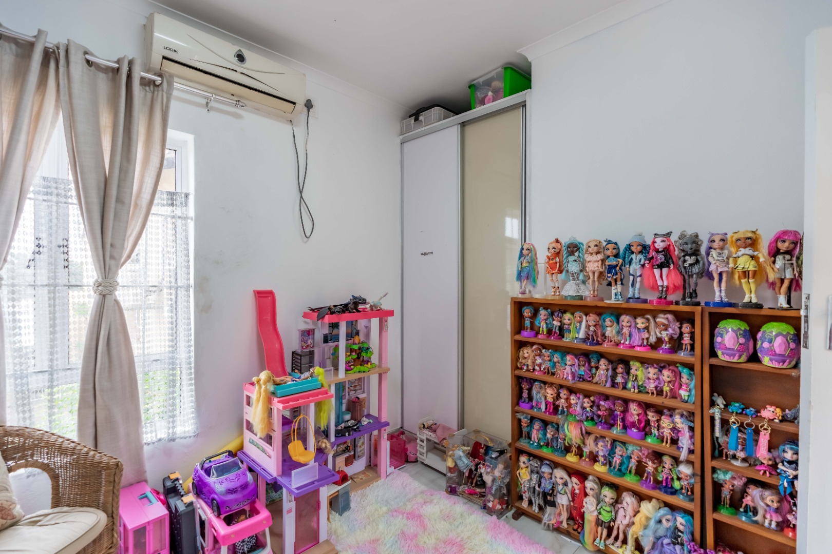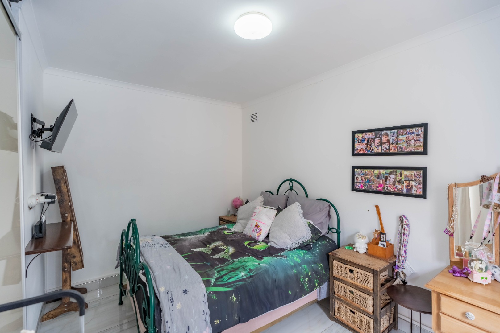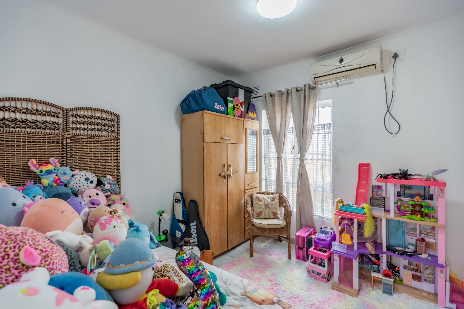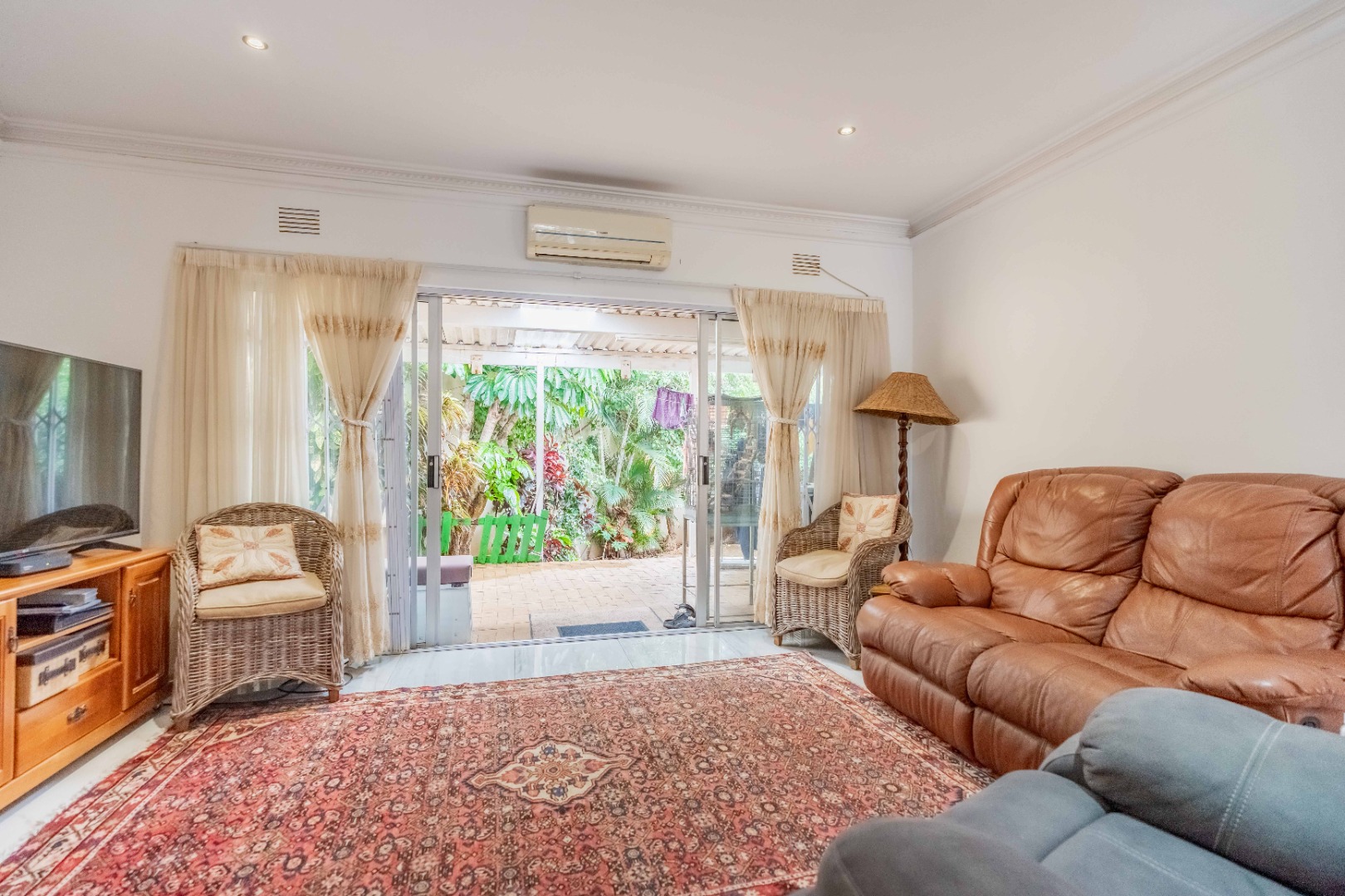 Step inside to an open-plan living area, characterized by bright white tiled flooring and neutral walls, creating a welcoming atmosphere. The home boasts a well-appointed kitchen, a dedicated dining room, and a spacious lounge, all benefiting from ample natural light and air conditioning for year-round comfort.