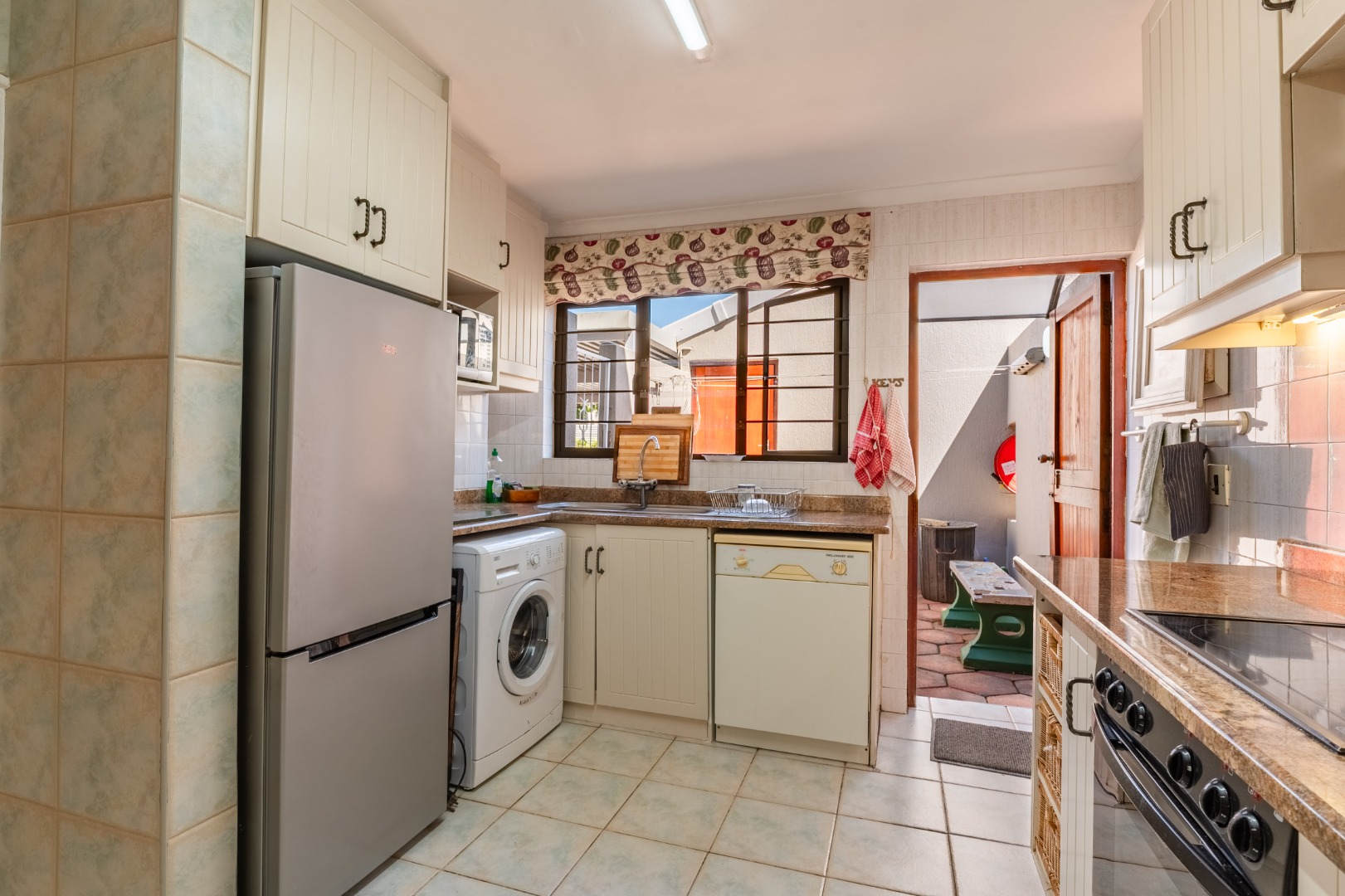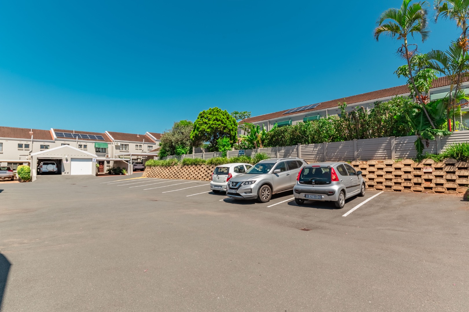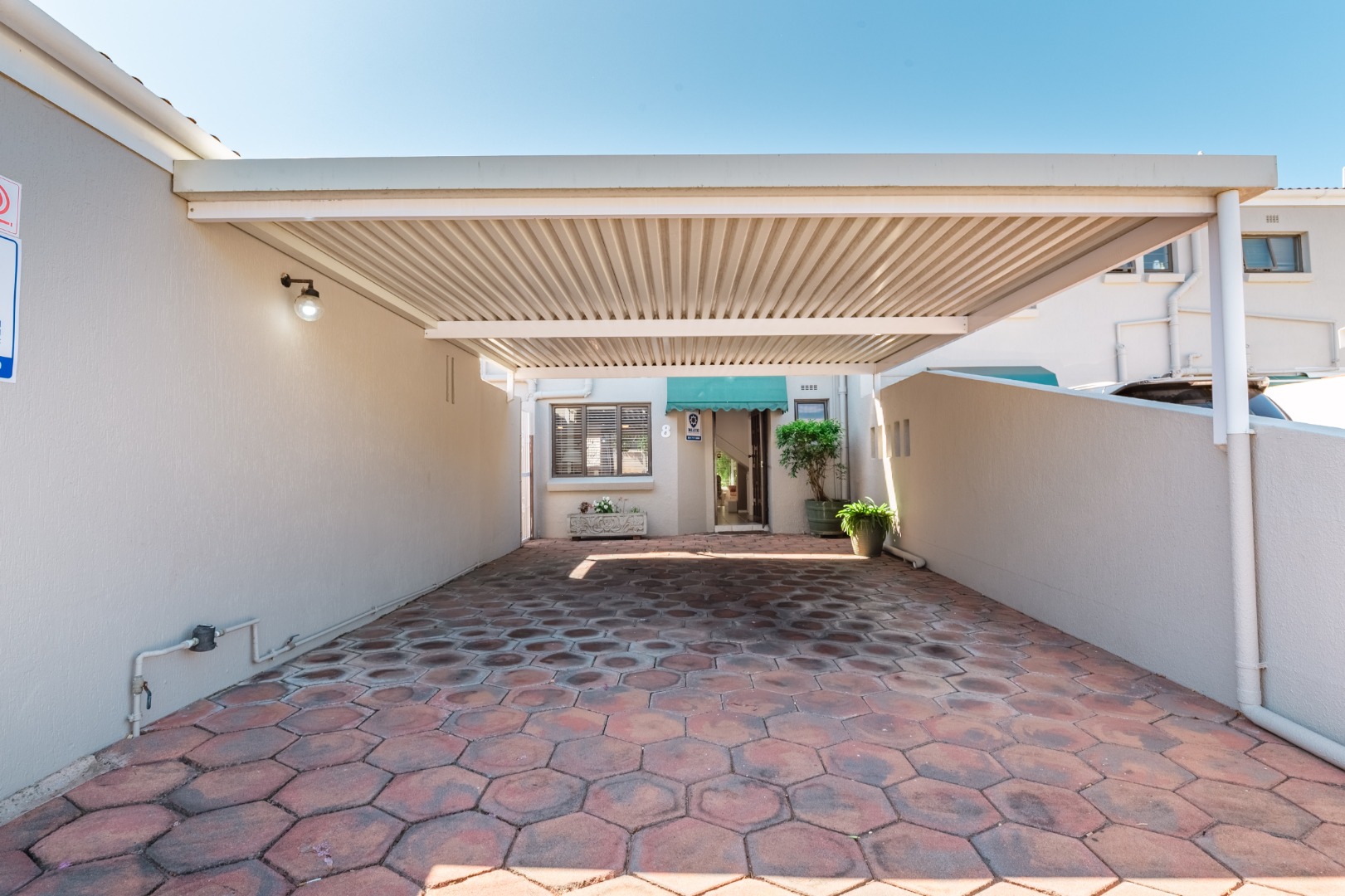 Step outside to a private patio, ideal for relaxation, overlooking a refreshing charming garden. The property further benefits a communal pool and braai area, enhancing outdoor enjoyment. A notable feature is the upstairs sea view. Practical amenities include one garage, double carport, ample visitors parking, a driveway, electric fencing, an access gate, intercom, and burglar bars, ensuring both convenience and security.