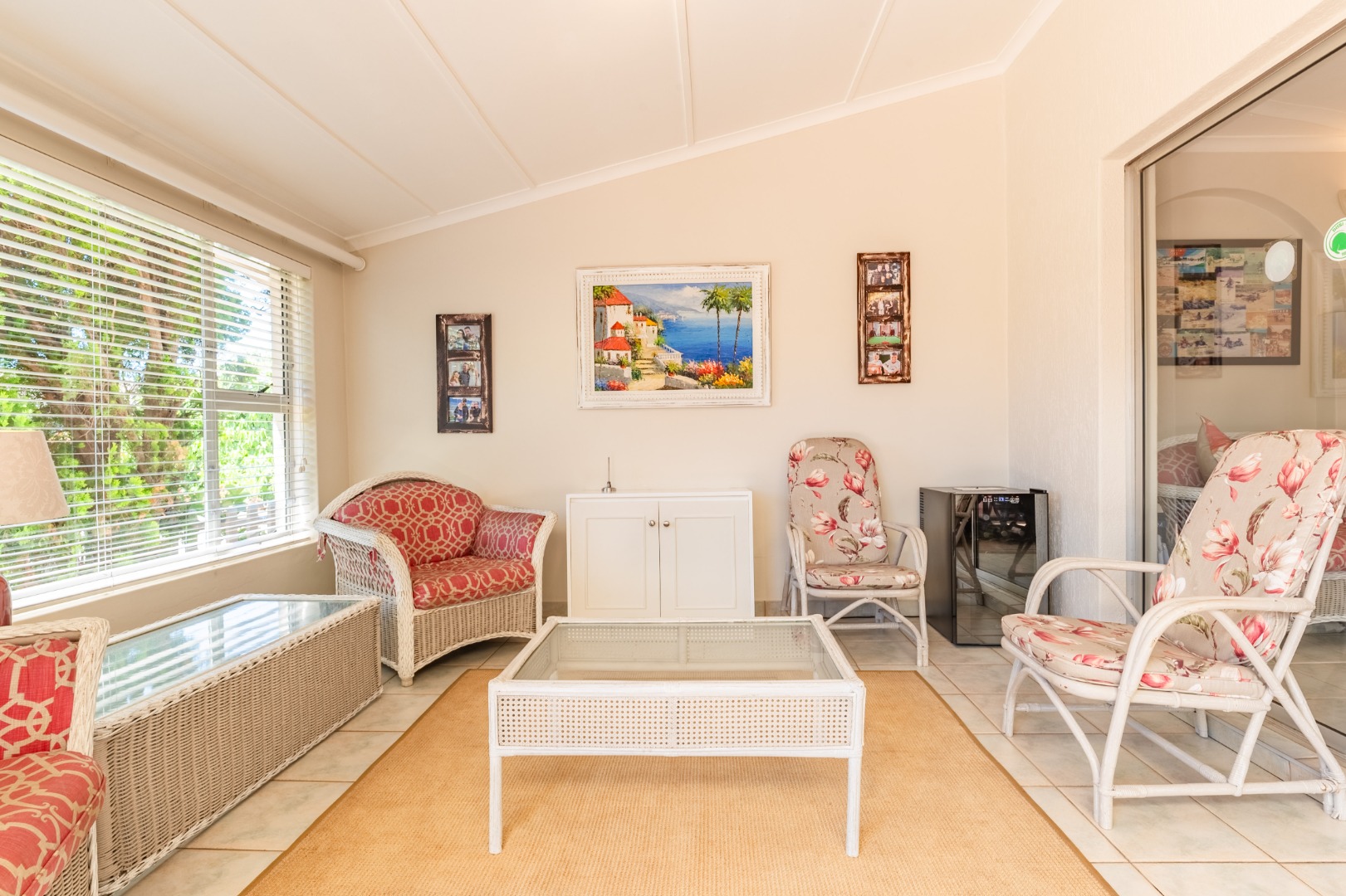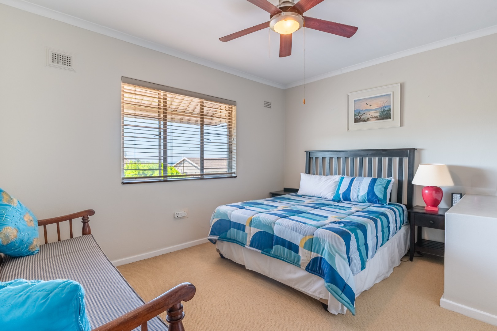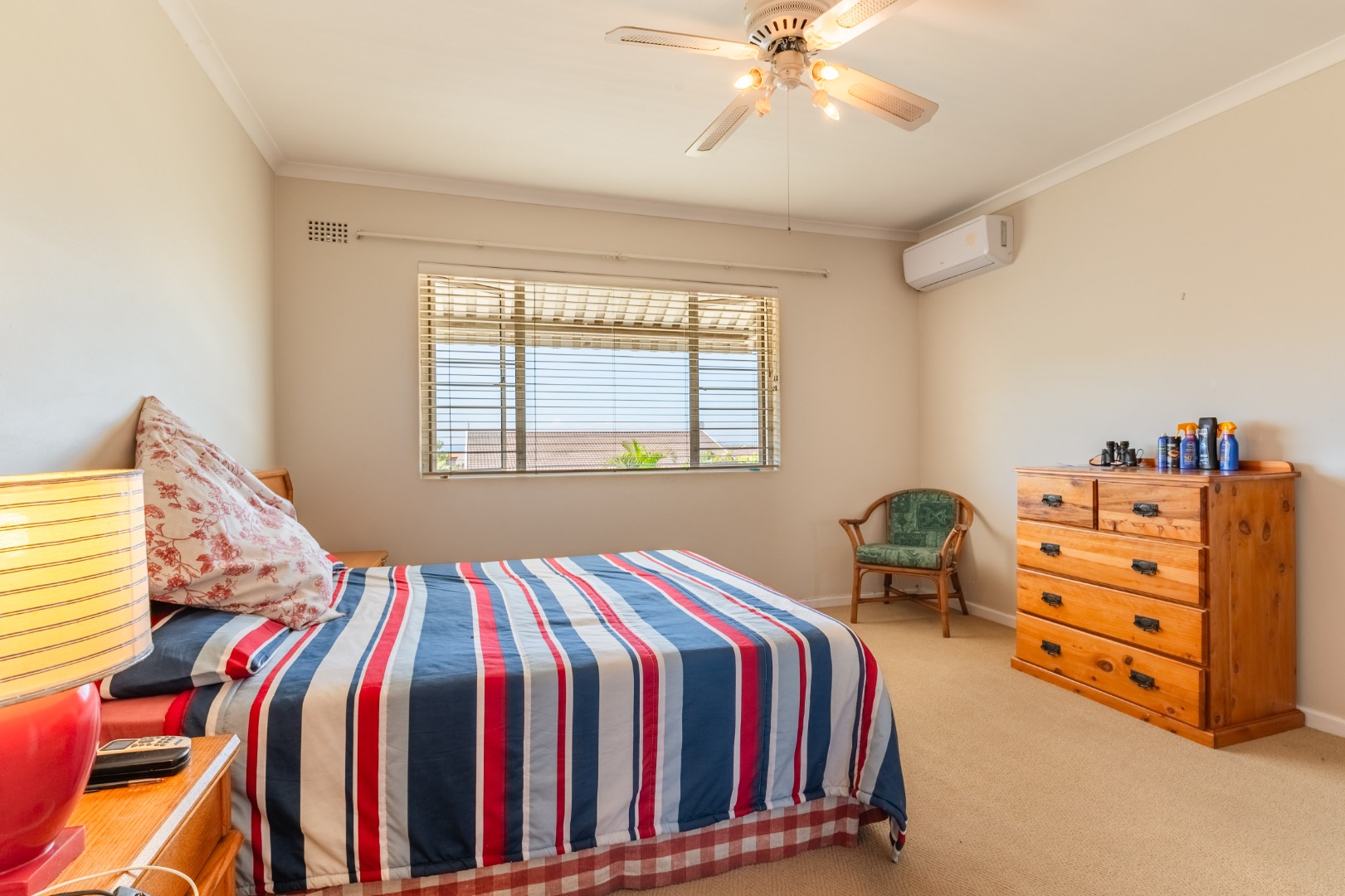 Step outside to a private patio, ideal for relaxation, overlooking a refreshing charming garden. The property further benefits a communal pool and braai area, enhancing outdoor enjoyment. A notable feature is the upstairs sea view. Practical amenities include one garage, double carport, ample visitors parking, a driveway, electric fencing, an access gate, intercom, and burglar bars, ensuring both convenience and security.