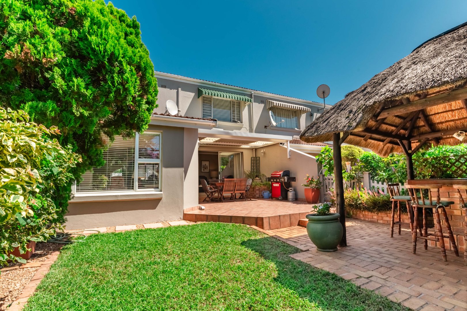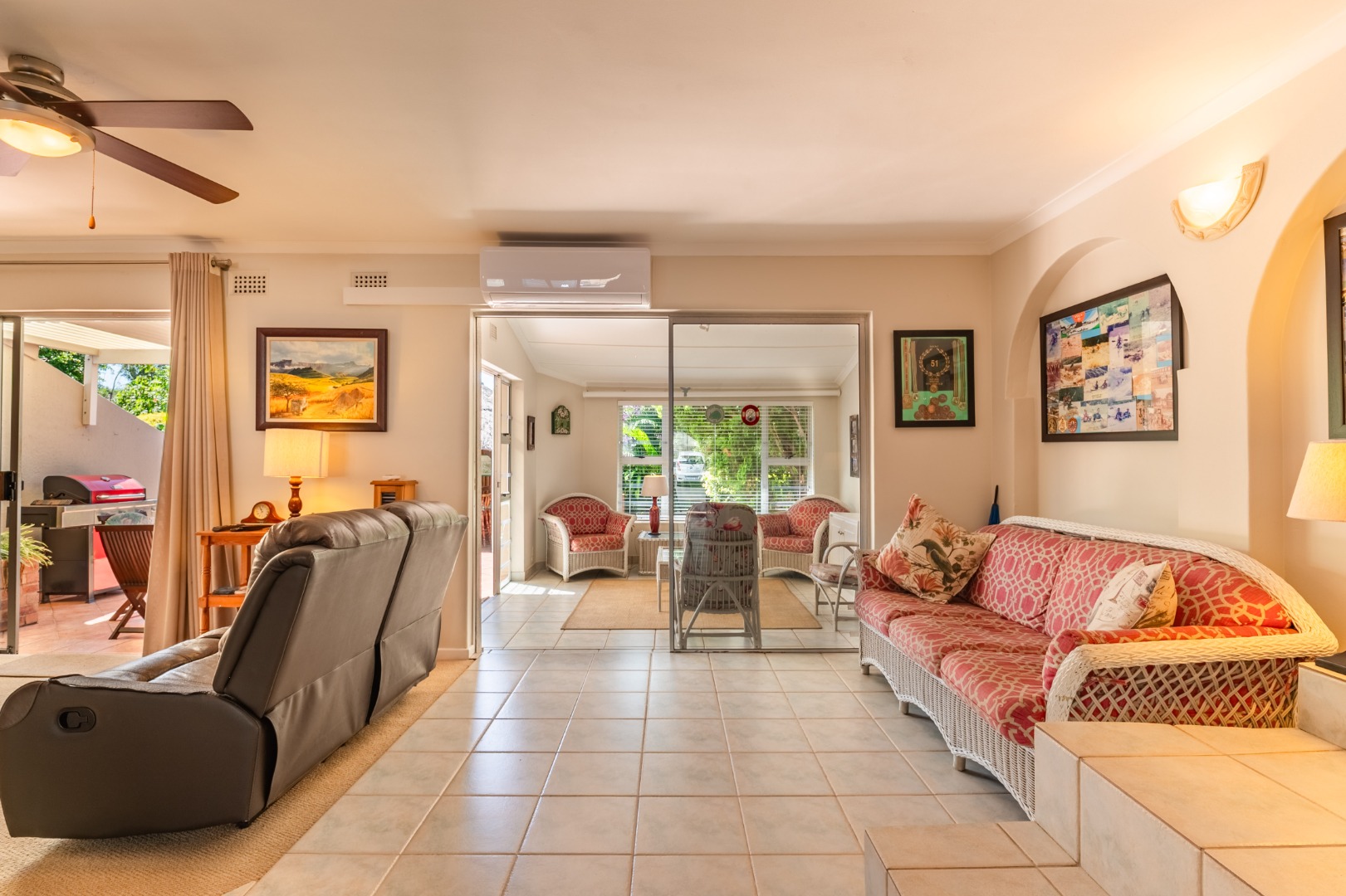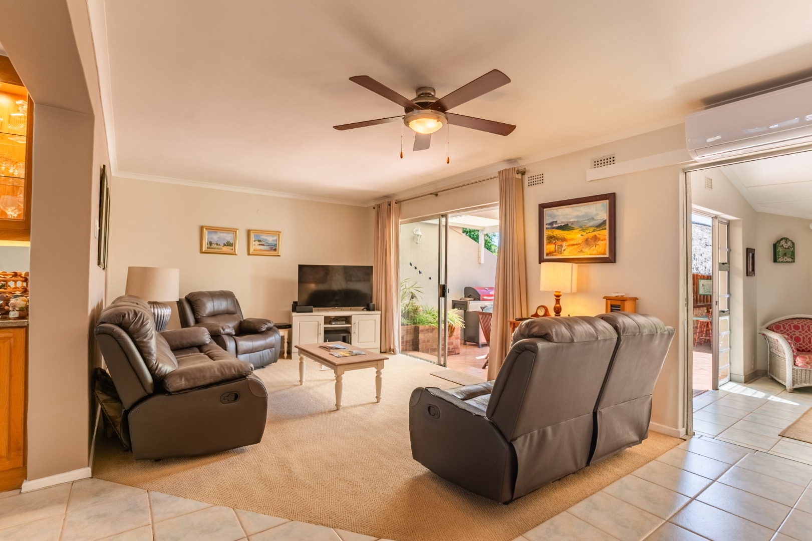 The interior features a well-appointed kitchen, a dedicated dining room, and a spacious lounge, complemented by an additional family TV room for versatile living. Enjoy year-round comfort with air conditioning and a cozy fireplace. The property also boasts a built-in outside bar, perfect for entertaining guests, with sliding doors seamlessly connecting indoor and outdoor spaces.