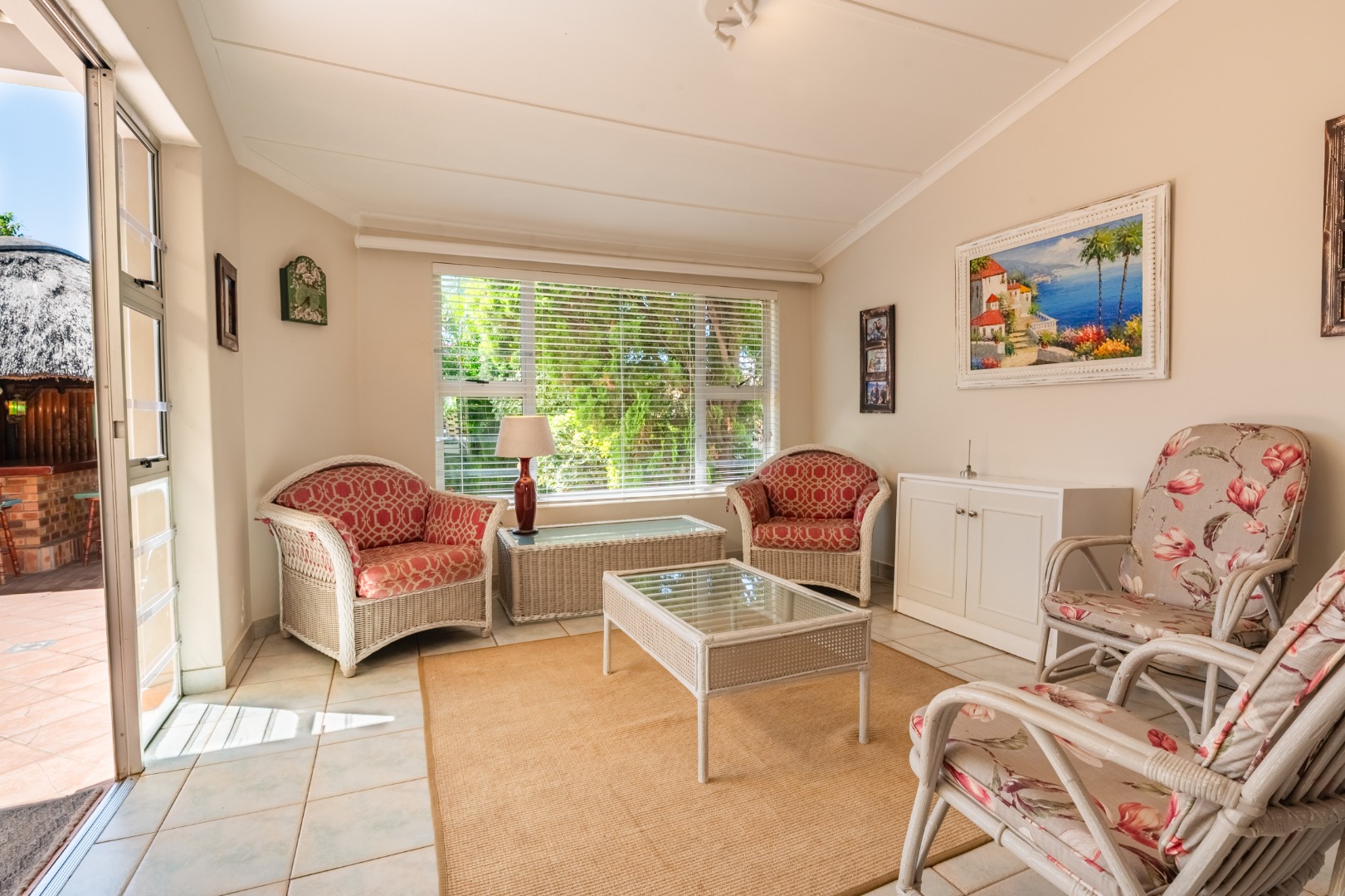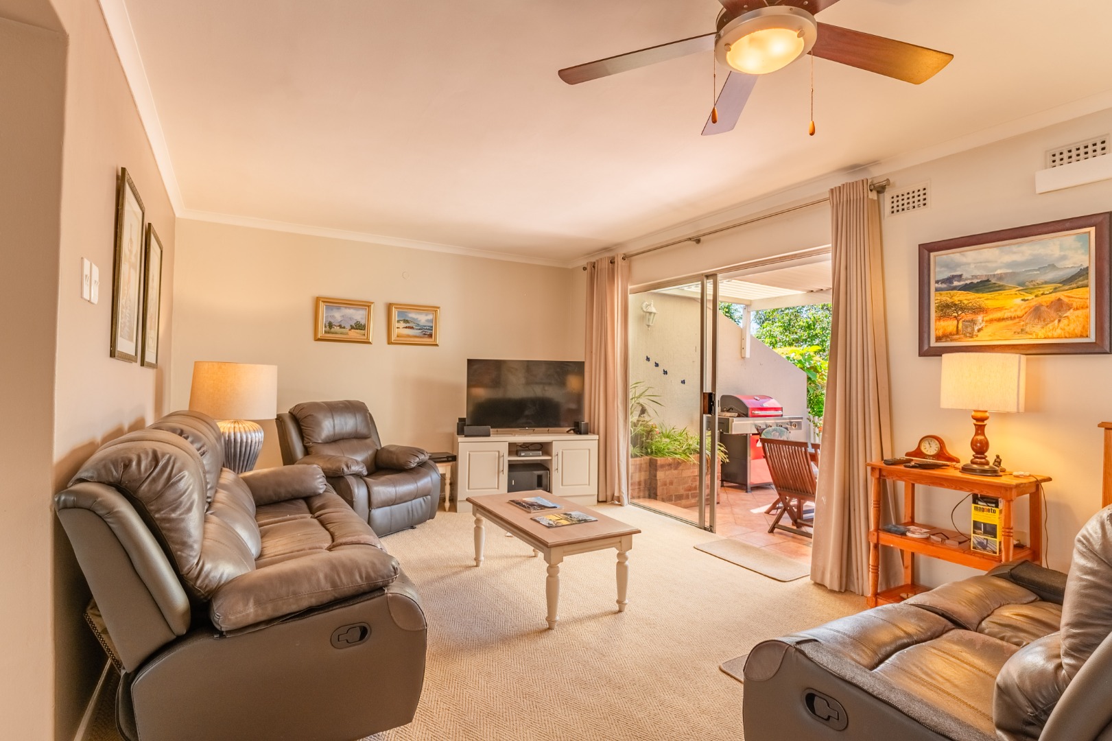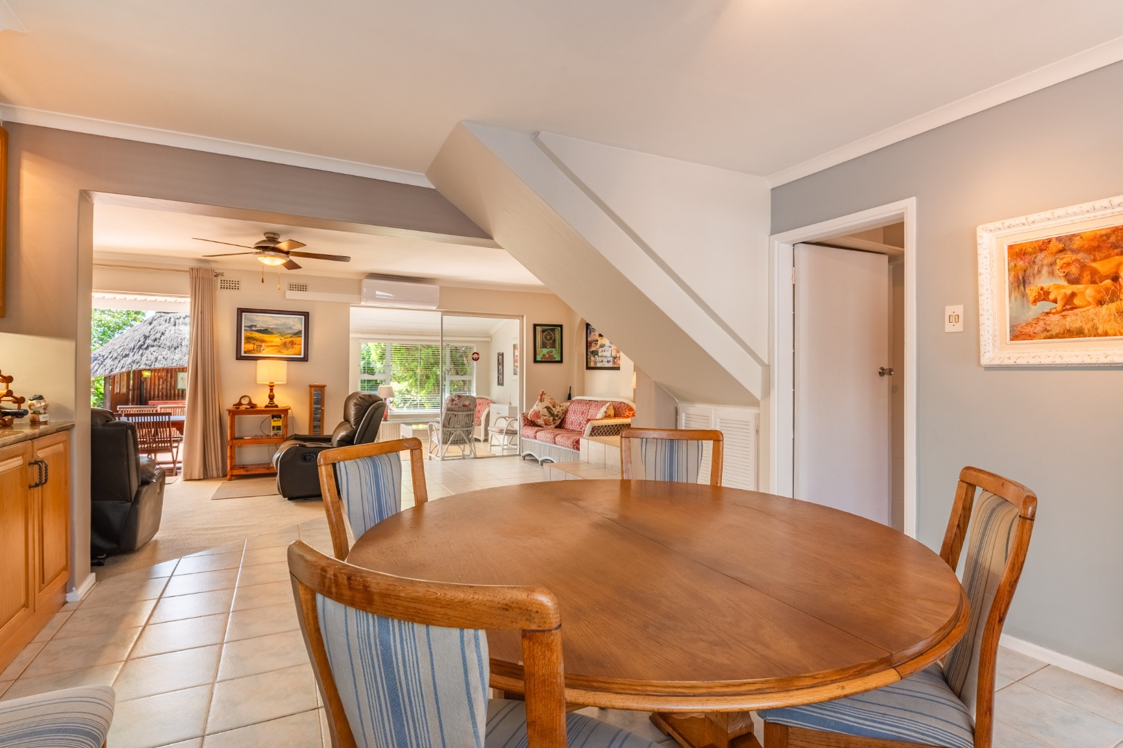 The interior features a well-appointed kitchen, a dedicated dining room, and a spacious lounge, complemented by an additional family TV room for versatile living. Enjoy year-round comfort with air conditioning and a cozy fireplace. The property also boasts a built-in outside bar, perfect for entertaining guests, with sliding doors seamlessly connecting indoor and outdoor spaces.