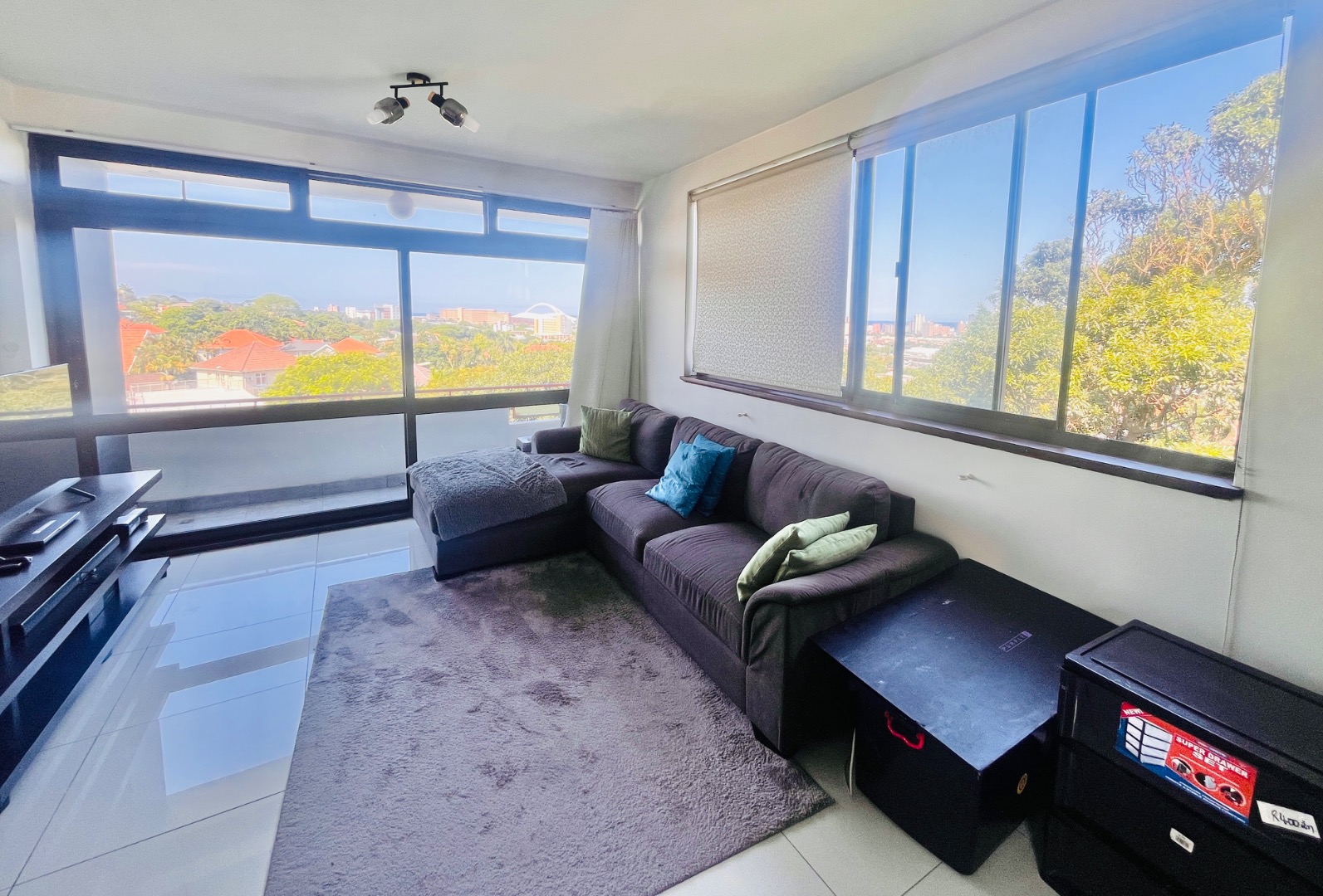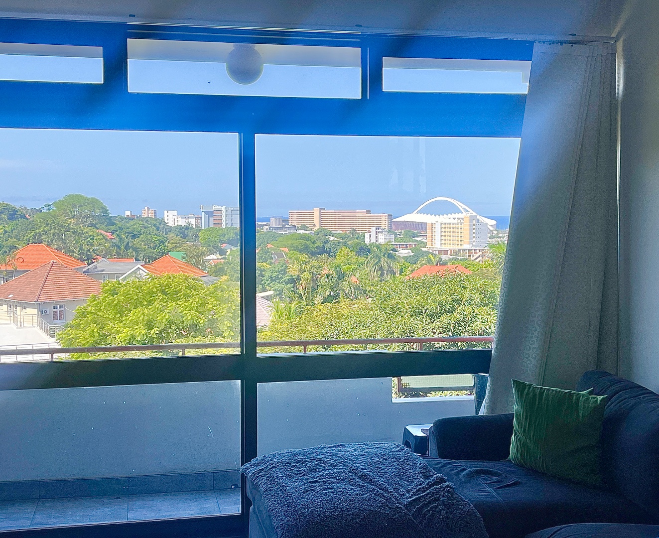 The open plan kitchen is newly renovated, modern and fully fitted, and leads onto a comfortable lounge with a fair sized balcony where you can take in the most beautiful view across the city, the stadium and the sea.