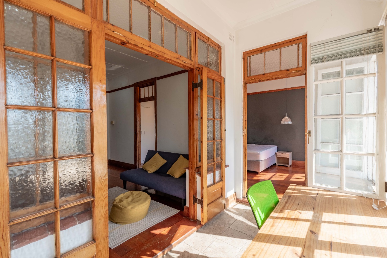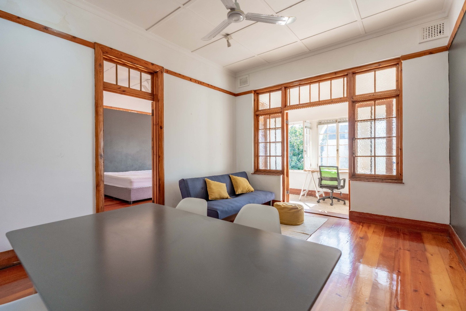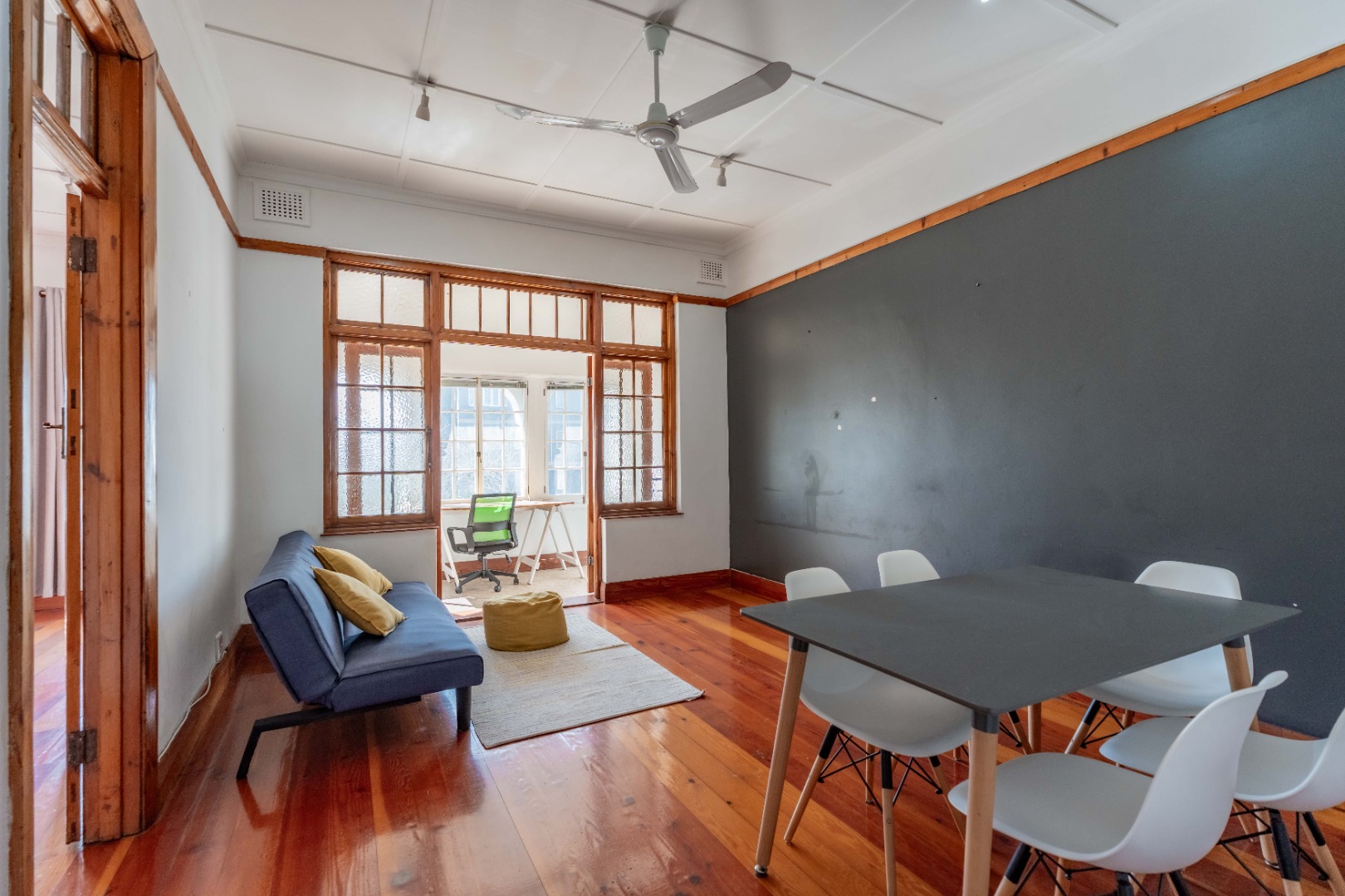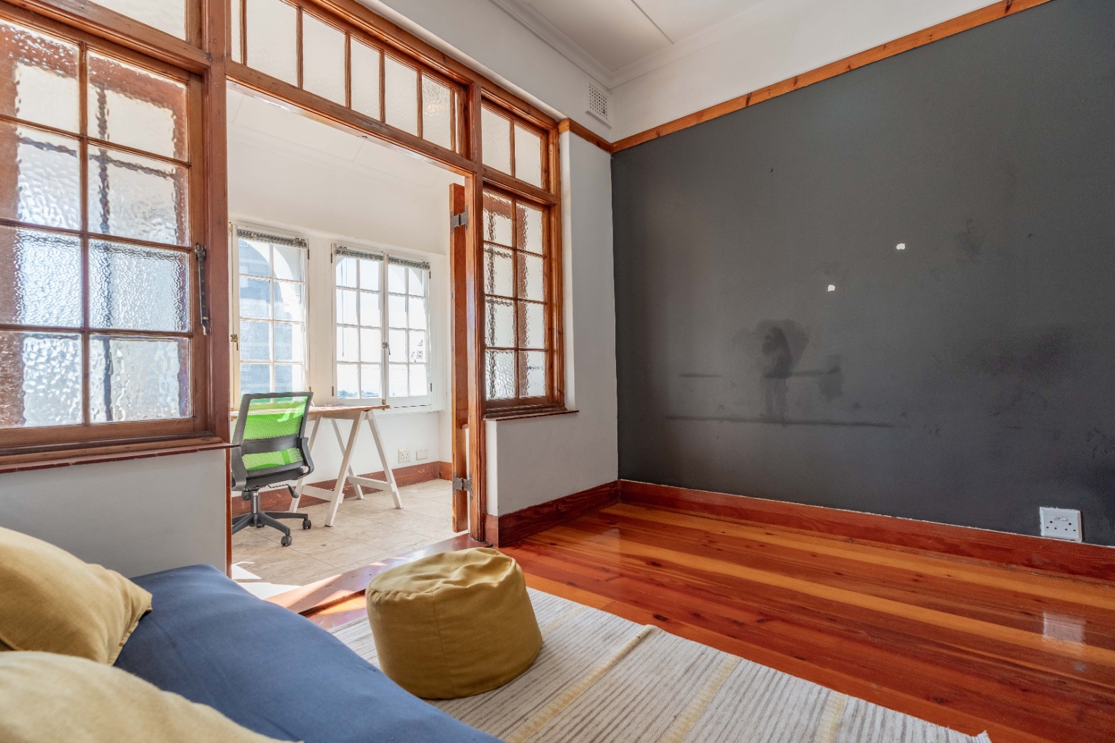 The expansive lounge and living area features original wooden skirting, ceiling fans, and beautifully maintained floors. Double glass doors open into a sunny half-bedroom or study—a versatile space filled with natural light, ideal for a home office, creative studio, or quiet reading nook.