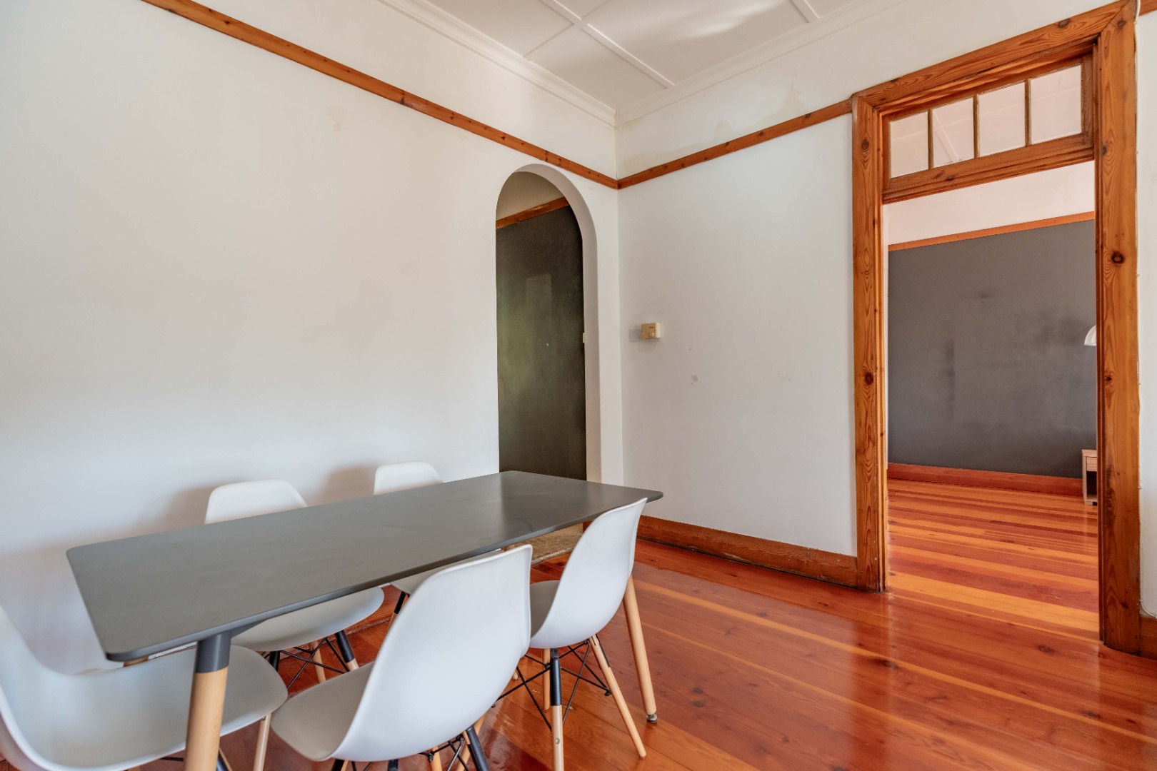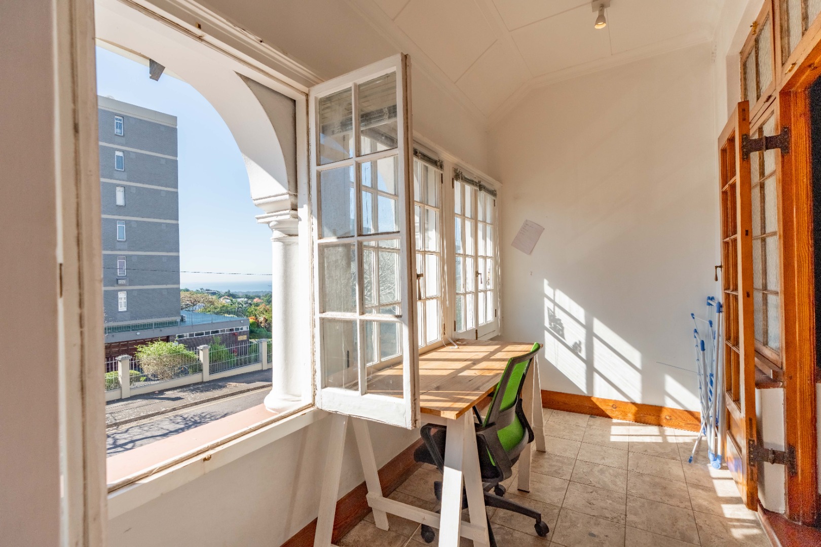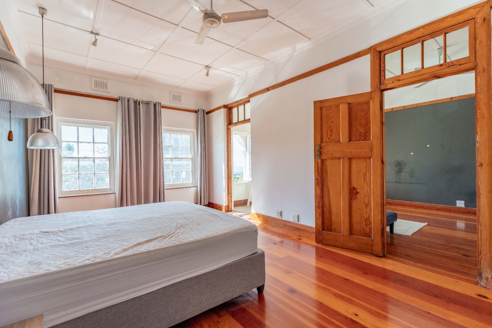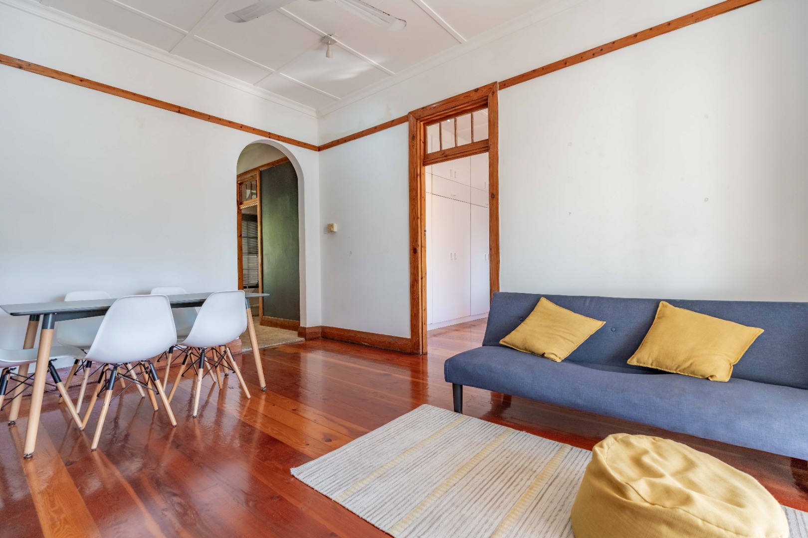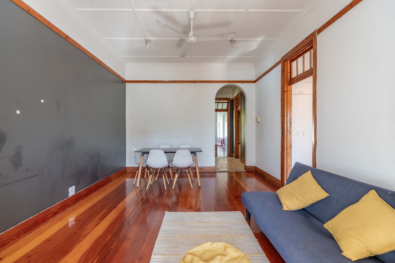 The expansive lounge and living area features original wooden skirting, ceiling fans, and beautifully maintained floors. Double glass doors open into a sunny half-bedroom or study—a versatile space filled with natural light, ideal for a home office, creative studio, or quiet reading nook.