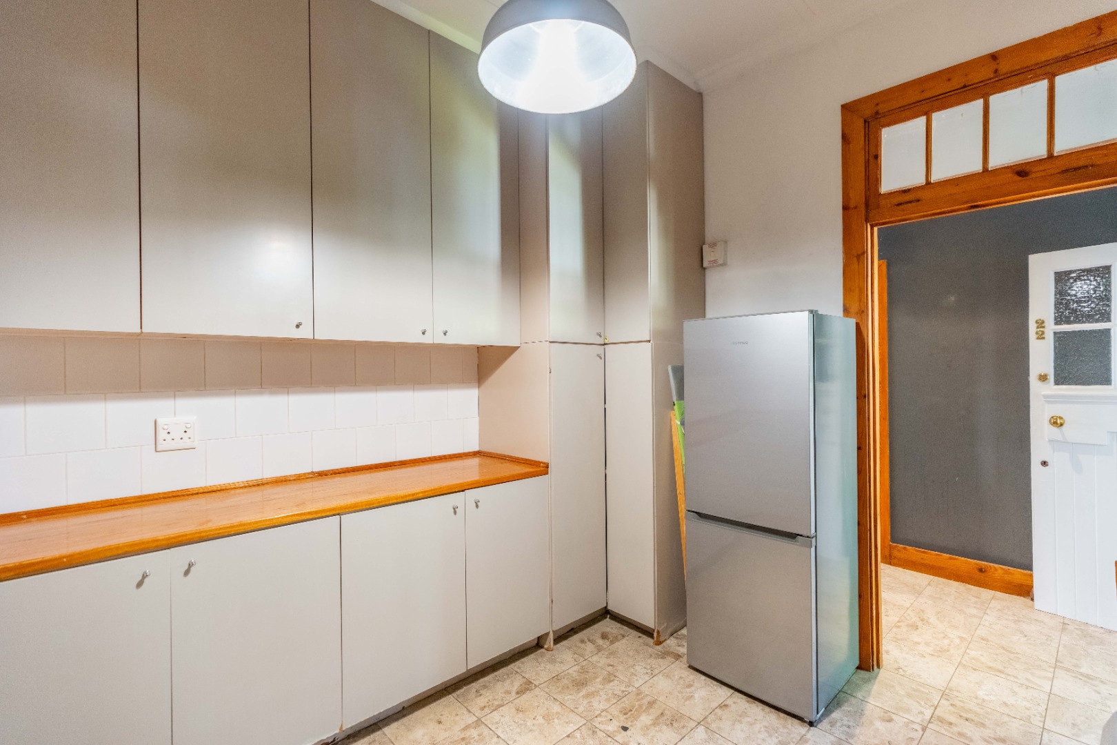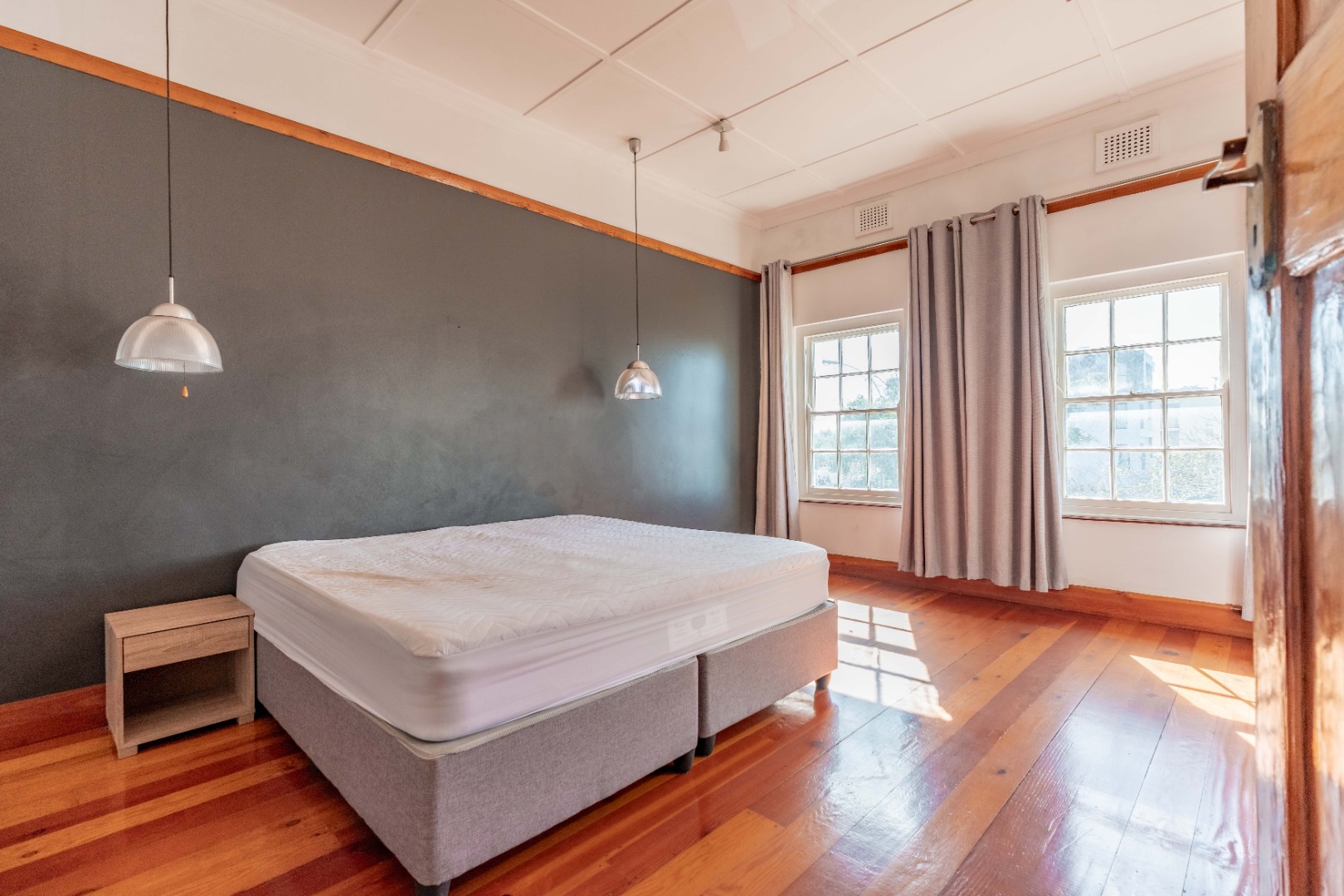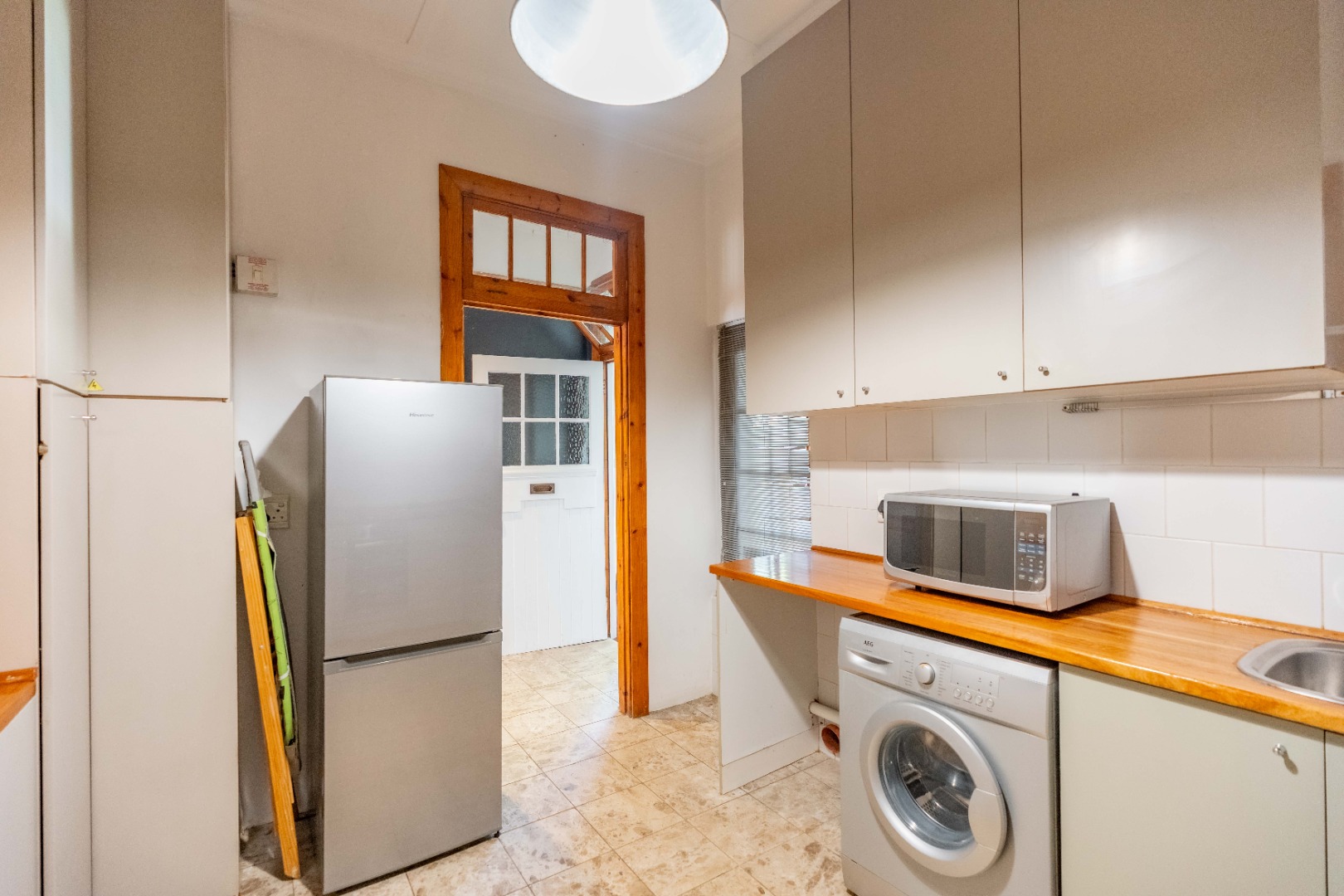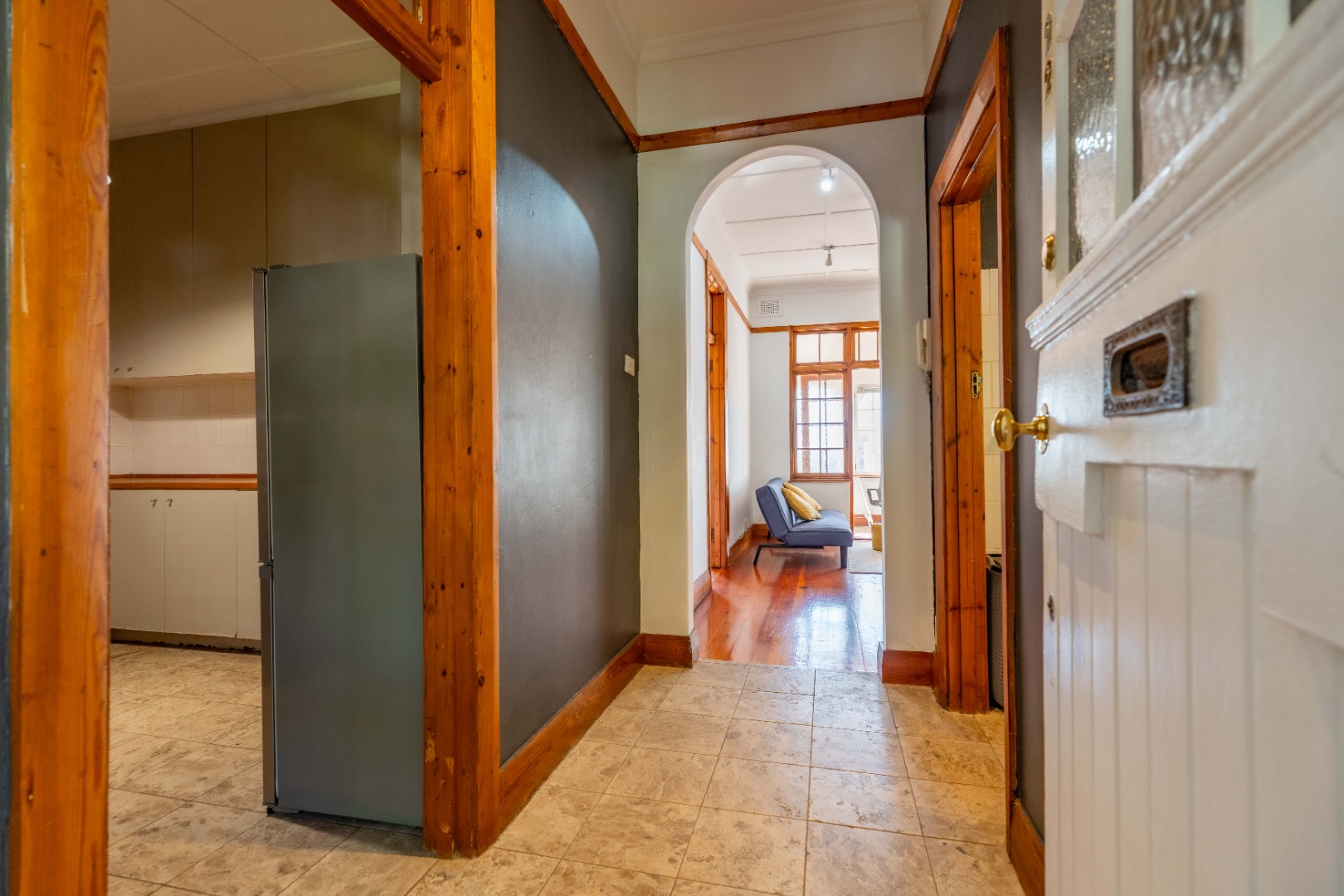 The expansive lounge and living area features original wooden skirting, ceiling fans, and beautifully maintained floors. Double glass doors open into a sunny half-bedroom or study—a versatile space filled with natural light, ideal for a home office, creative studio, or quiet reading nook.