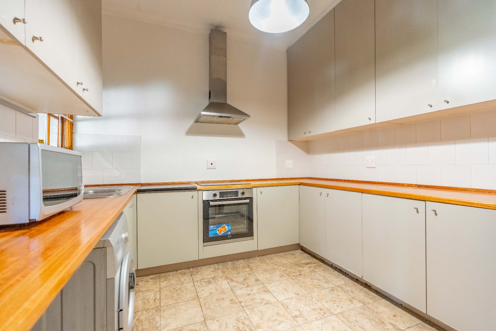 A grand white front door opens into a welcoming entrance hall that flows into a wide passageway, guiding you toward the heart of the home. The kitchen is exceptionally spacious, offering ample storage and room for all appliances, including space for a dishwasher and washing machine. It is fitted with an electric stove and hob, complemented by a double sink basin—perfectly suited for functionality and ease.