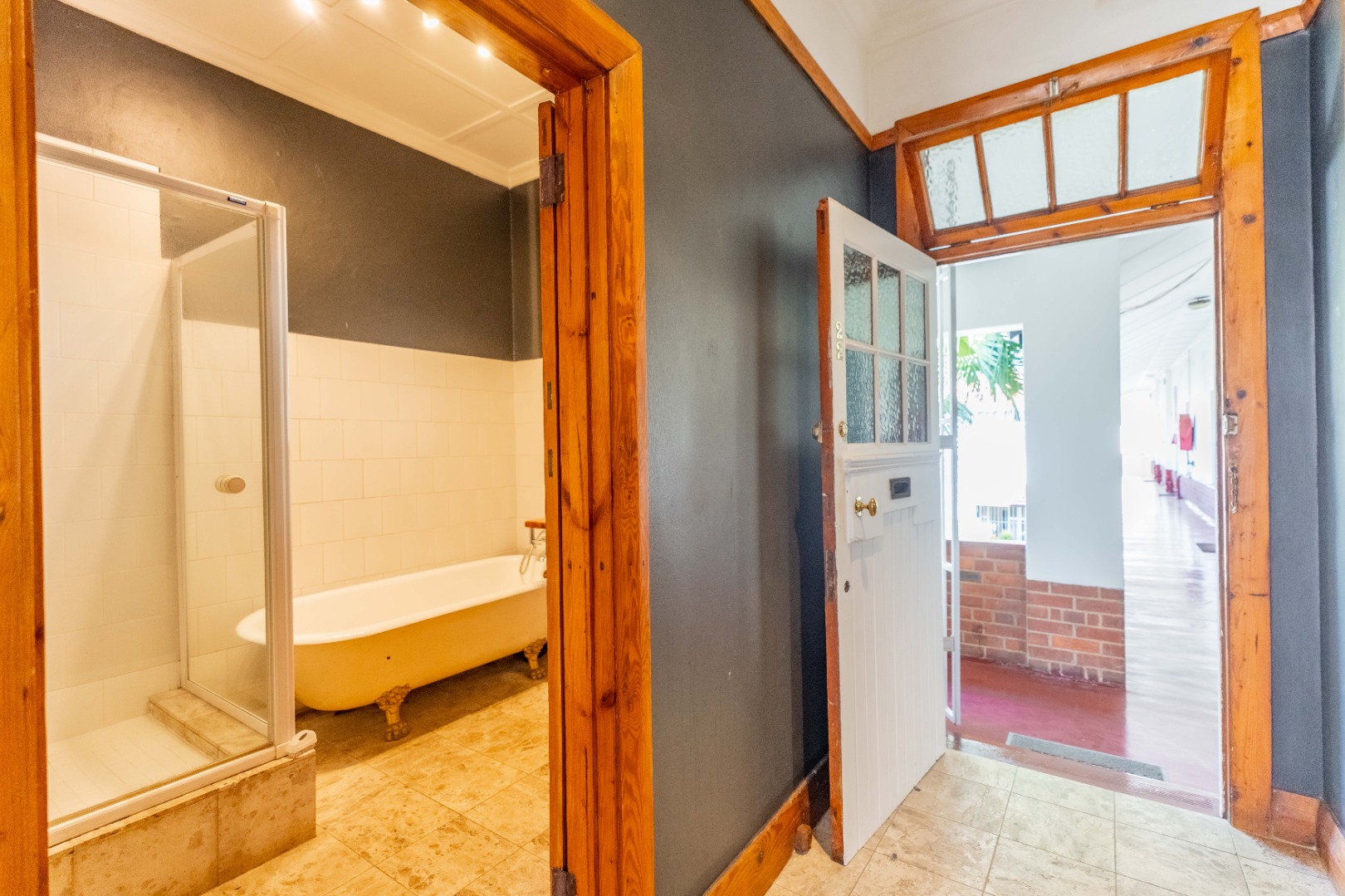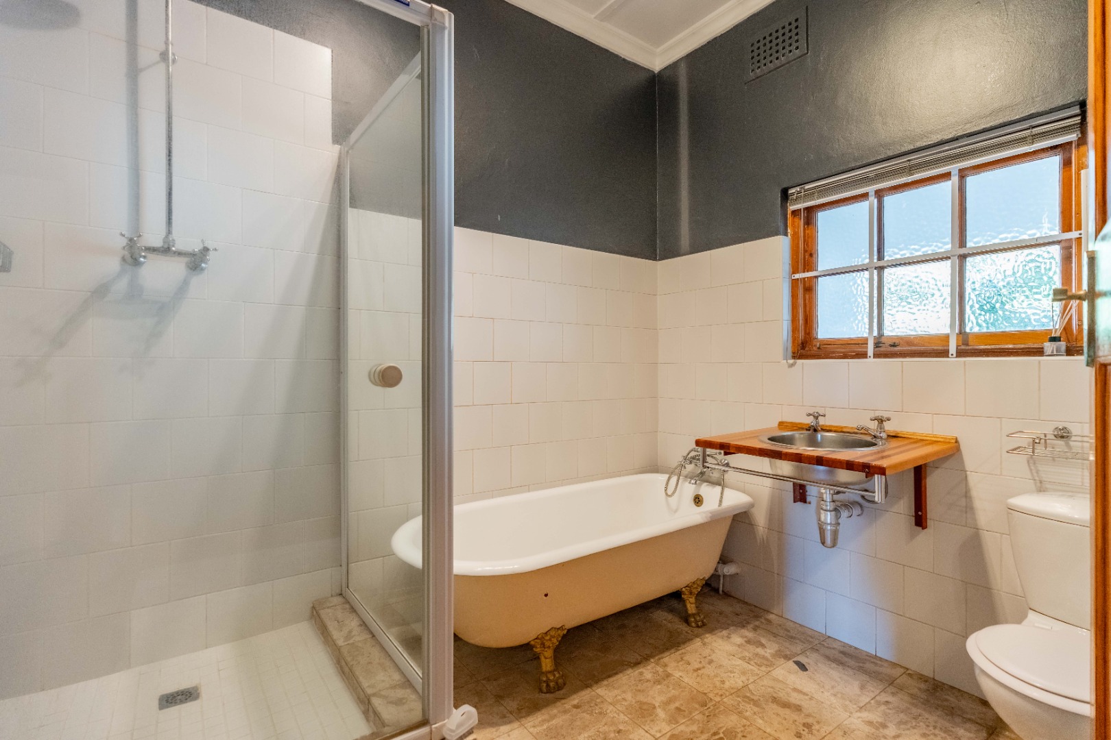 The family bathroom is tastefully designed with clean white tiling and charcoal grey feature walls, creating a sophisticated atmosphere. It includes a classic Victorian-style bathtub, walk-in shower, and toilet.