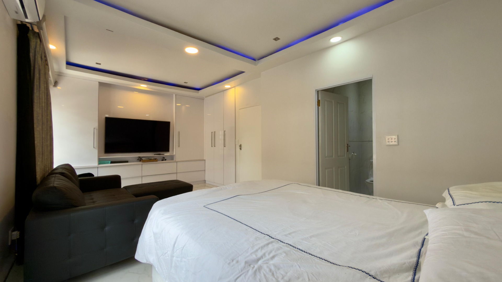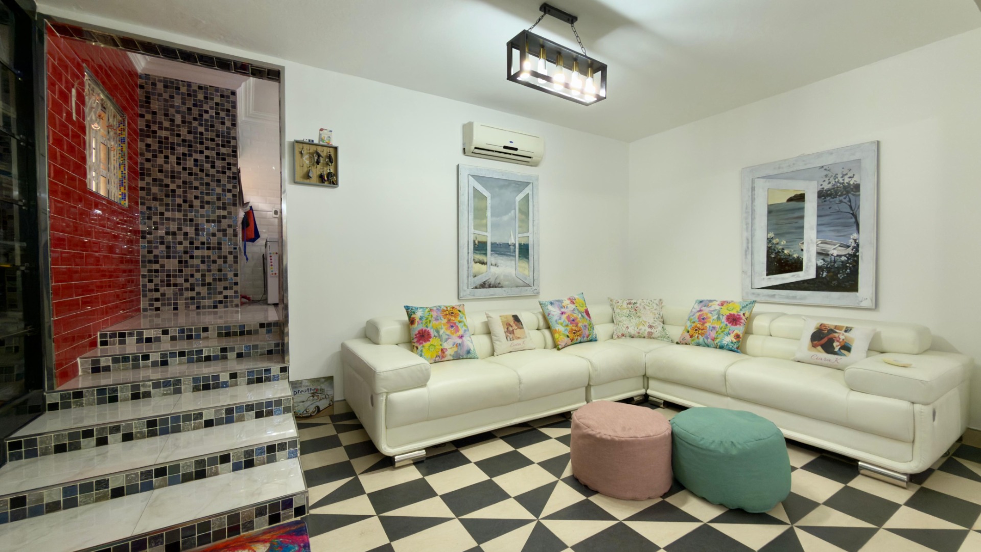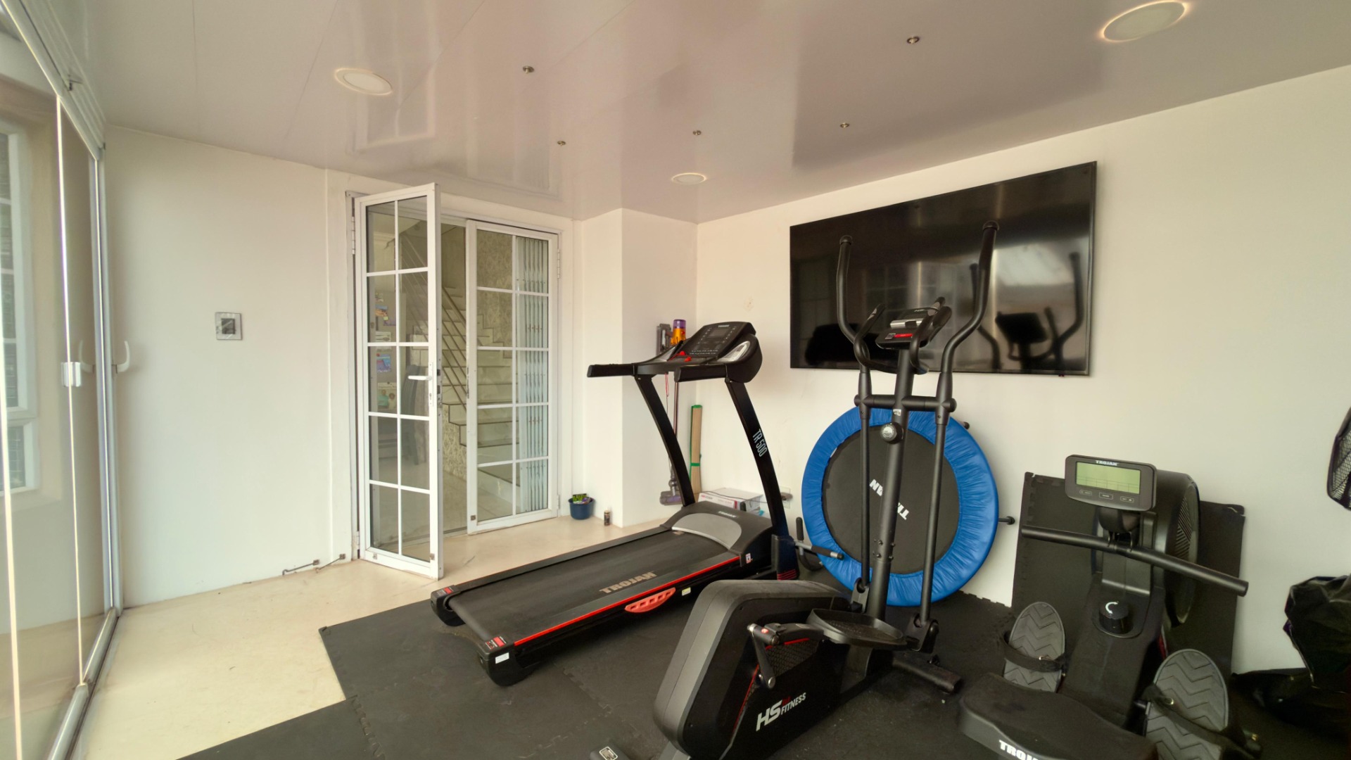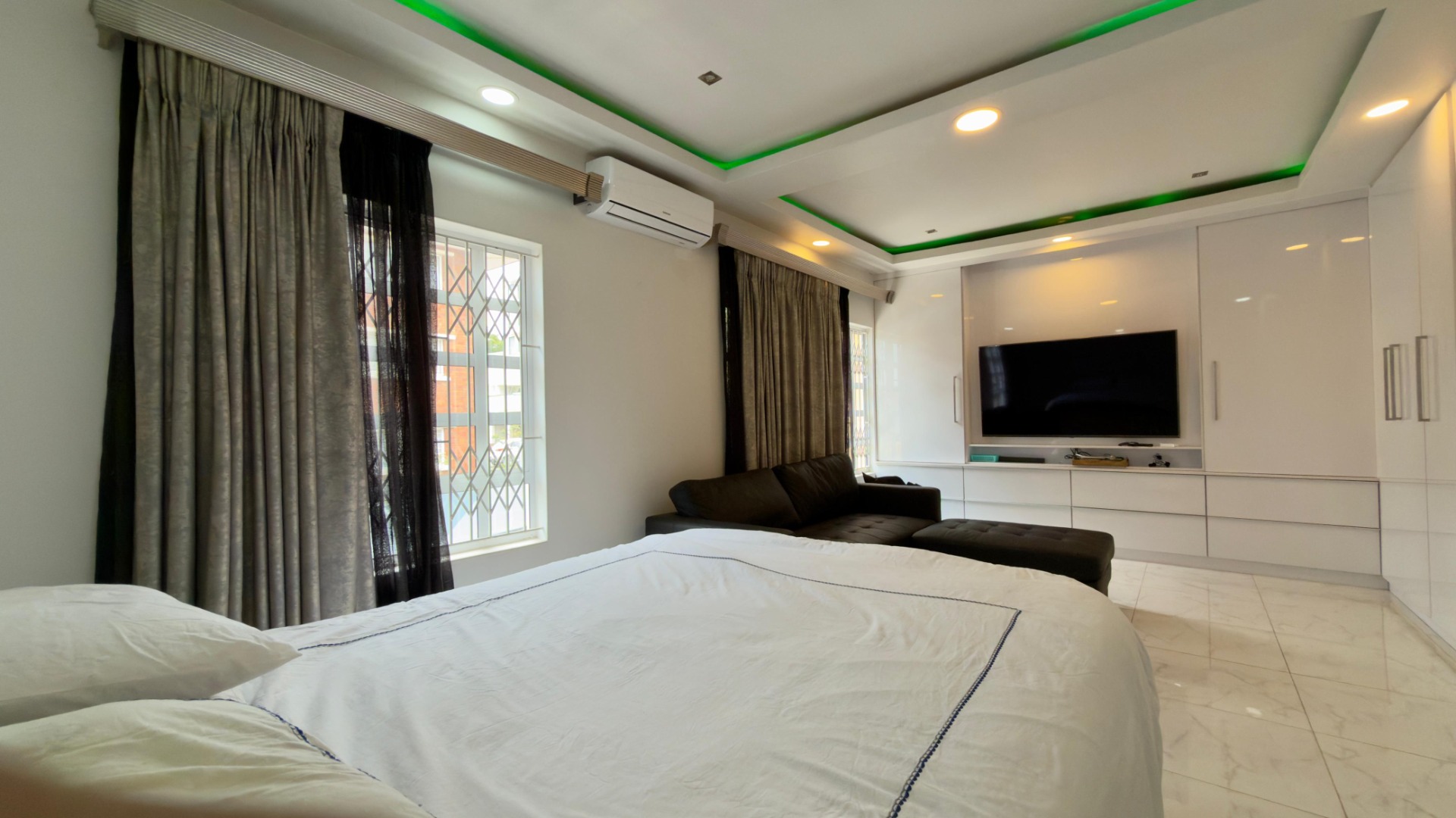 The real highlight is the huge outdoor area: a Jacuzzi relaxes under the stars, and there’s a separate, enclosed gym for working out. A water tank with pumps and filters ensures water security, and 16 solar panels (with a battery) power the home for 6–8 hours when there is load shedding . A fully functional camera system keeps things secure.