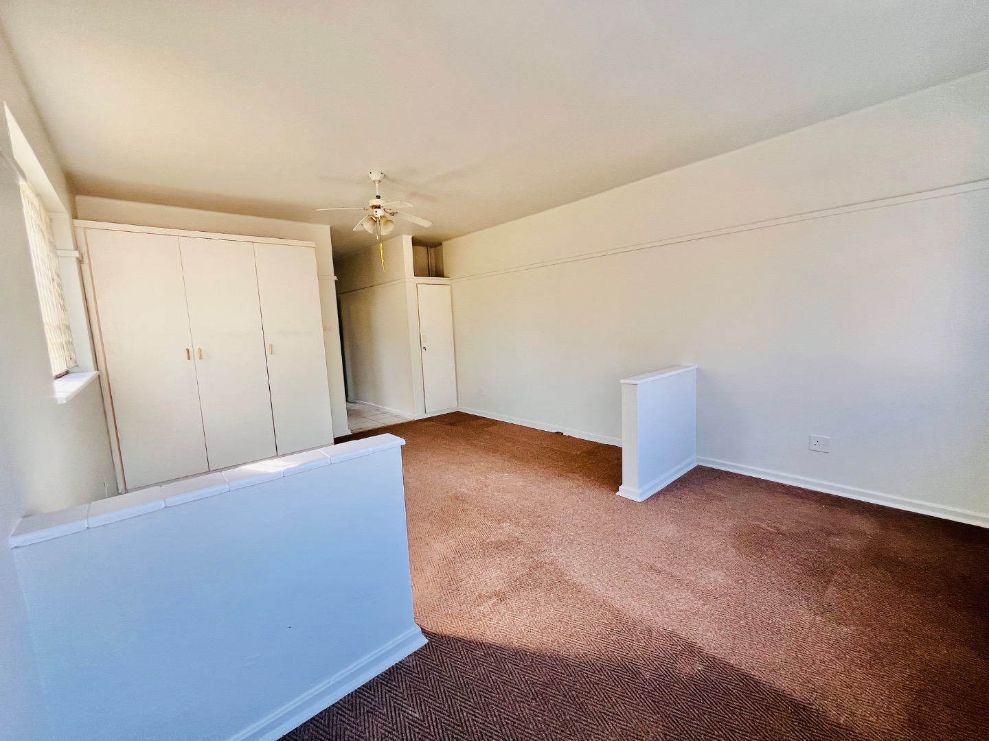 The apartment is filled with light, it has a separate kitchen, and the extensive adjacent room with built-in cupboards can be utilised as a bedroom or lounge. The extended section of the room is separated by a low wall and is spacious enough for a double/queen-size bed or a cosy lounge area.