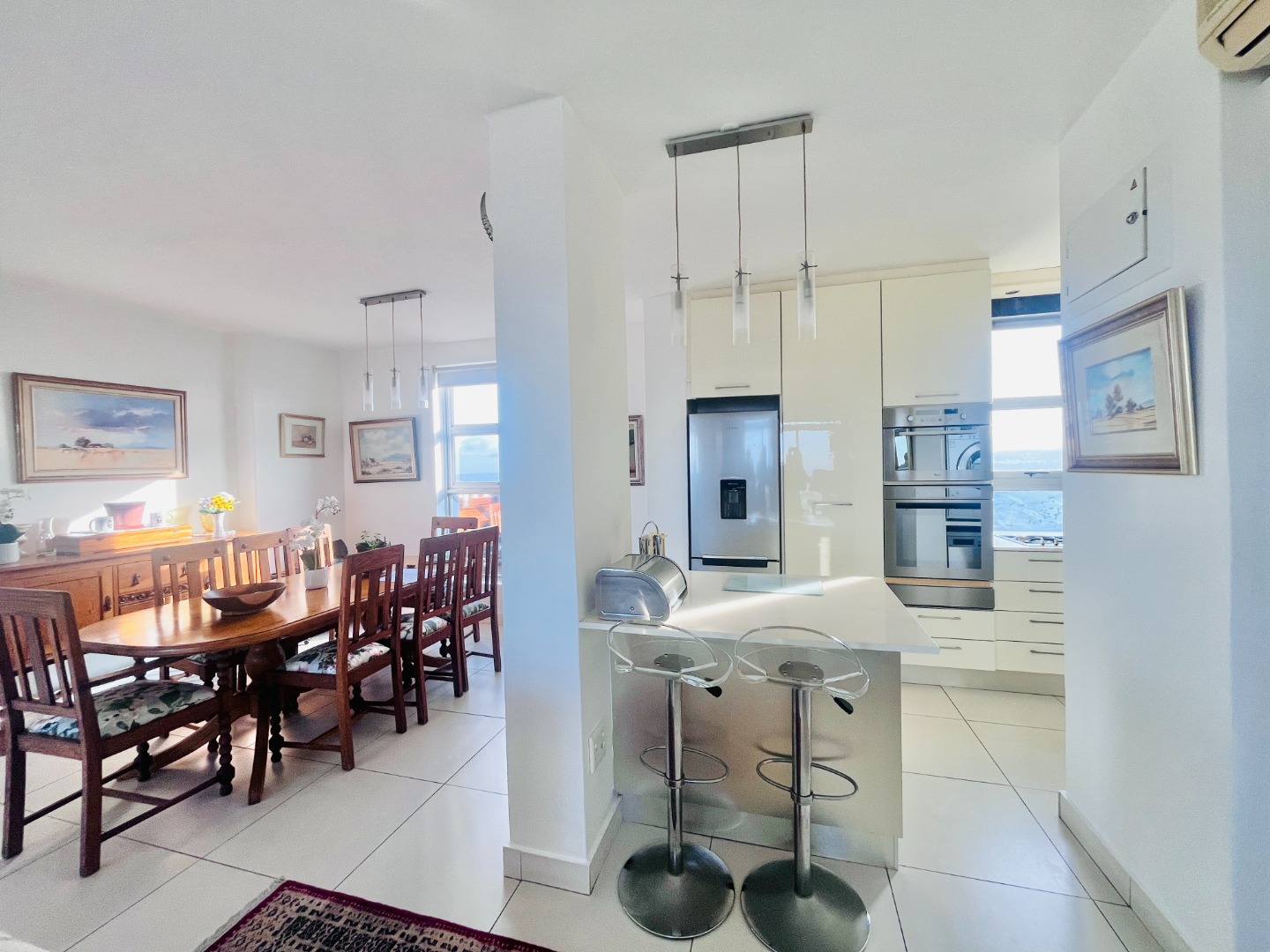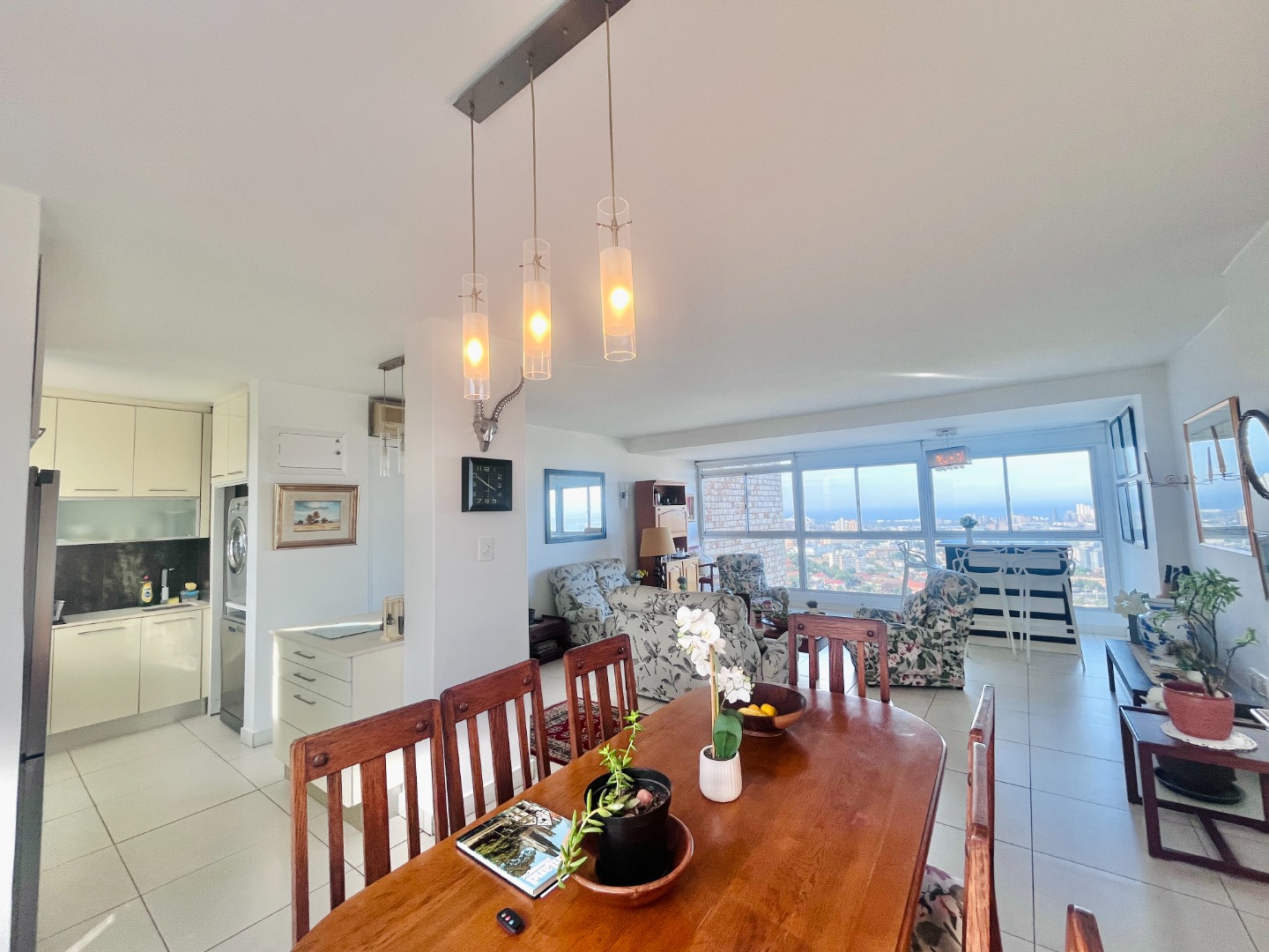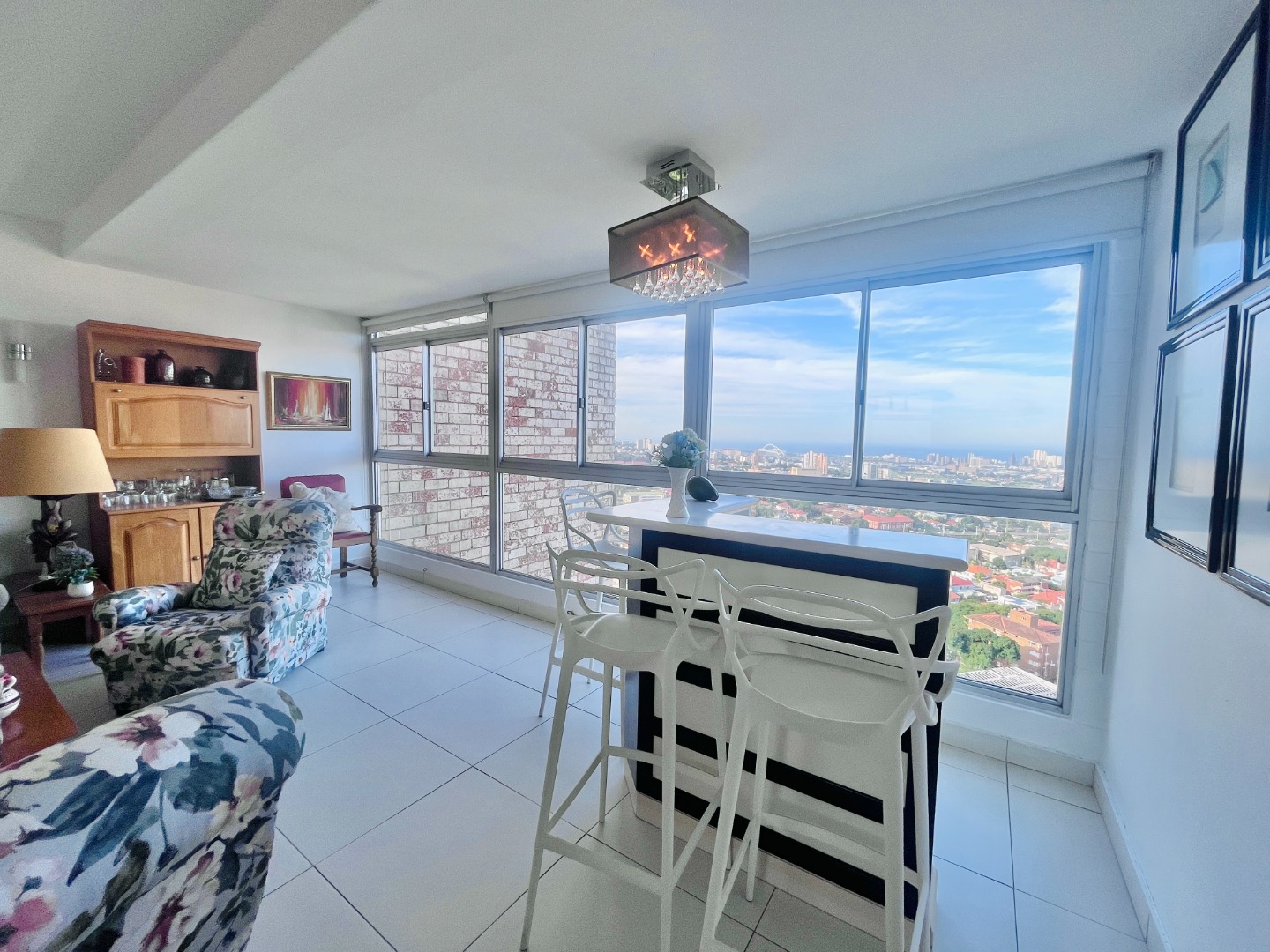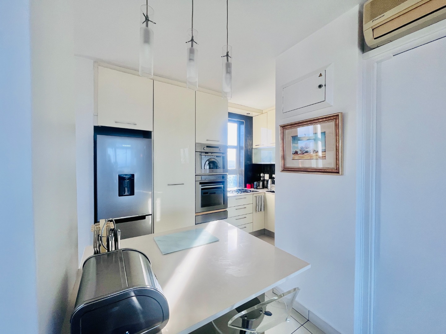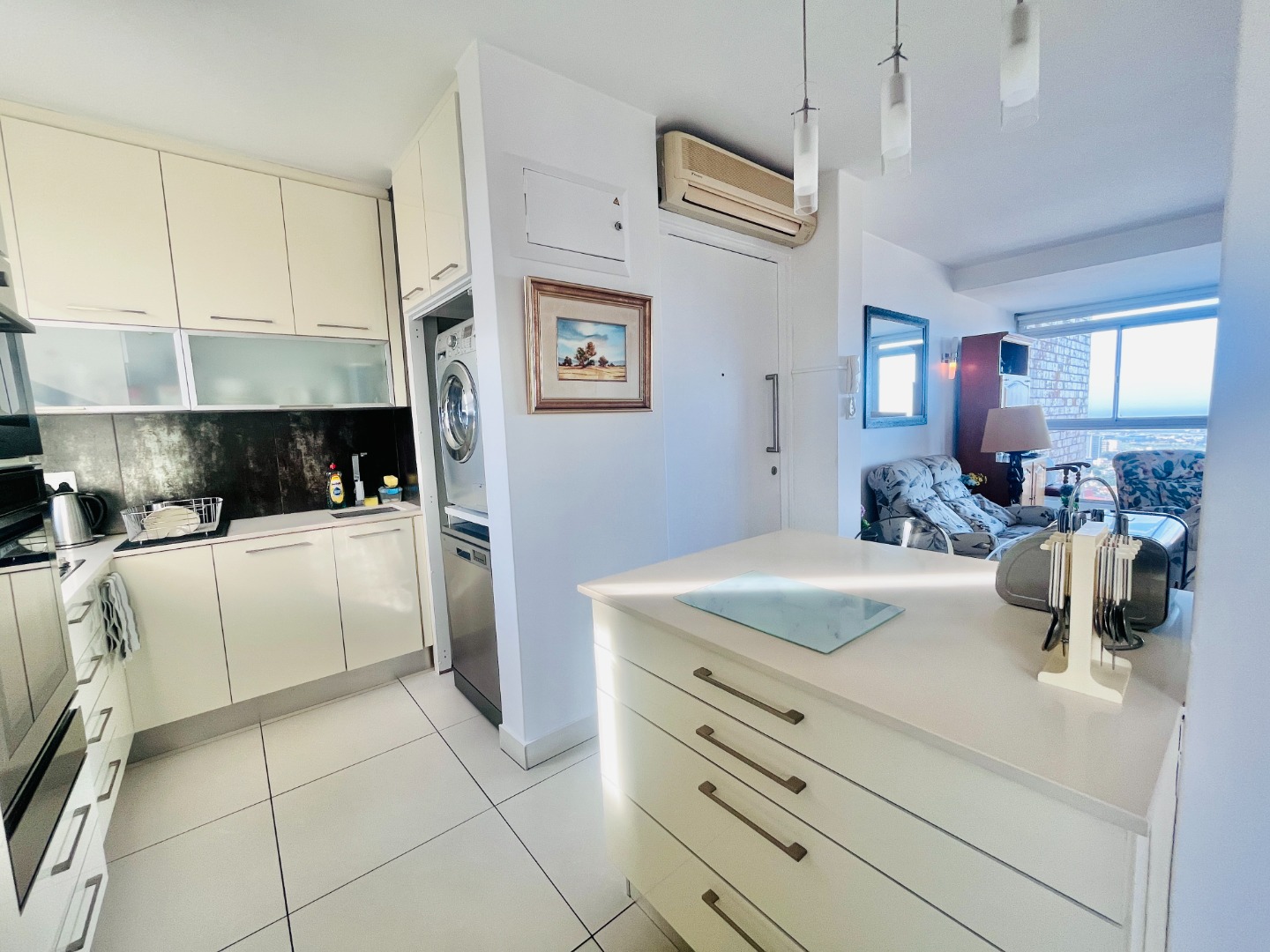 Open-plan kitchen with ample cupboard space flows into a light-filled living area, where the views take centre stage. Air-conditioned, with sleek finishes, sliding windows and blinds throughout for a clean, minimalist feel.