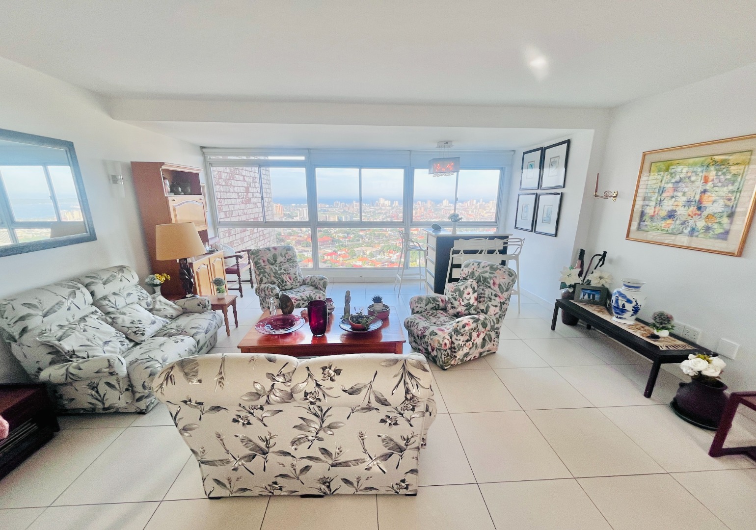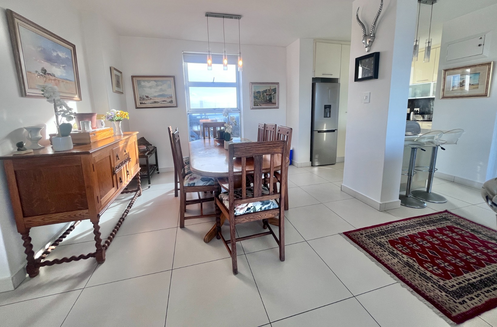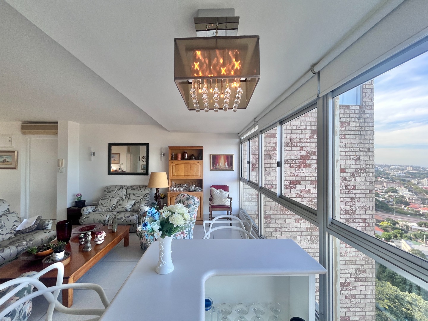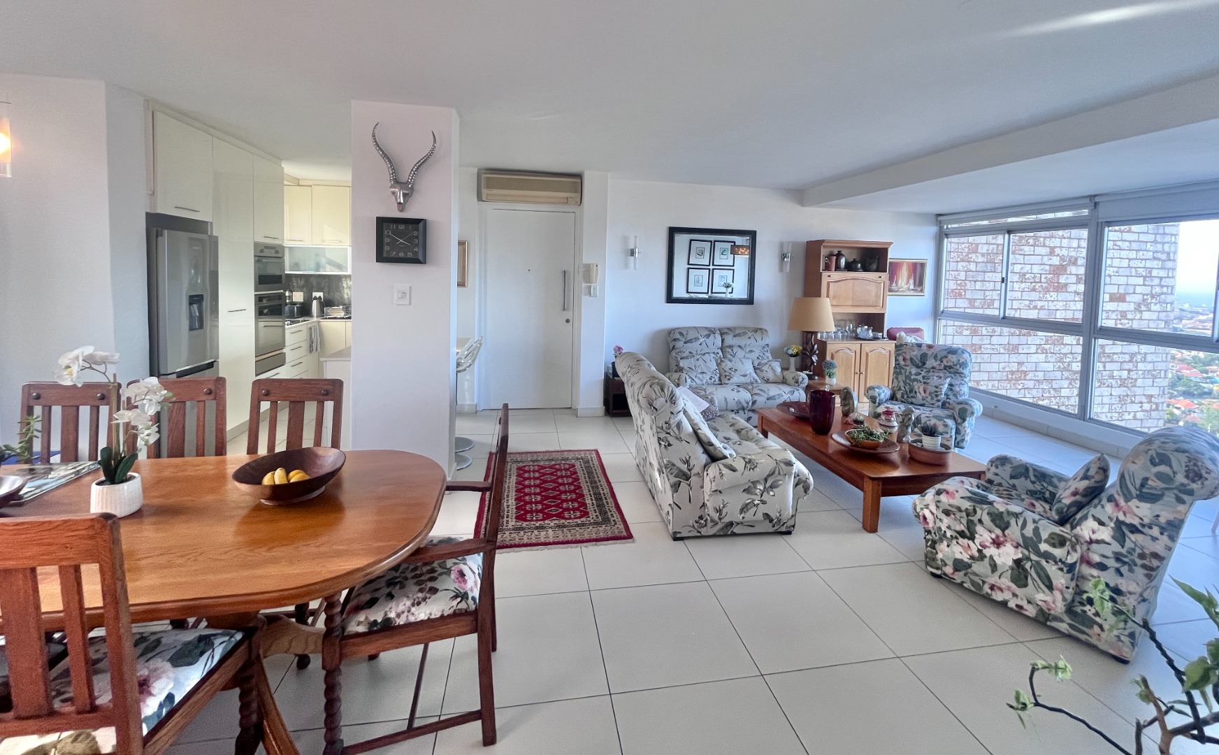 Open-plan kitchen with ample cupboard space flows into a light-filled living area, where the views take centre stage. Air-conditioned, with sleek finishes, sliding windows and blinds throughout for a clean, minimalist feel.