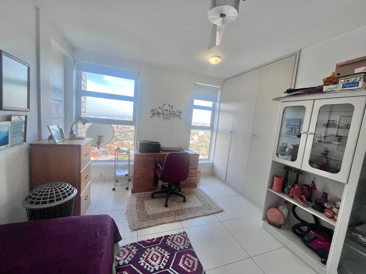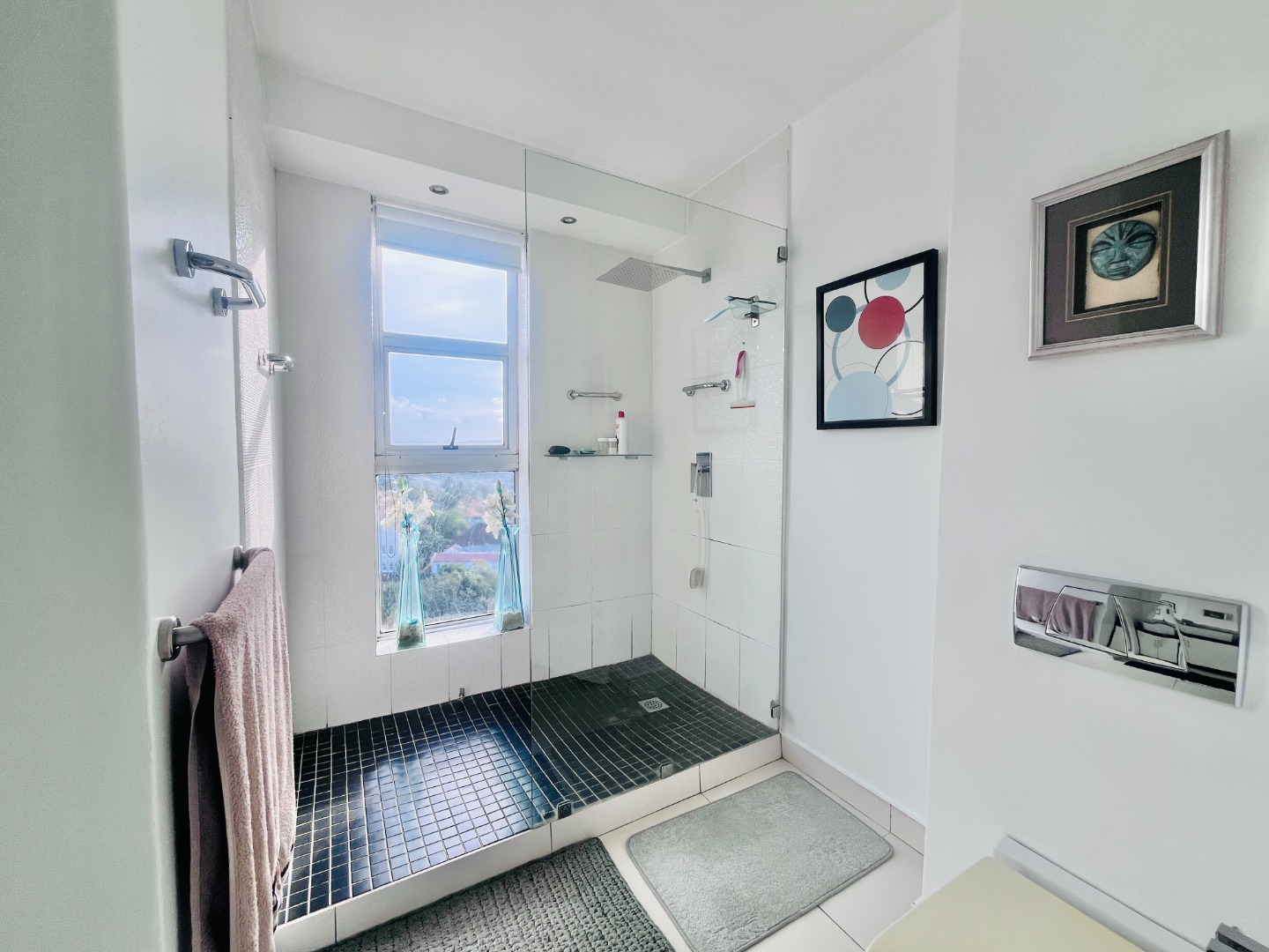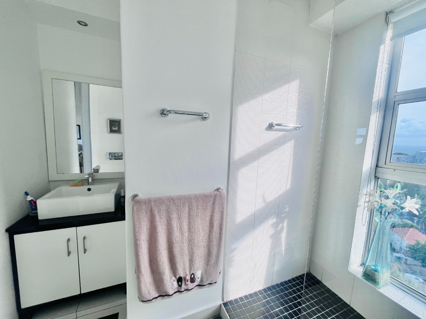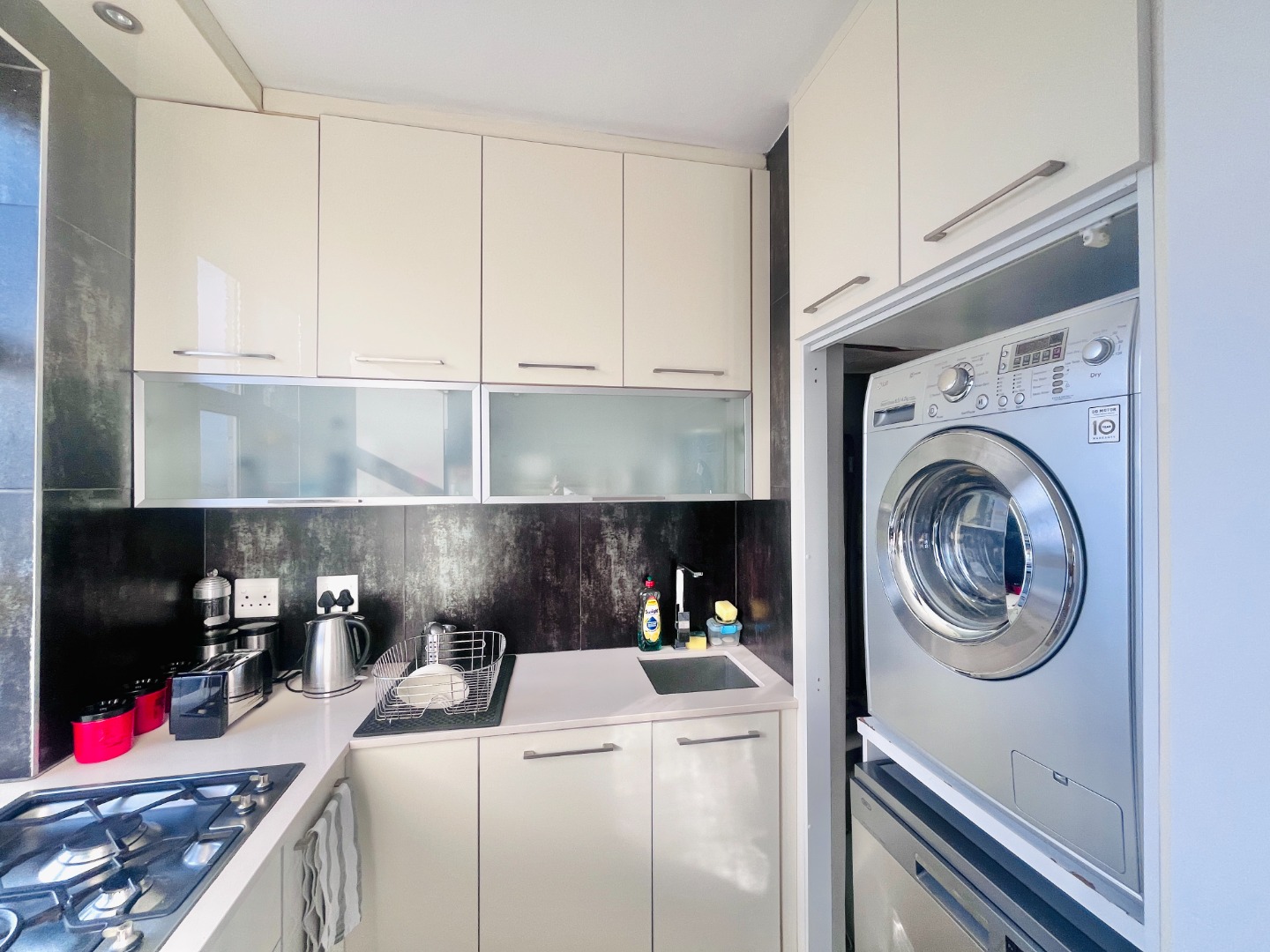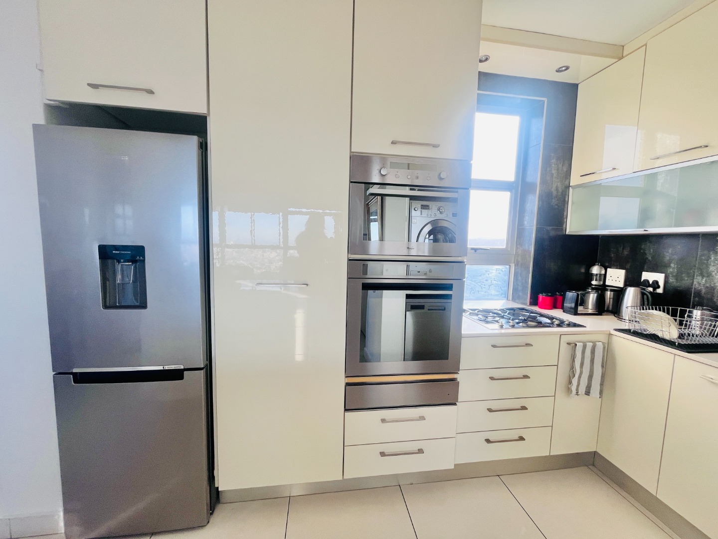 Open-plan kitchen with ample cupboard space flows into a light-filled living area, where the views take centre stage. Air-conditioned, with sleek finishes, sliding windows and blinds throughout for a clean, minimalist feel.